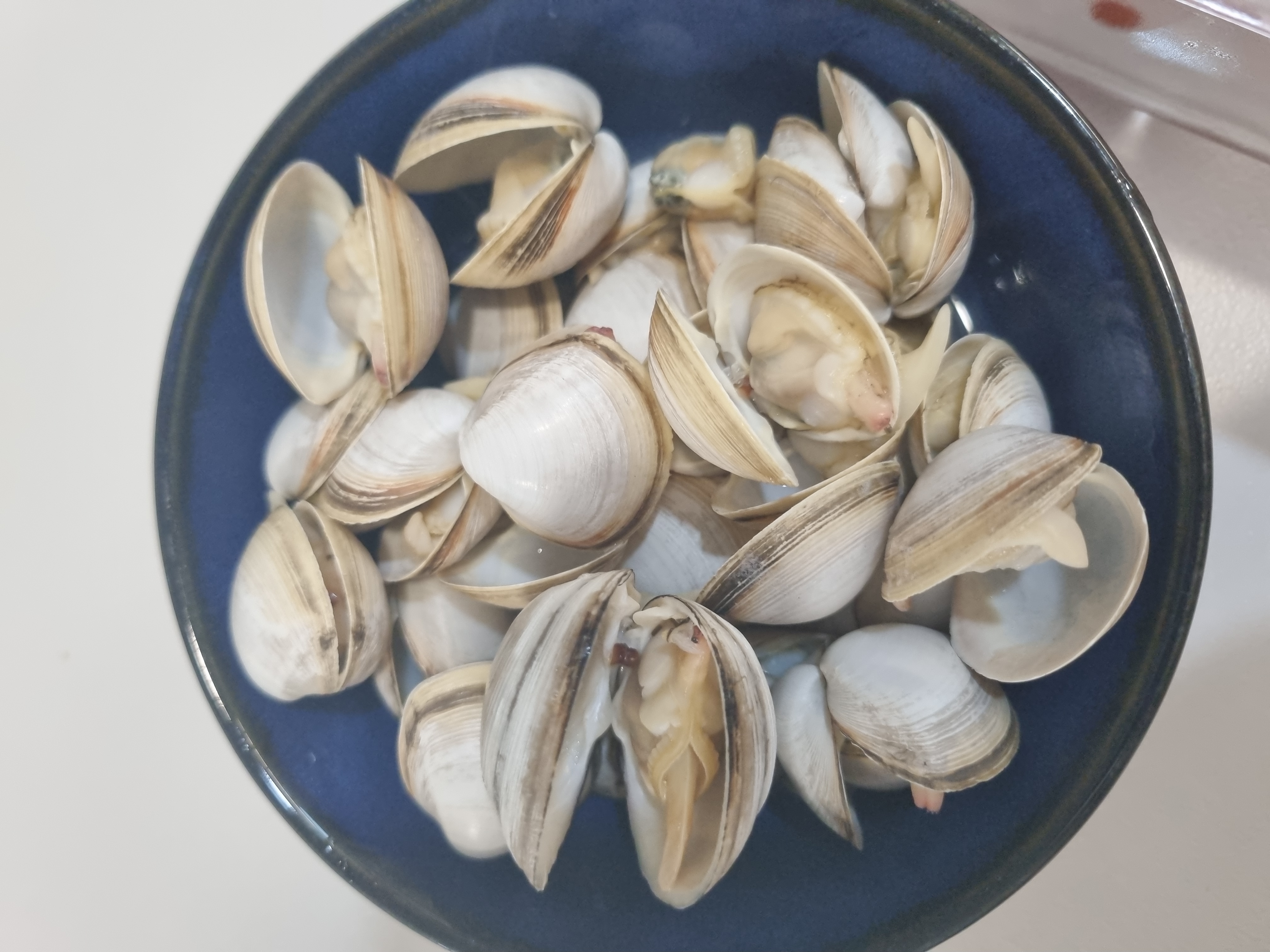 다음날 갯벌동죽 해감에 성공했는지 보려고 씻어서 한소끔 끓여봅니다. 이 친구들은 아직입니다. 잘근잘근 씹히는 게 때론 있네요. 똥 따고 먹었습니다.
