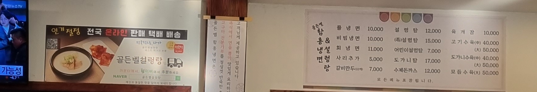 메뉴는 물냉면, 비빔냉면, 회냉면, 도가니탕, 어린이설렁탕, 특설렁탕, 수제돈가스, 고기수육, 도가니수육, 모듬수육 등 저희가 주문한 것보다 다양합니다.