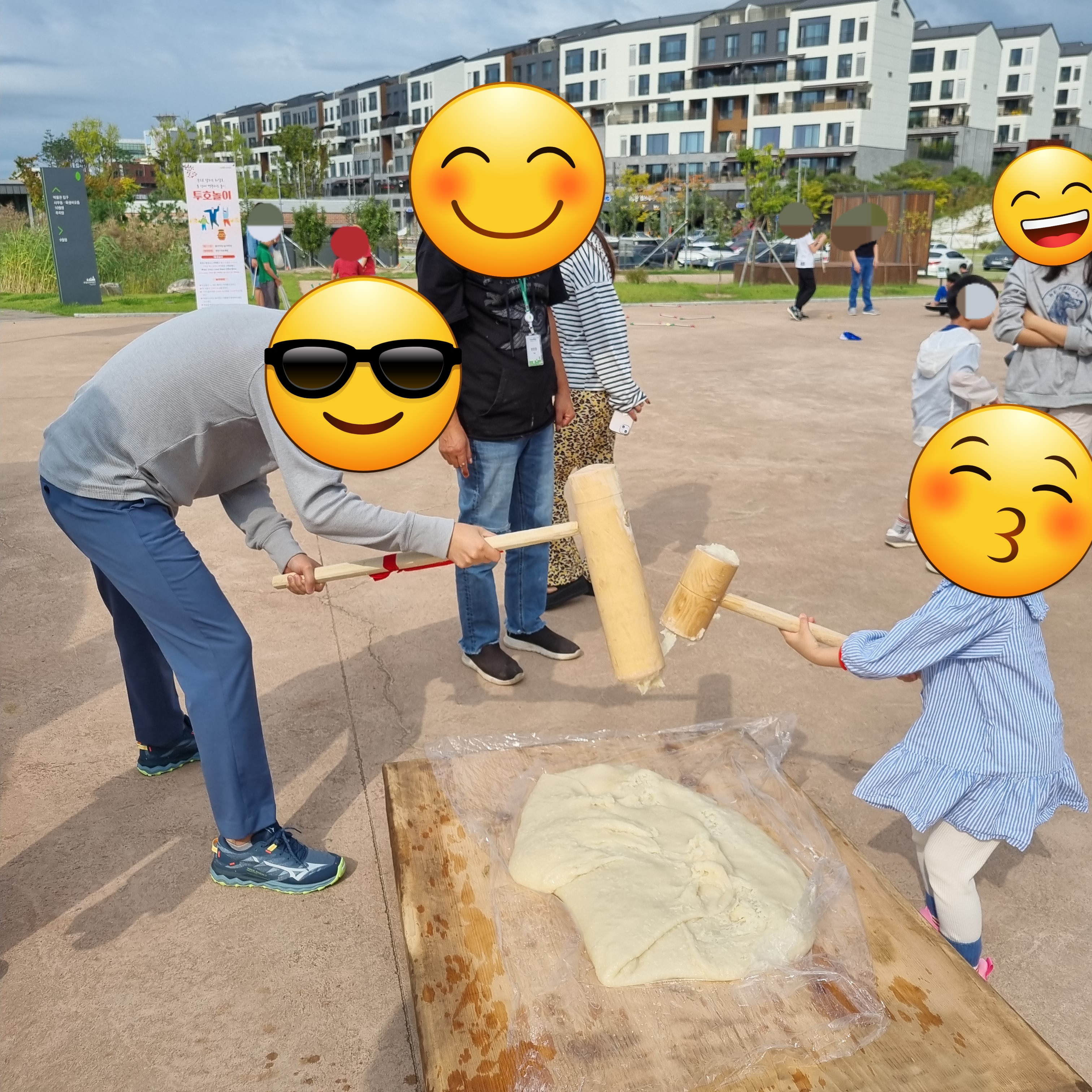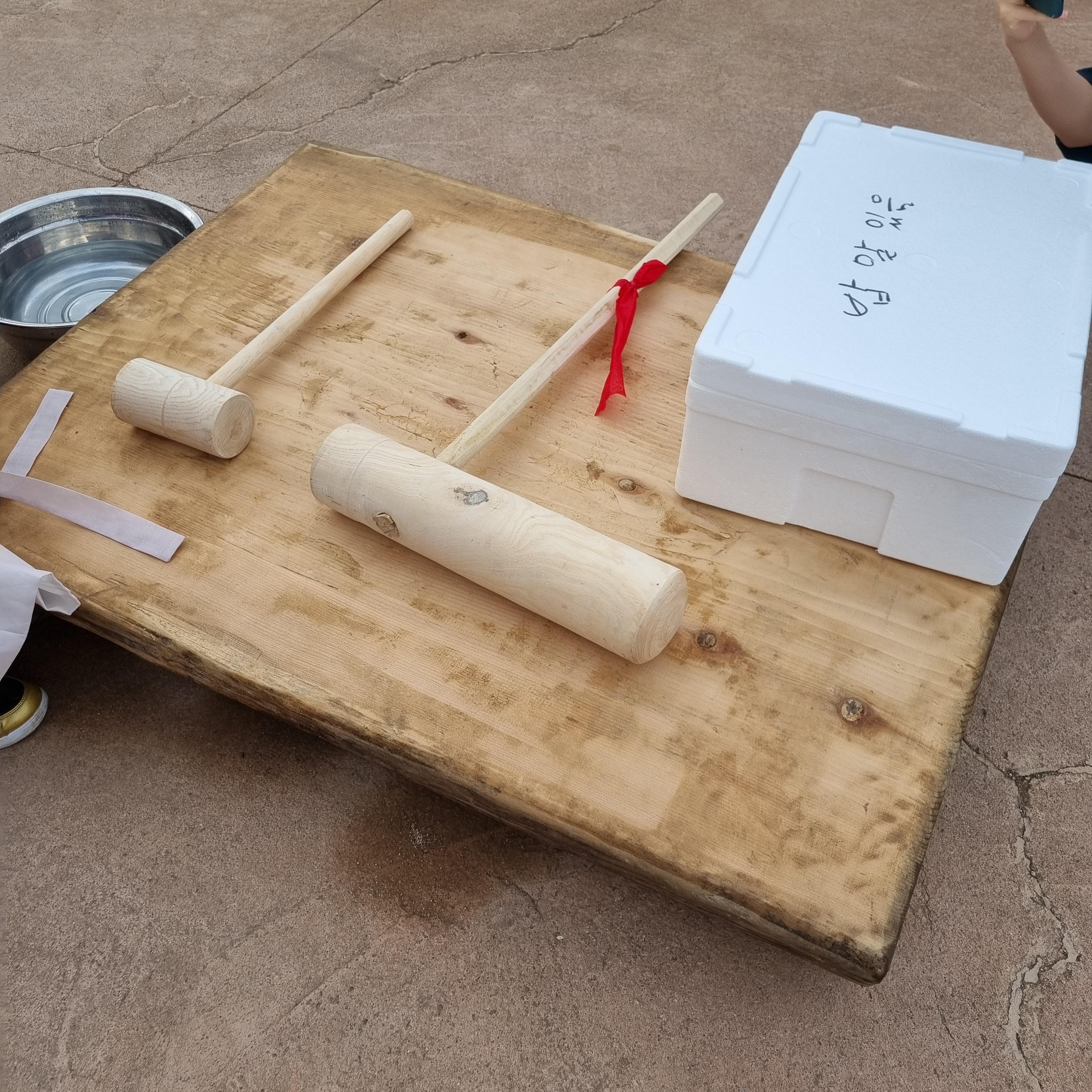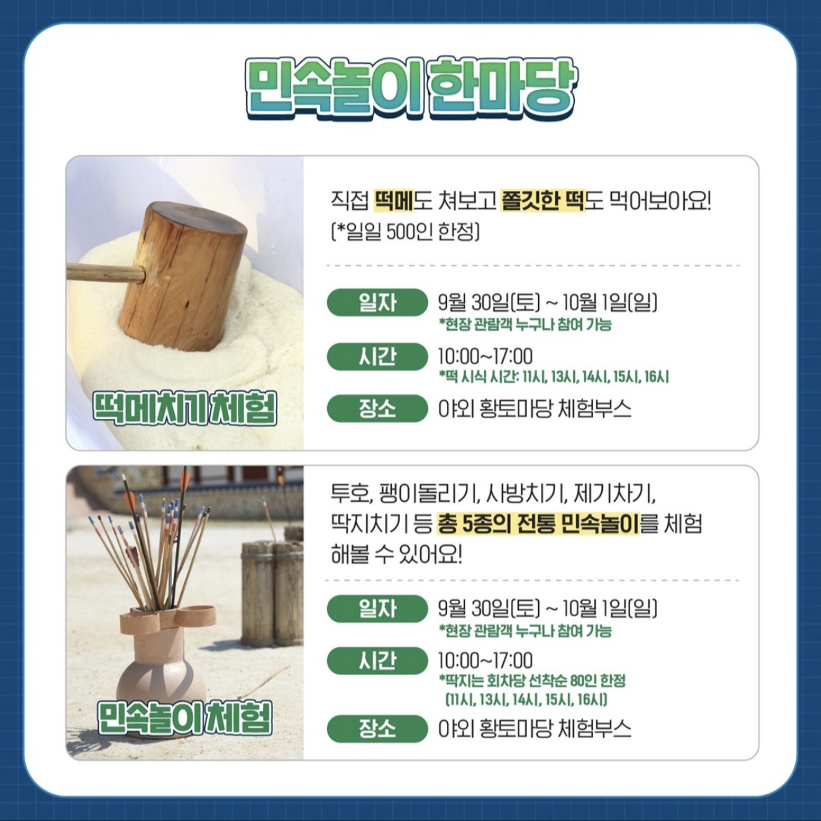 떡메치기는 줄 서서 체험했어요. 민속놀이 체험은 마당에서 자유롭게 가능했어요.