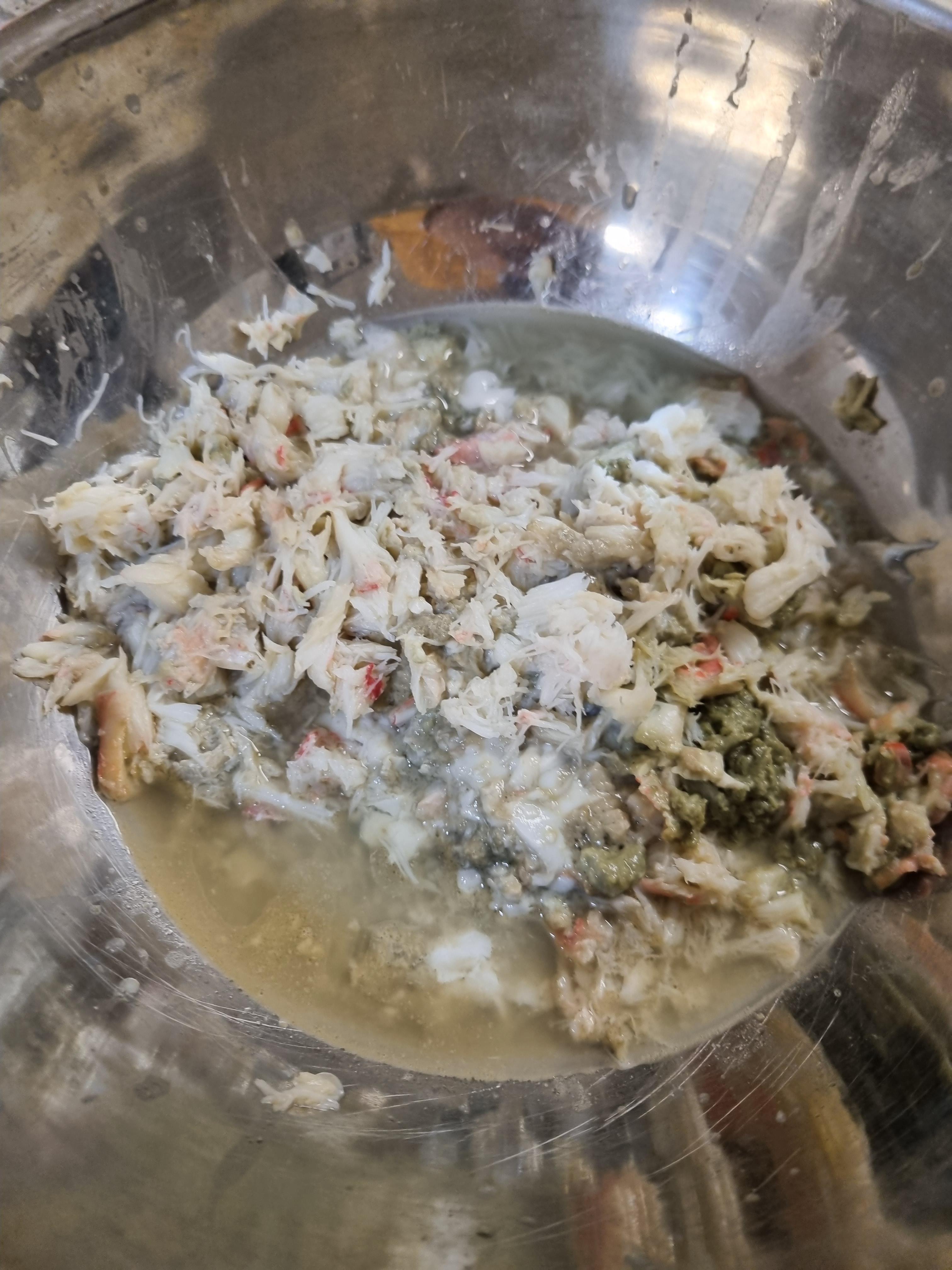 게딱지와 몸통을 분리해 봅니다. 딱지에 붙은 내장과 몸통 사이에 있는 내장을 모아서 담아주세요. 홍게 내장과 발라낸 살을 모아 홍게비빔밥이나 홍게주먹밥에 사용합니다.
