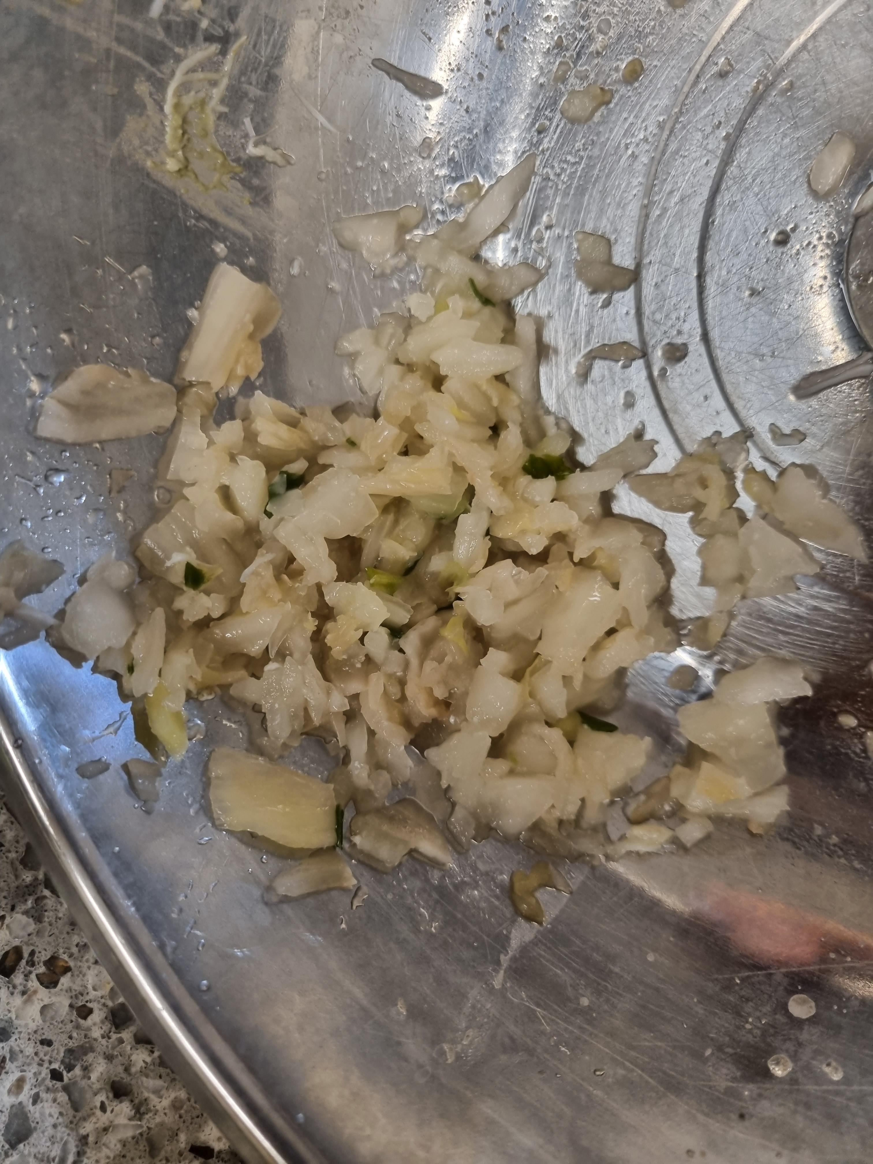 아까 모아둔 살과 내장을 섞어 비벼줍니다. 너무 짜면 안 되니 봐가면서 넣어주세요. 참기름을 두르고 비벼줍니다.