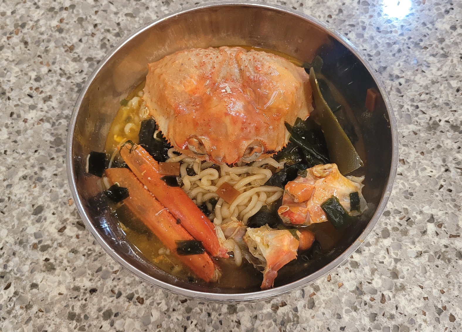 준비물은 너구리라면, 잘게 부순 미역이에요. 잘게 자른 미역을 넣고 끓이면 더 맛있으니 홍게라면 꿀팁은 자른 미역입니다. 라면은 2 봉지만 끓여서 어른 넷이 나눠먹었어요. 홍게비빔밥도 있으니까요.
