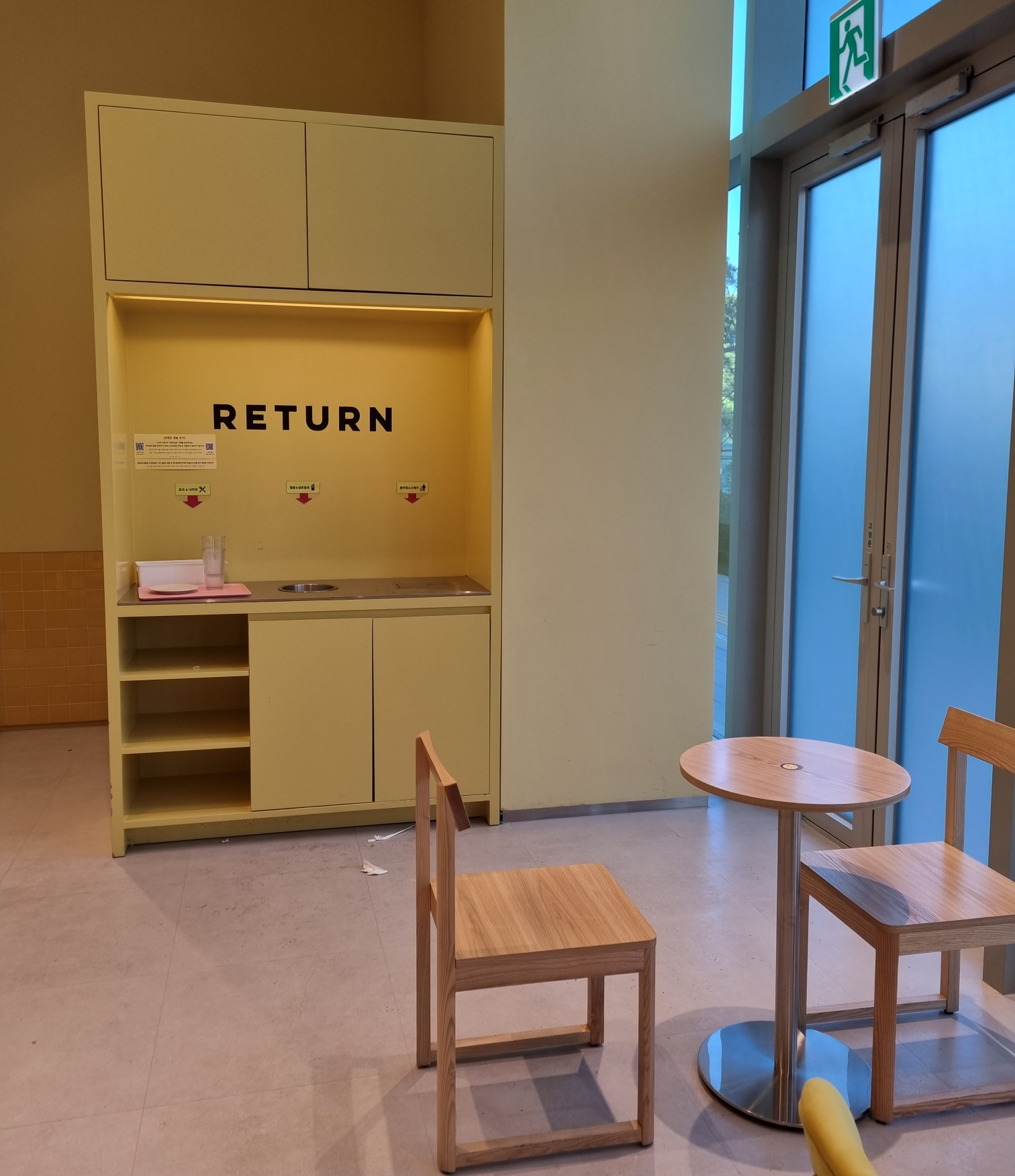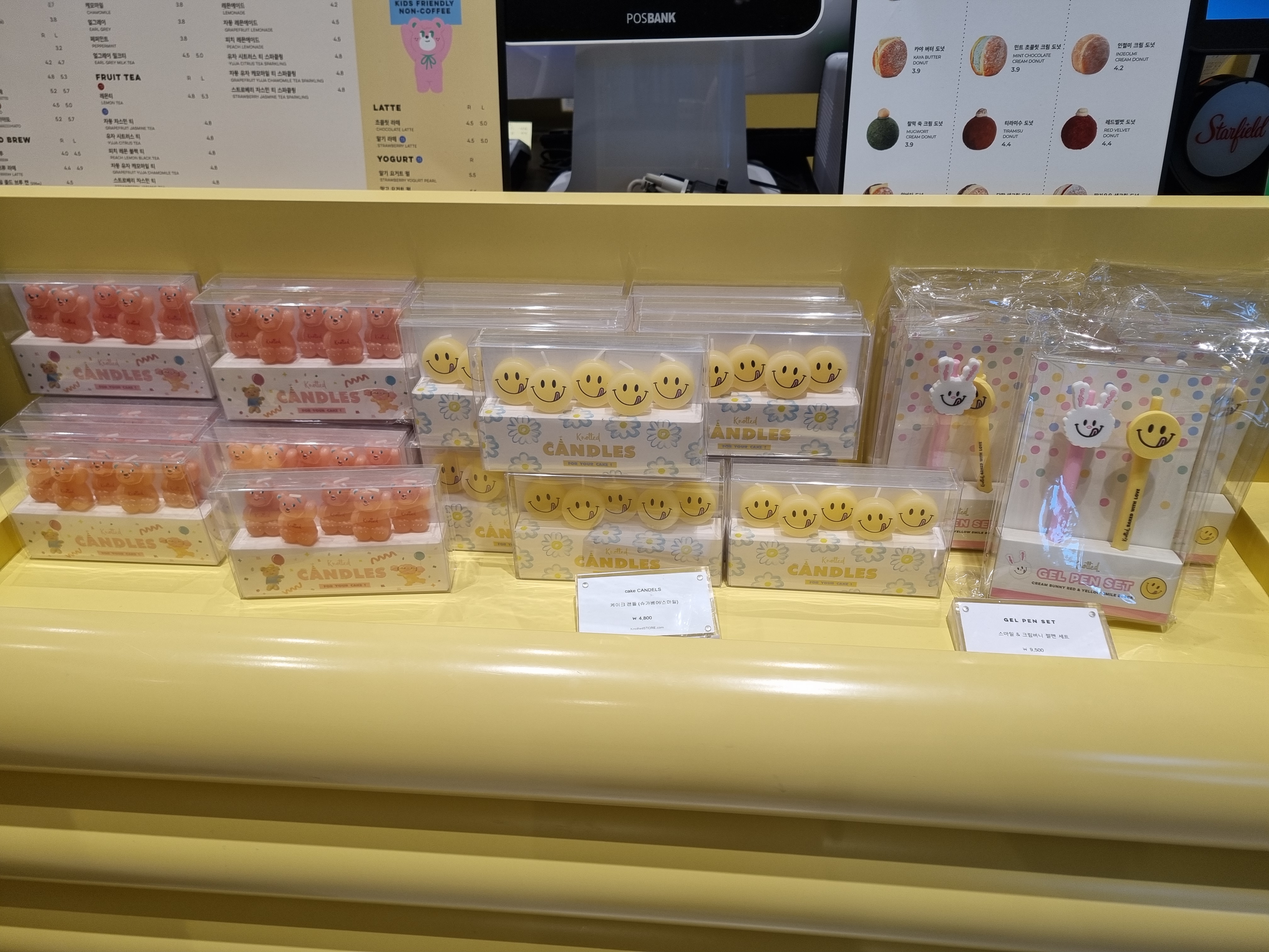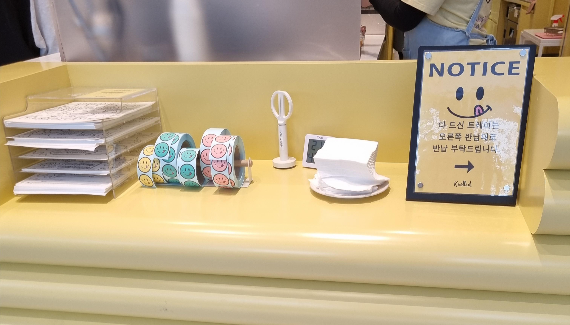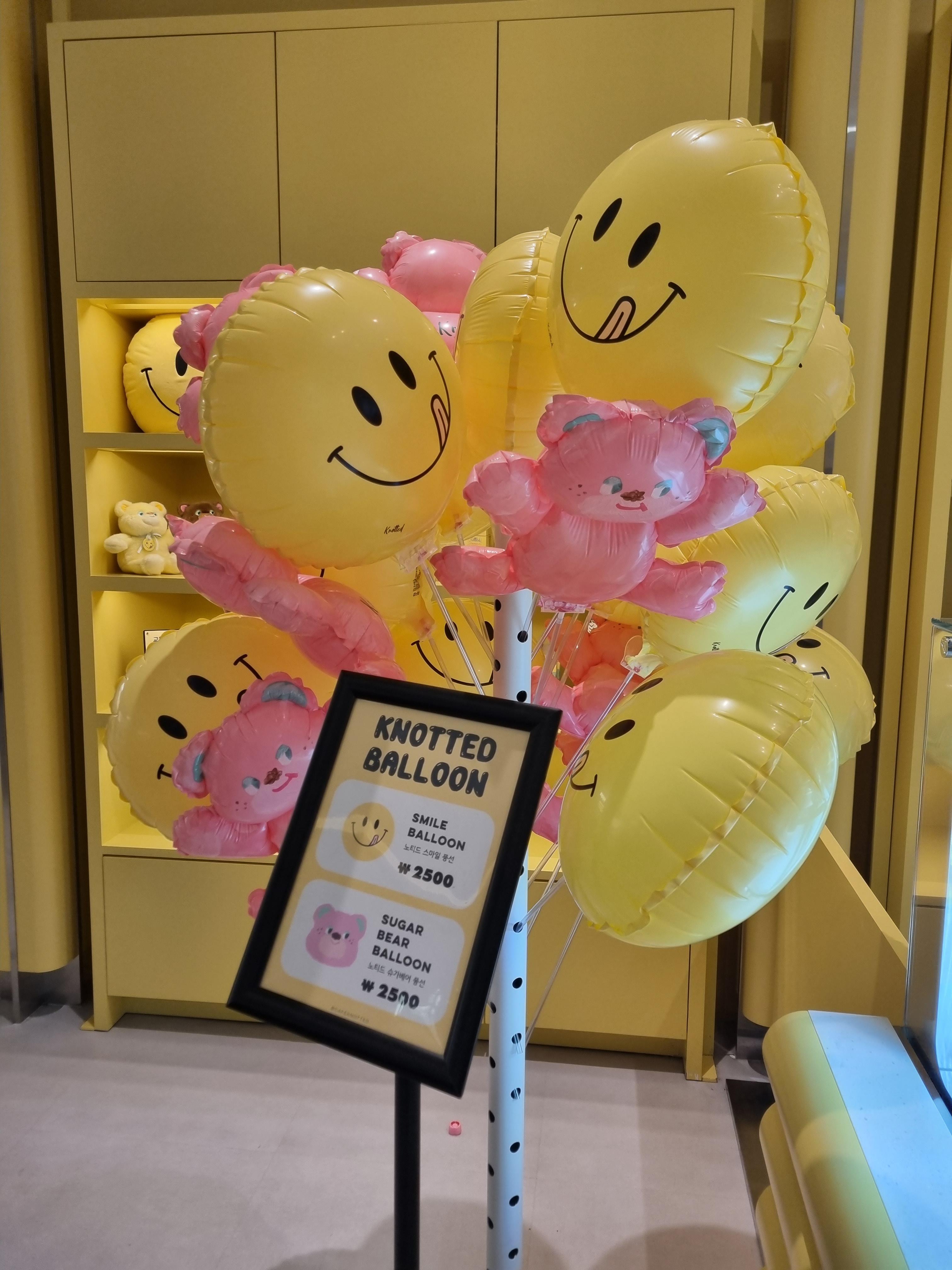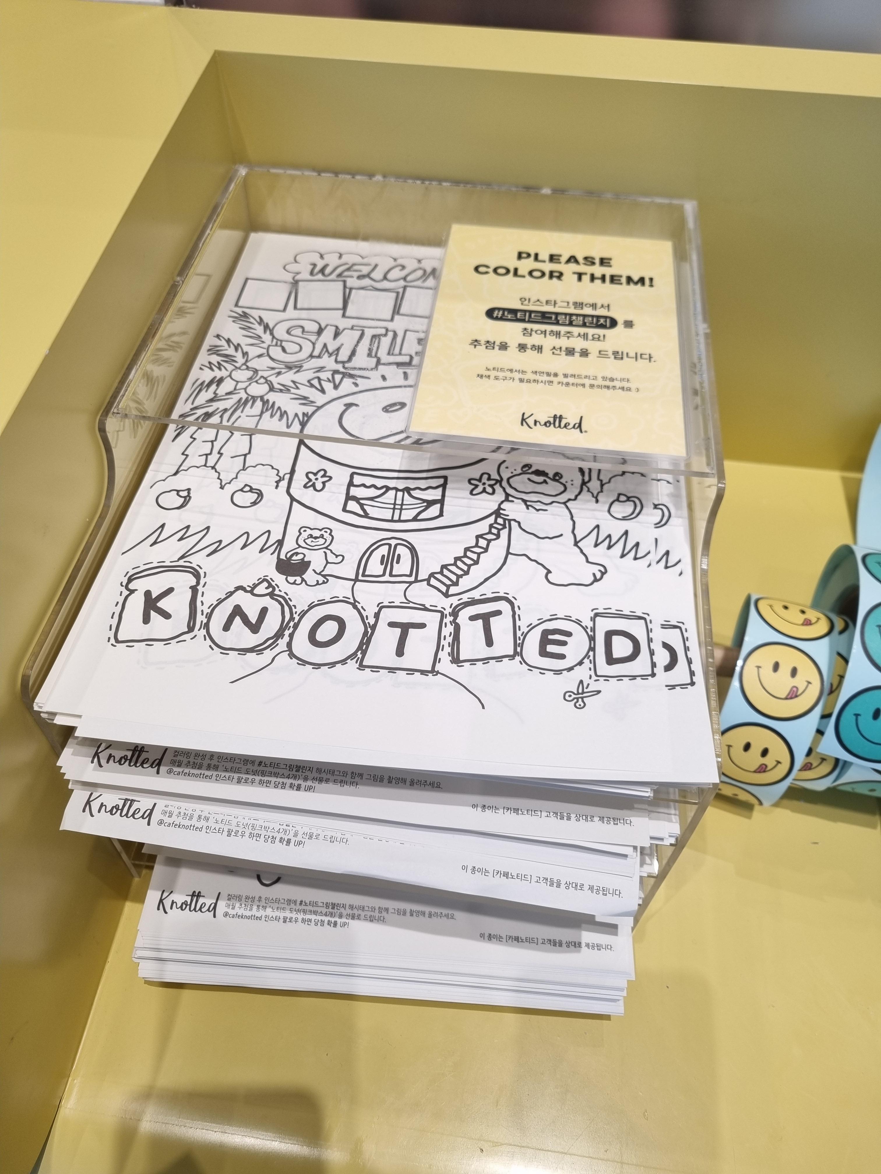 입구에는 풍선, 케이크 캔들, 젤펜 센트를 판매해요. 풍선과 케이크 캔들은 스마일이랑 슈가베어로 종류가 나뉘고요. 하나씩 쟁이고 싶은 아이템입니다. 반납대 근처에는 스마일 스티커와 '#노티드그림챌린지'에 참여할 때 필요한 종이가 놓여 있어요. 그림이 아기자기하고 예쁘네요. 인스타그램에서 #노티드그림챌린지에 참여하면 추첨을 통해 노티드 도넛(핑크박스 4개)을 선물로 준다고 해요.
