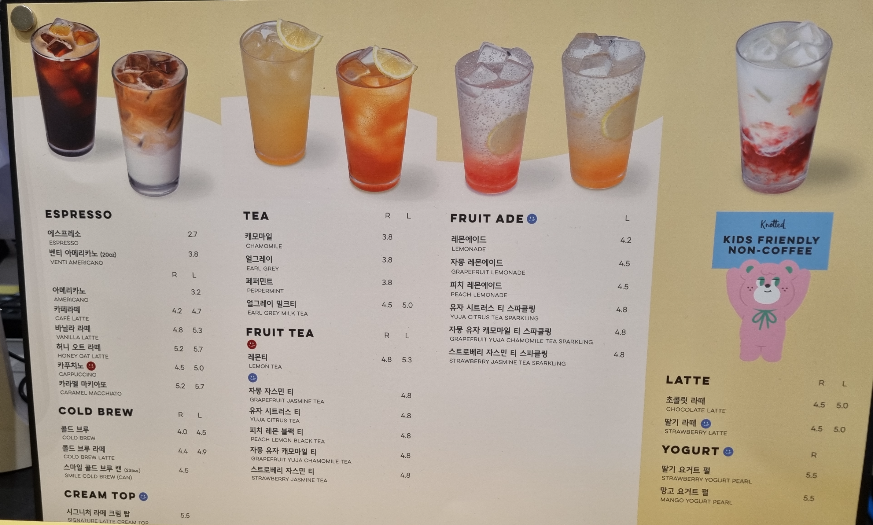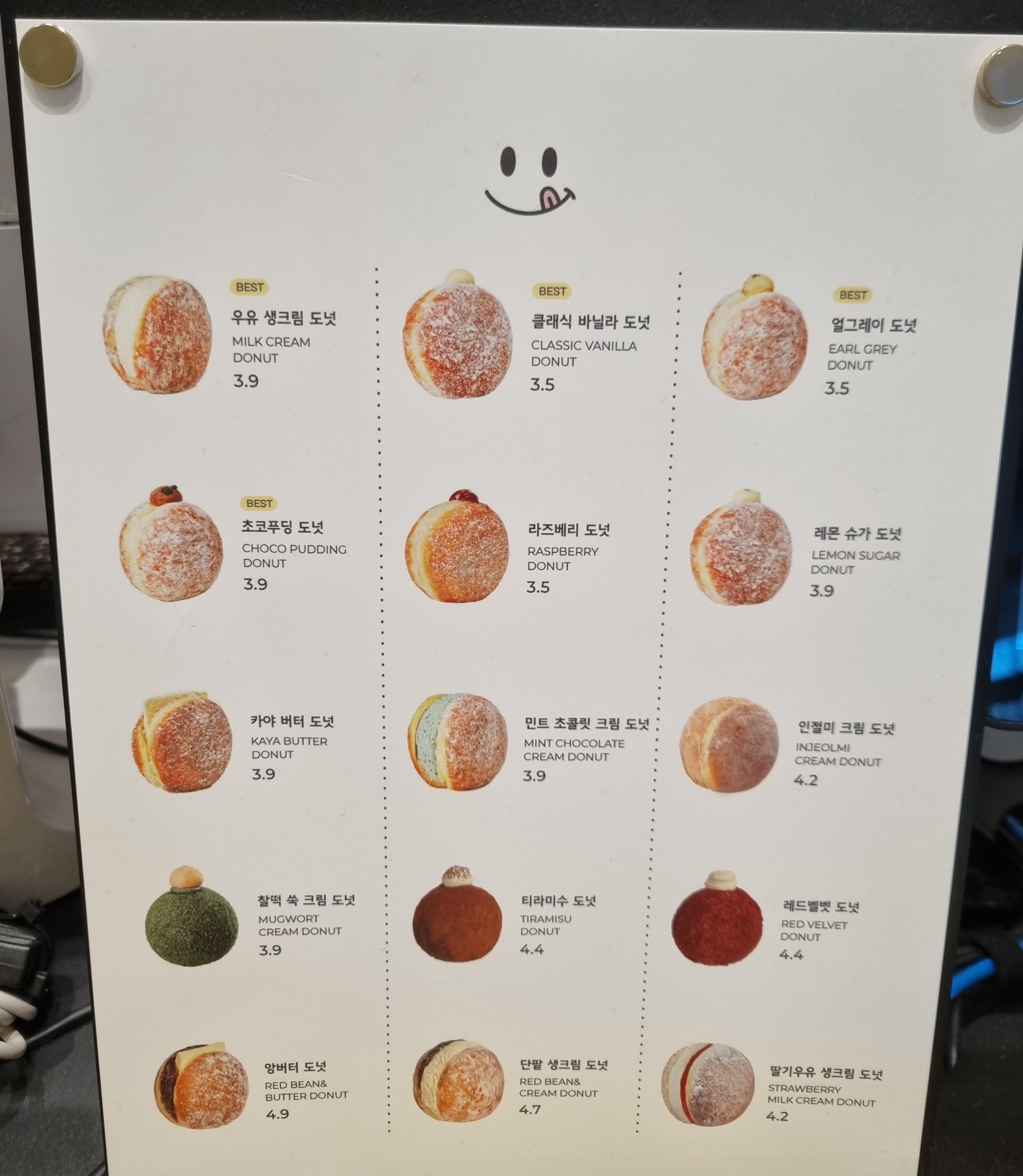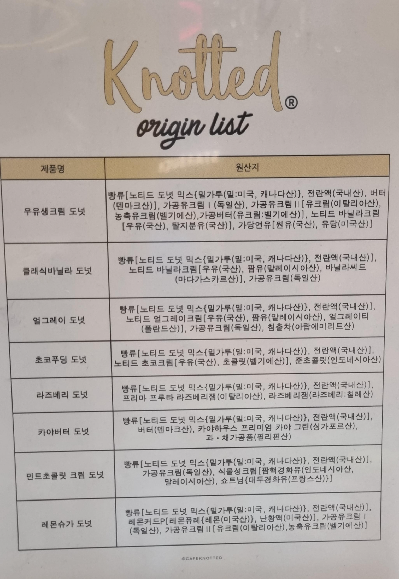 그리고 기본인 우유 생크림 도넛이 가장 맛있는 것 같아요. 노티드에서는 커피를 비롯하여 티, 과일 에이드까지 다양한 음료도 판매하네요. 도넛과 음료는 메뉴판을 찍은 사진으로 대신합니다. 도넛의 원산지 정보도 참고해 주세요.