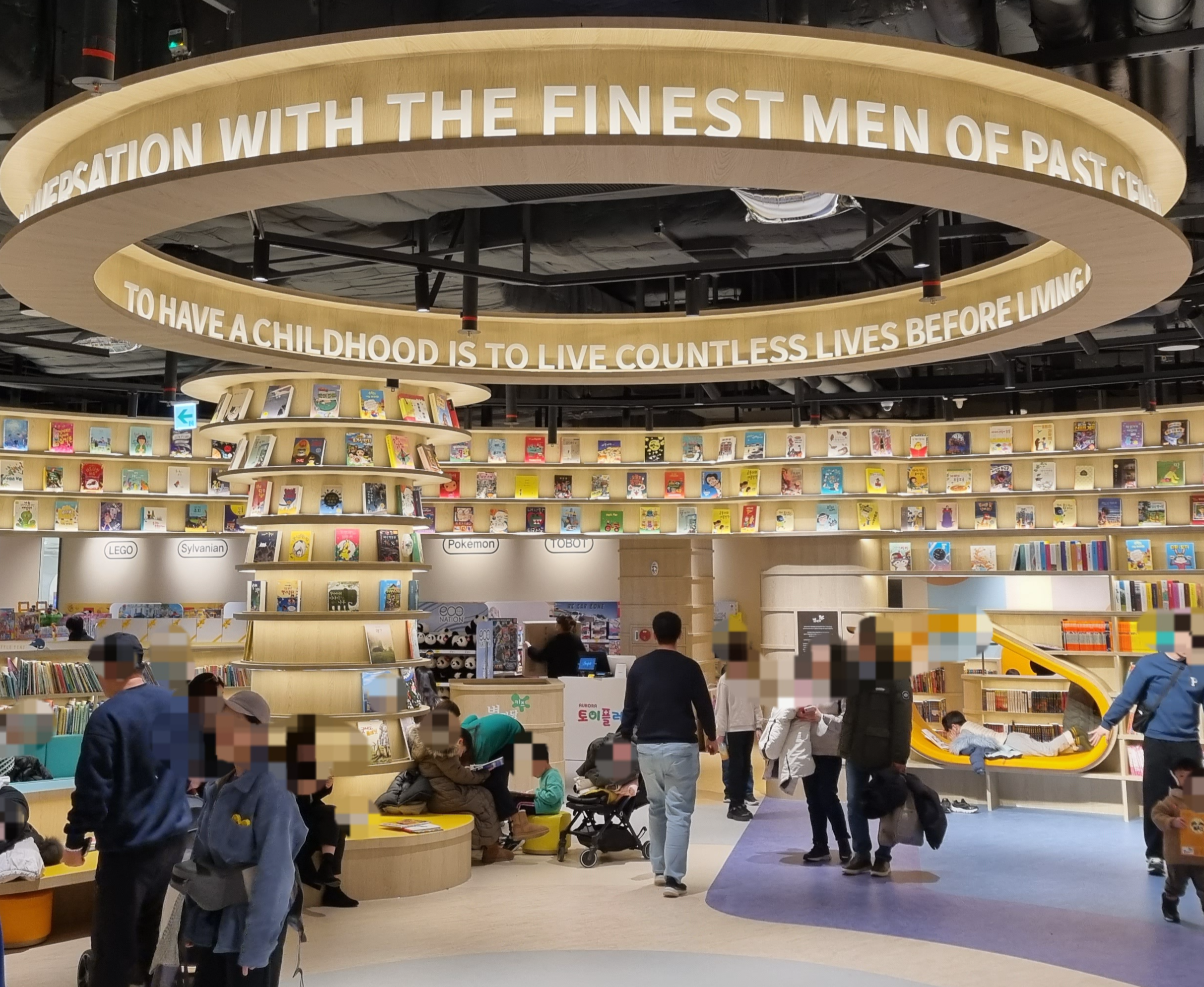 공연 시간을 제외한 시간에는 별마당키즈에서 자유롭게 책을 읽을 수 있어요. 아직 글을 읽을 수 없는 아이들은 부모님이 책을 읽어주지만 혼자 책을 읽을 수 있는 아이들은 혼자서 독서하더라고요. 공간을 다양하게 꾸며두어서 이용하기 좋더라고요.
