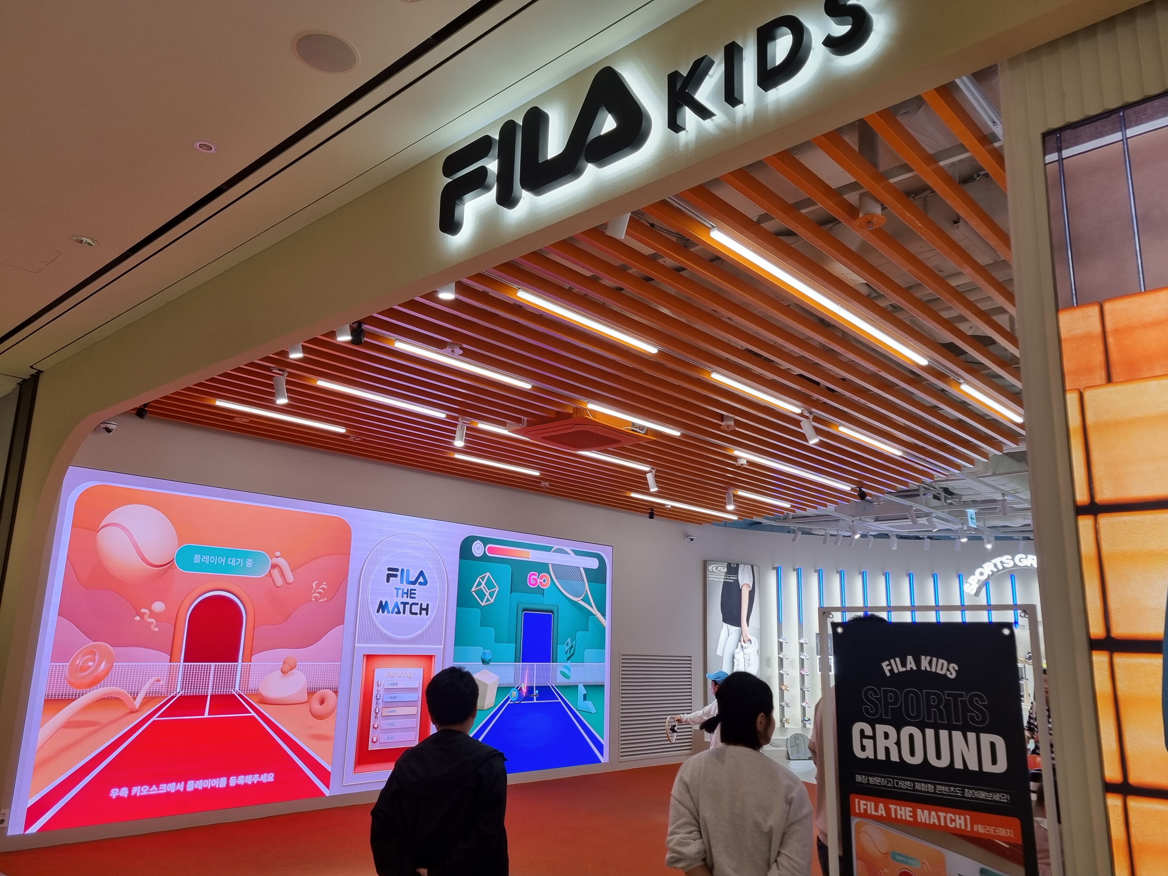 필라 키즈 매장에 VR 테니스 경기를 할 수 있는 공간이 있어요. 이곳은 체험형 메가스토어라는데 아이들이 줄 서서 기다리더라고요. 아이가 처음 해봤는데 재밌어하더라고요.