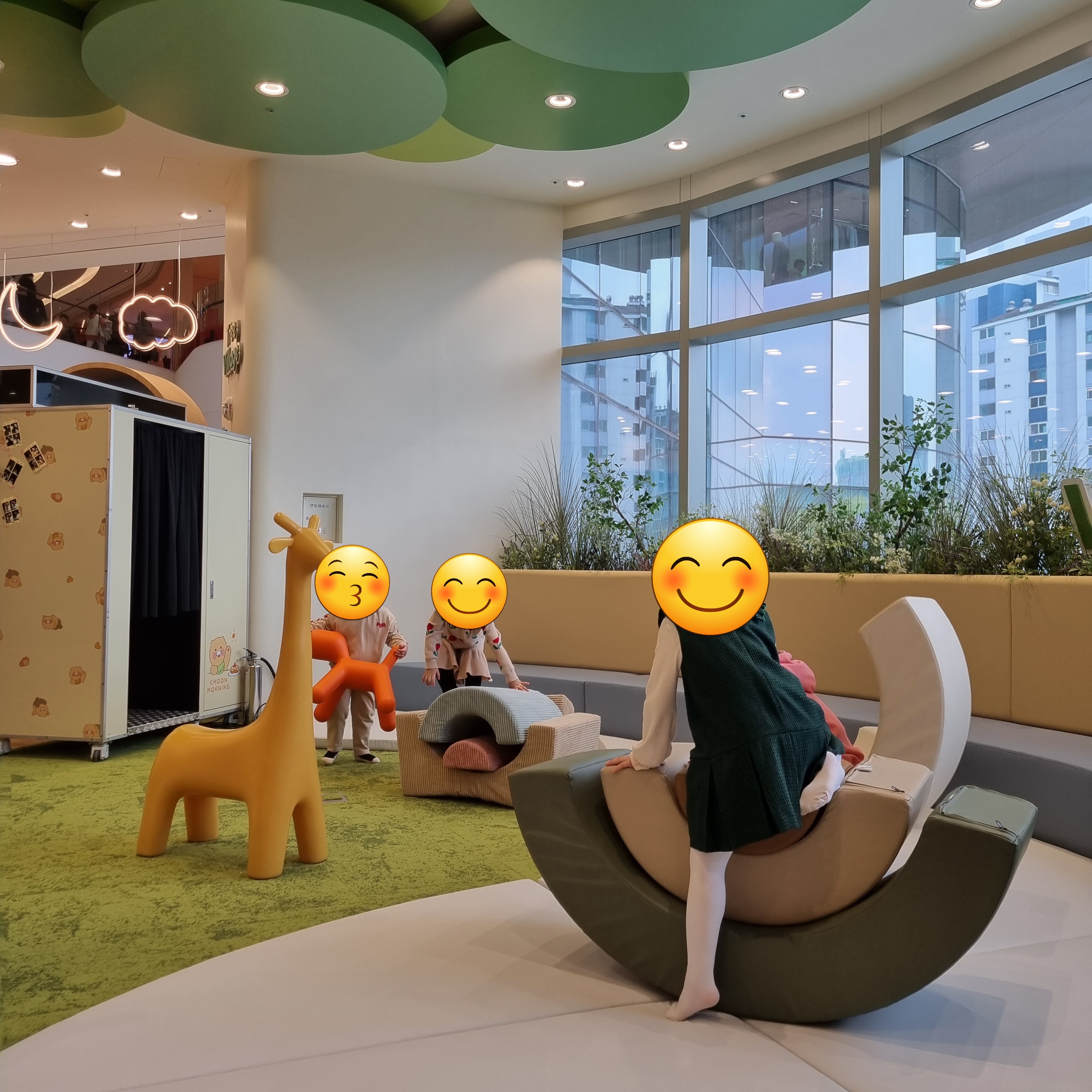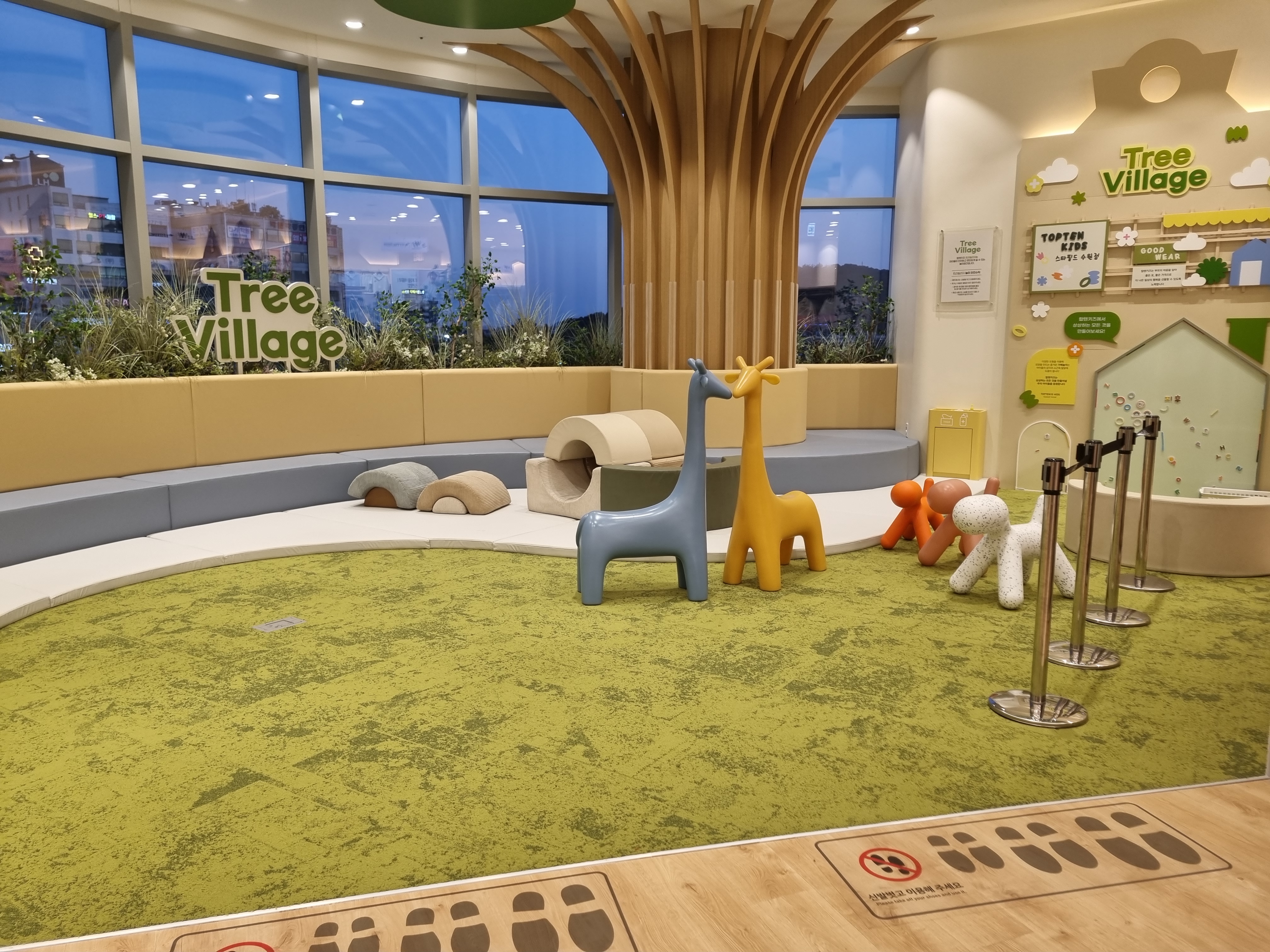탑텐매장 안에 키즈존이 있어요. 화서역이 보이는 방향인데 유리창이 있어 밝은 곳이에요. 쿠션재질의 조형물과 쿠션이 있는데 별거 없는데도 아이들은 잘 놀아요. 쇼핑하다 잠시 들러 쇼핑도 하고 어른들도 쉬기 좋더라고요.
