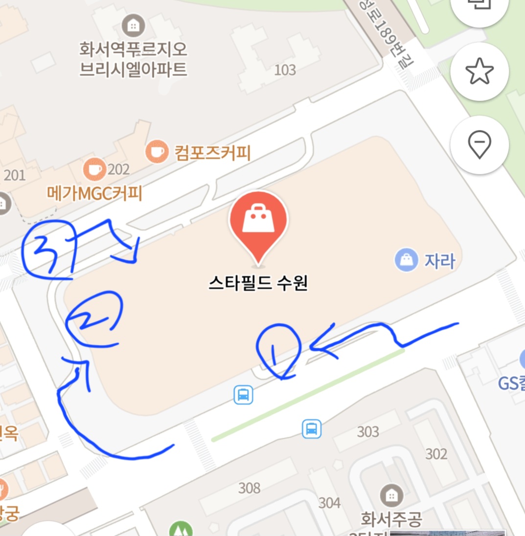 2번 입구는 먹자골목과 마주한 곳이고, 3번은 브리시엘 아파트와 마주한 곳인데, 스타필드에 도착한 위치에 따라서 가까운 곳으로 입차하시는 것을 추천합니다. 지하로 내려가는 길은 신축 건물답게 넓어서 운전이 힘들진 않습니다. 서울 도심의 백화점 주차장과는 비교가 되지 않아서 좋더라고요.