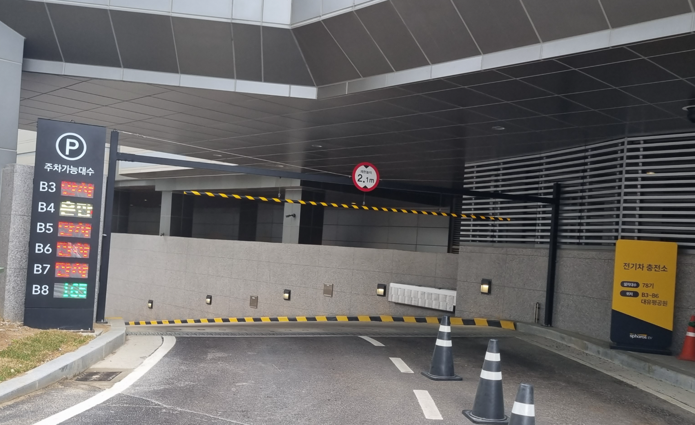 지도 캡처해서 제가 임의로 번호를 매겼는데, 오른쪽 사진은 대로변에 있는 1번 입구입니다. 이곳으로 들어가면 지하 5층까지 한 번에 내려갑니다. 저는 이곳으로 내려가는 것이 운전이 편하더라고요. 다만 지하 5층이 만차이거나 혼잡할 가능성이 커요.