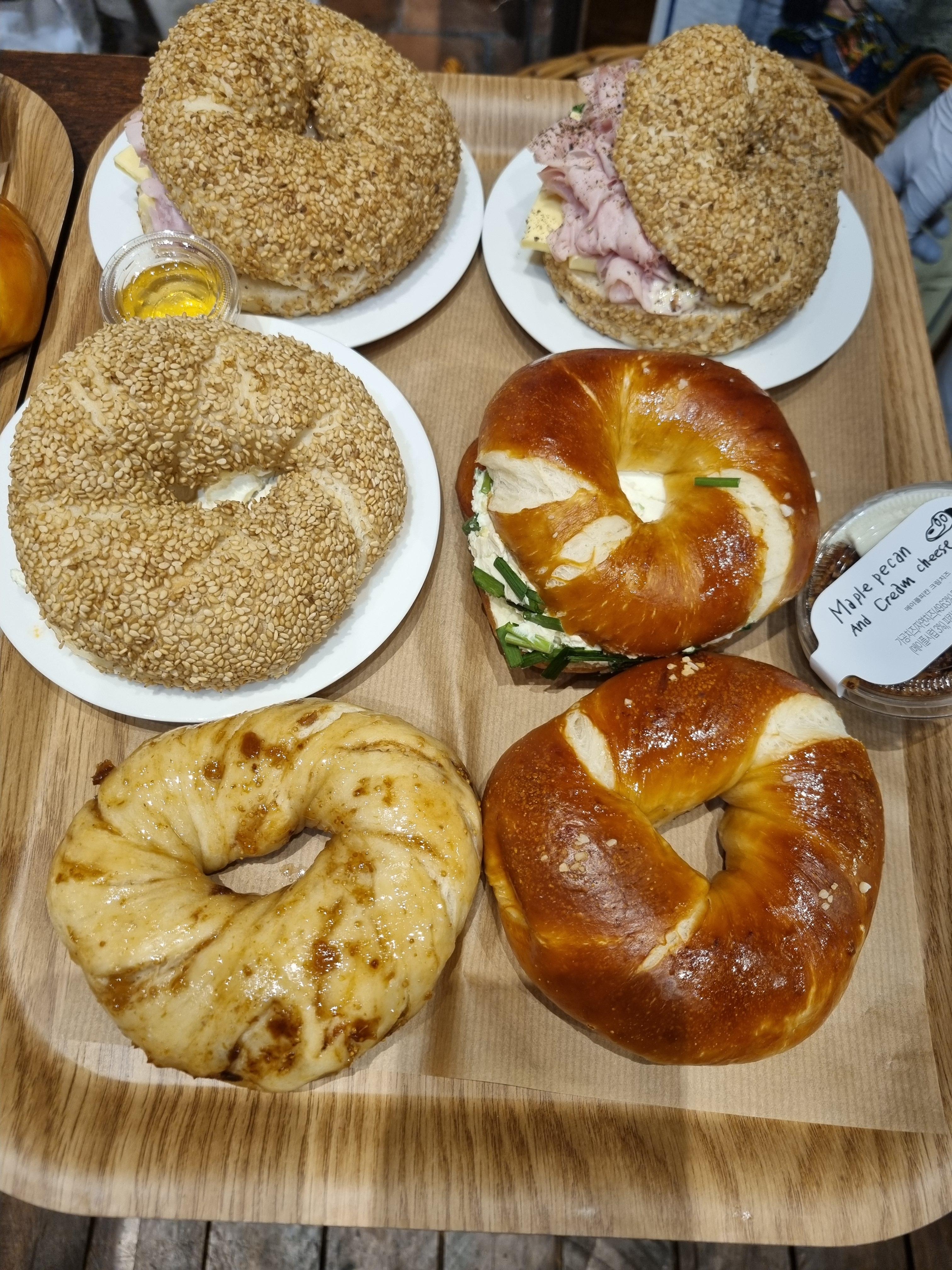 베이글 사진 예쁘게 찍고 싶었는데 이건 사치입니다. 쟁반 들고 베이글 담는 것만으로도 쉽지 않아요. 무겁더군요. 잘 쌓아야 하기도 하고요.