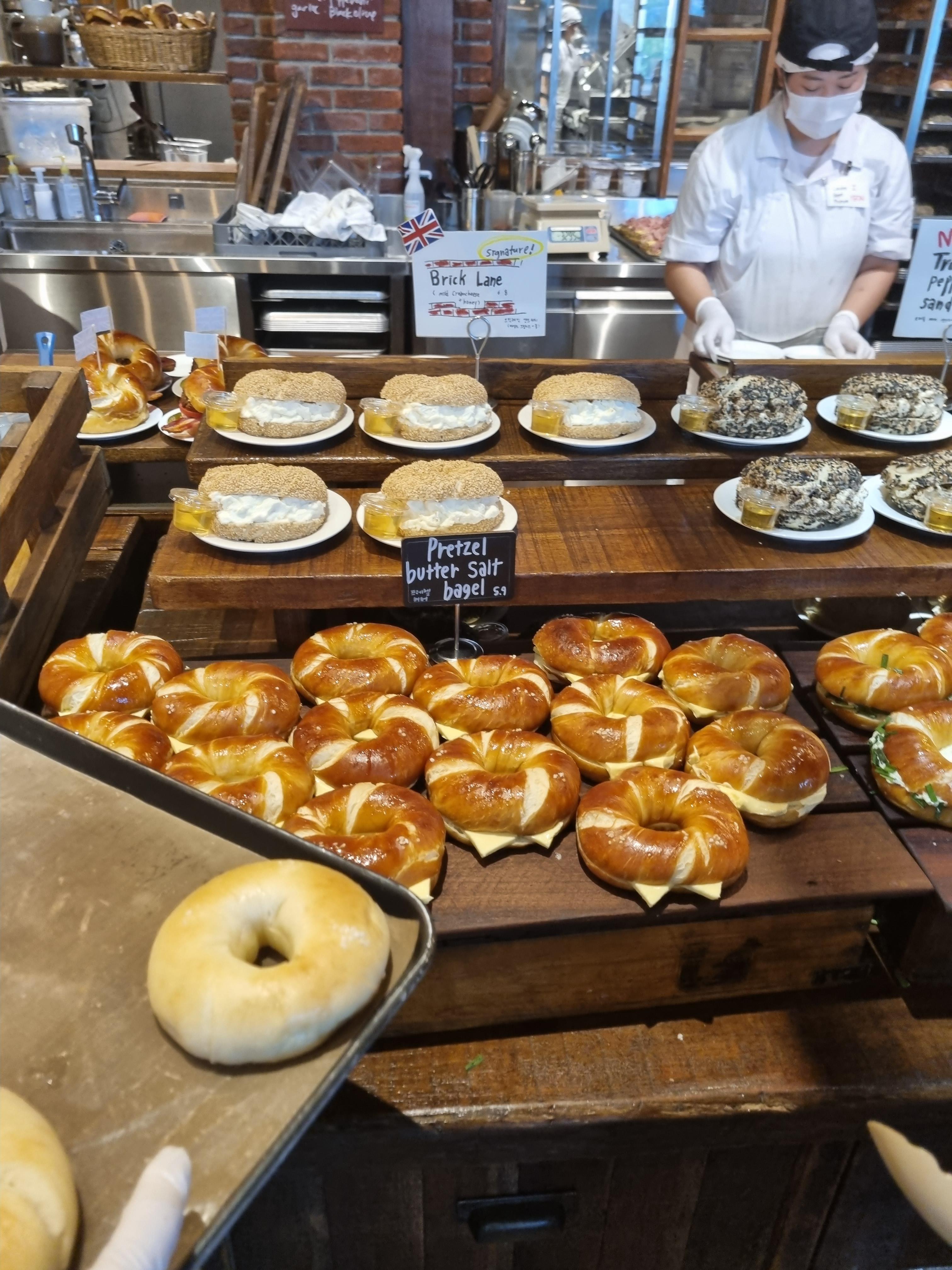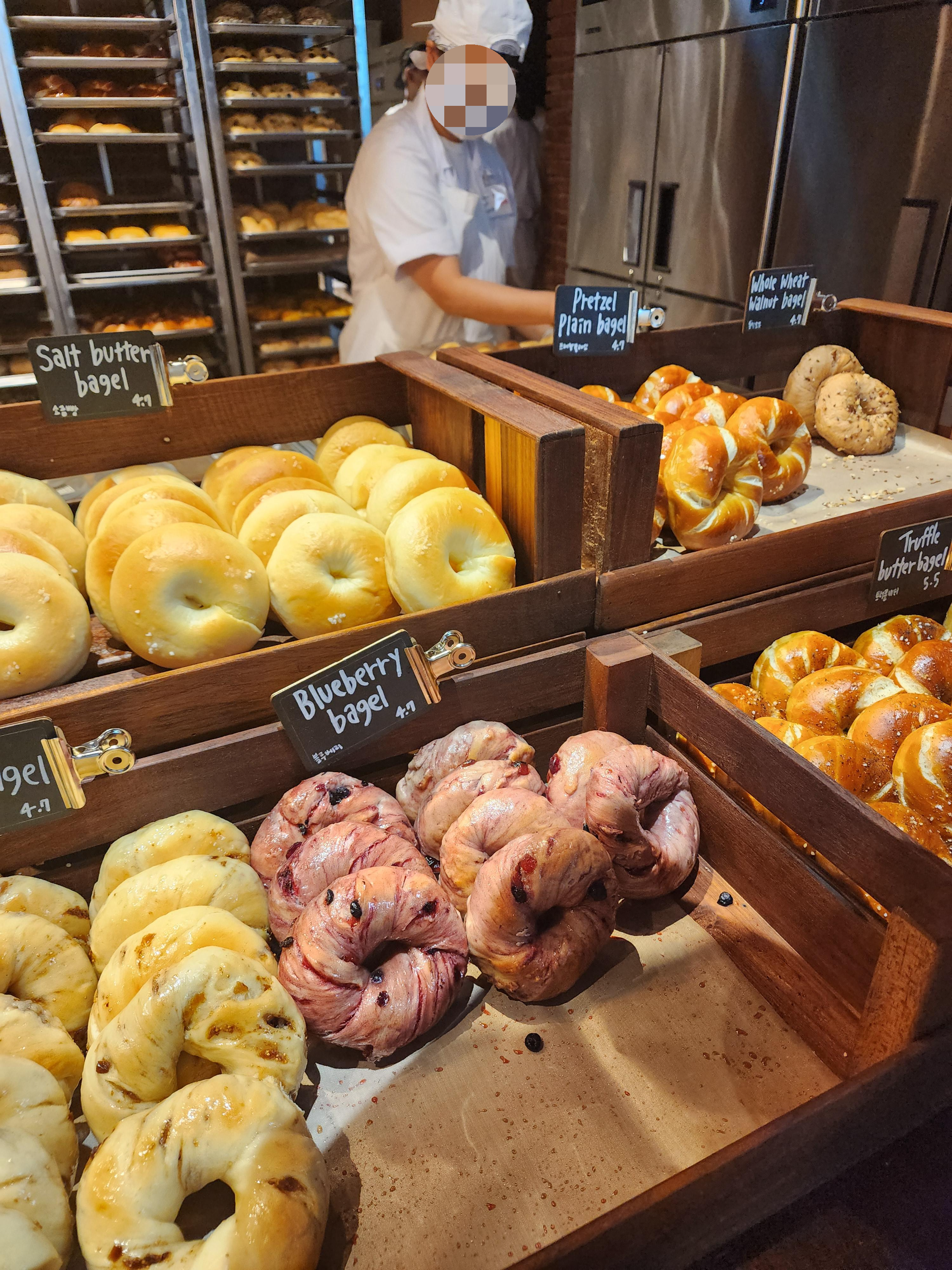 줄을 서봅니다. 제 앞으로 줄이 있어요. 그 앞으론 베이글이 가득해요. 빠지는 속도만큼 빠르게 채워집니다. 직원만 40명이라는 소문을 들었는데 제 눈에 보이는 직원만 해도 15명이 넘서요. 진짜 많네요.
