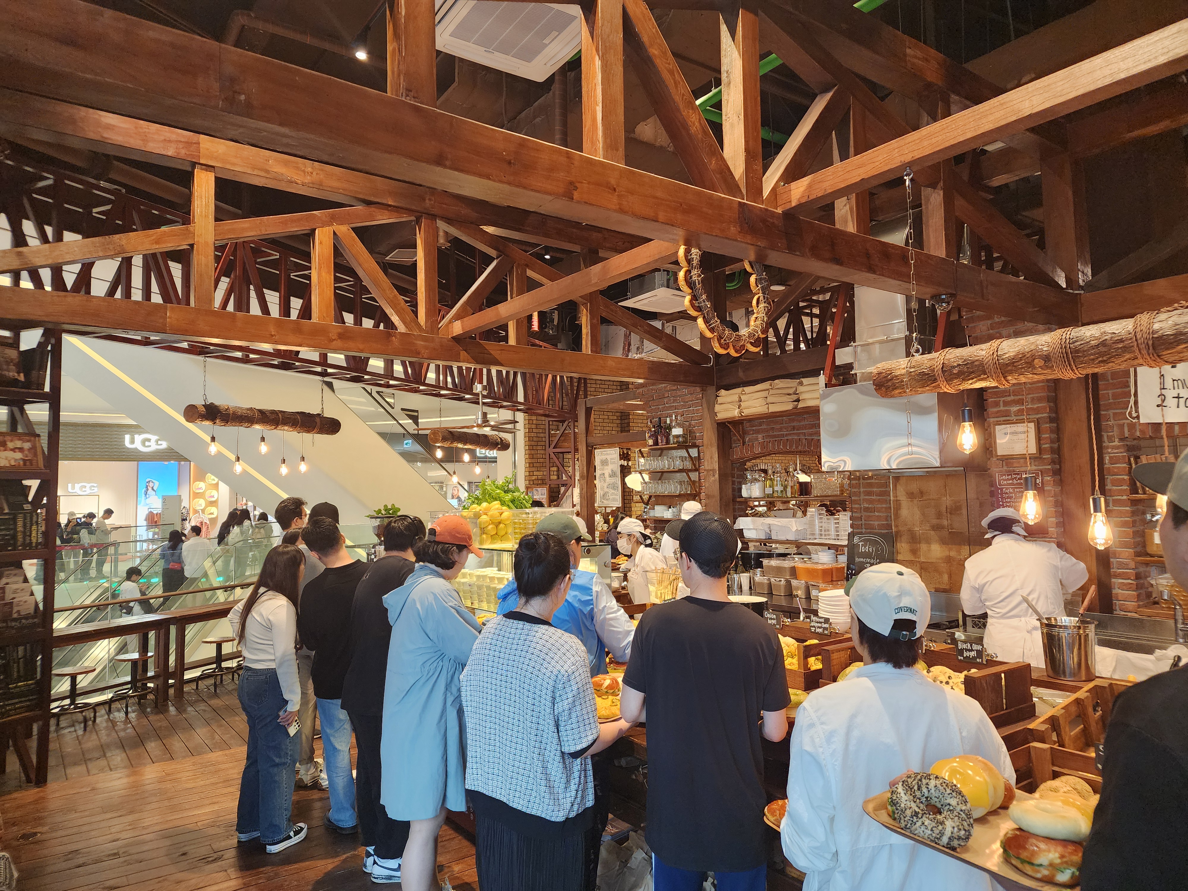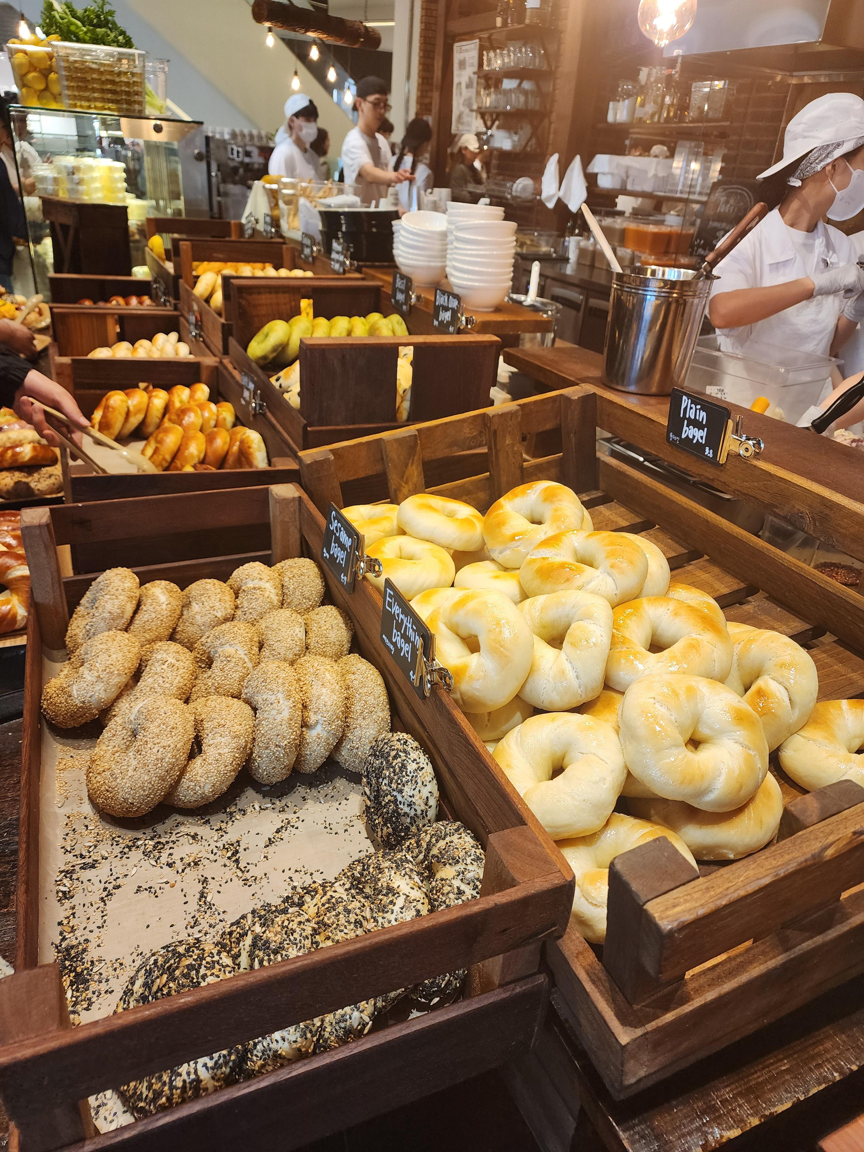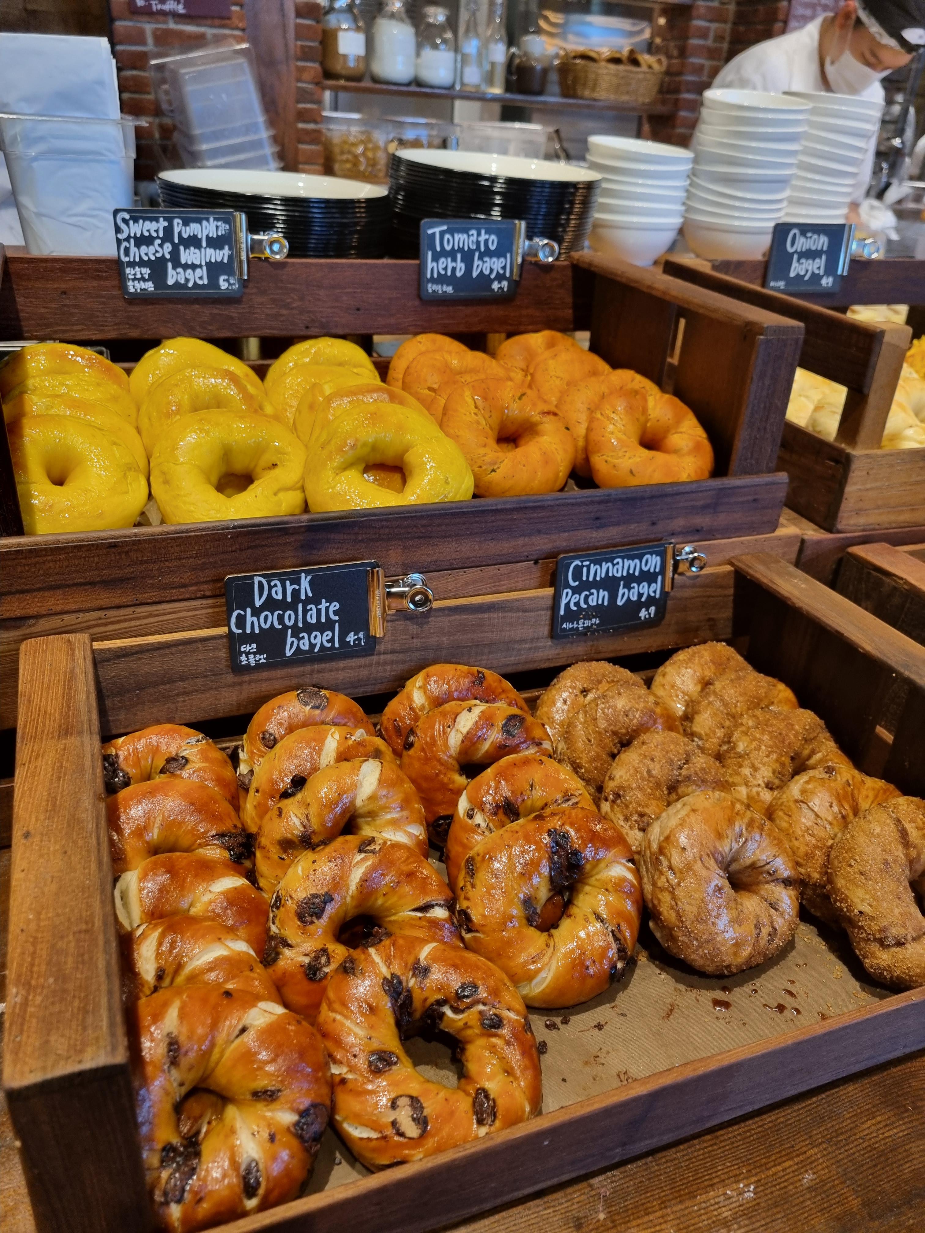 줄을 서봅니다. 제 앞으로 줄이 있어요. 그 앞으론 베이글이 가득해요. 빠지는 속도만큼 빠르게 채워집니다. 직원만 40명이라는 소문을 들었는데 제 눈에 보이는 직원만 해도 15명이 넘서요. 진짜 많네요.