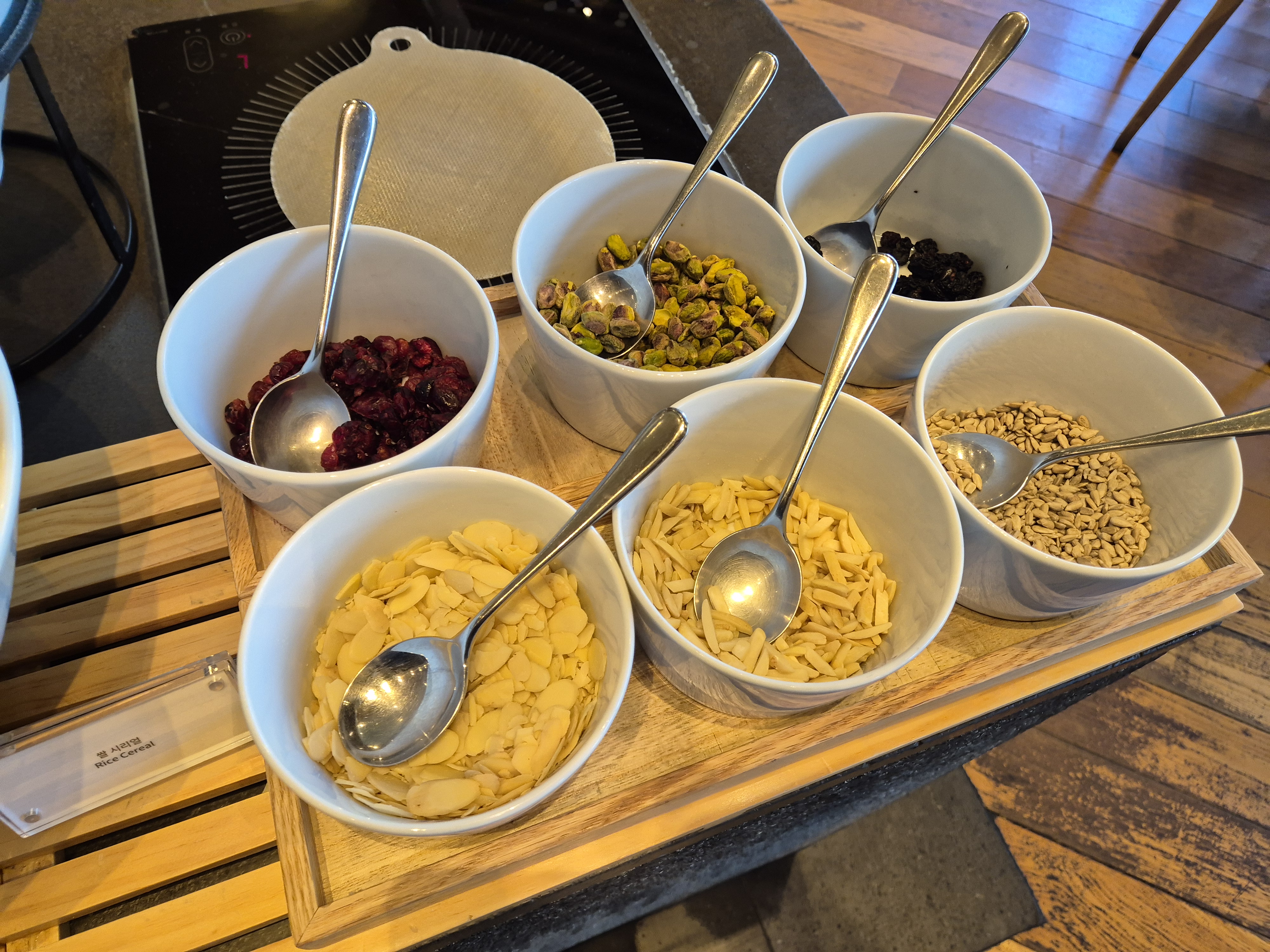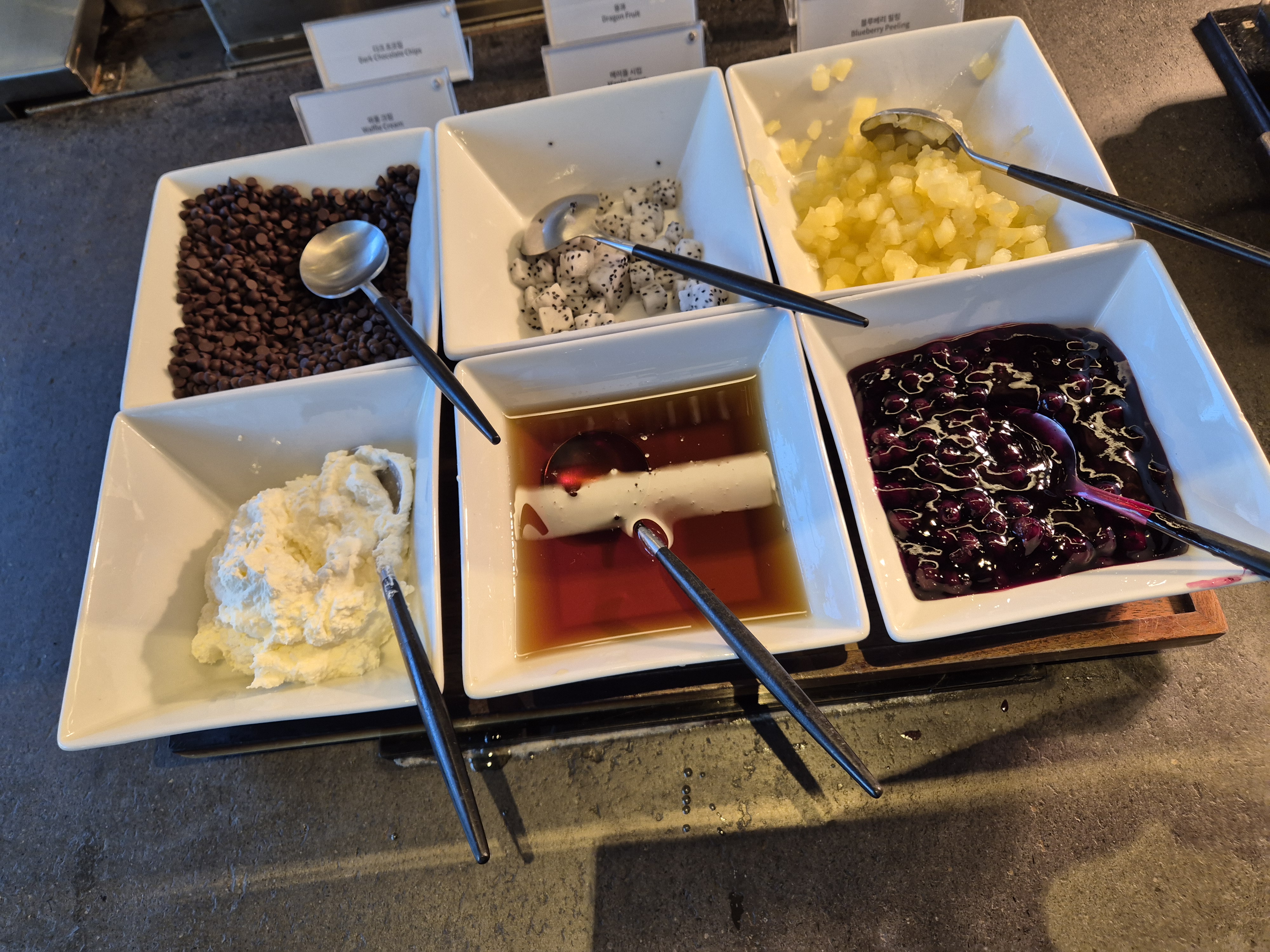 조끔 떨어진 우유랑 음료 있는 쪽에는 시리얼도 있었답니다. 시리얼이랑 토핑도 다양했어요.