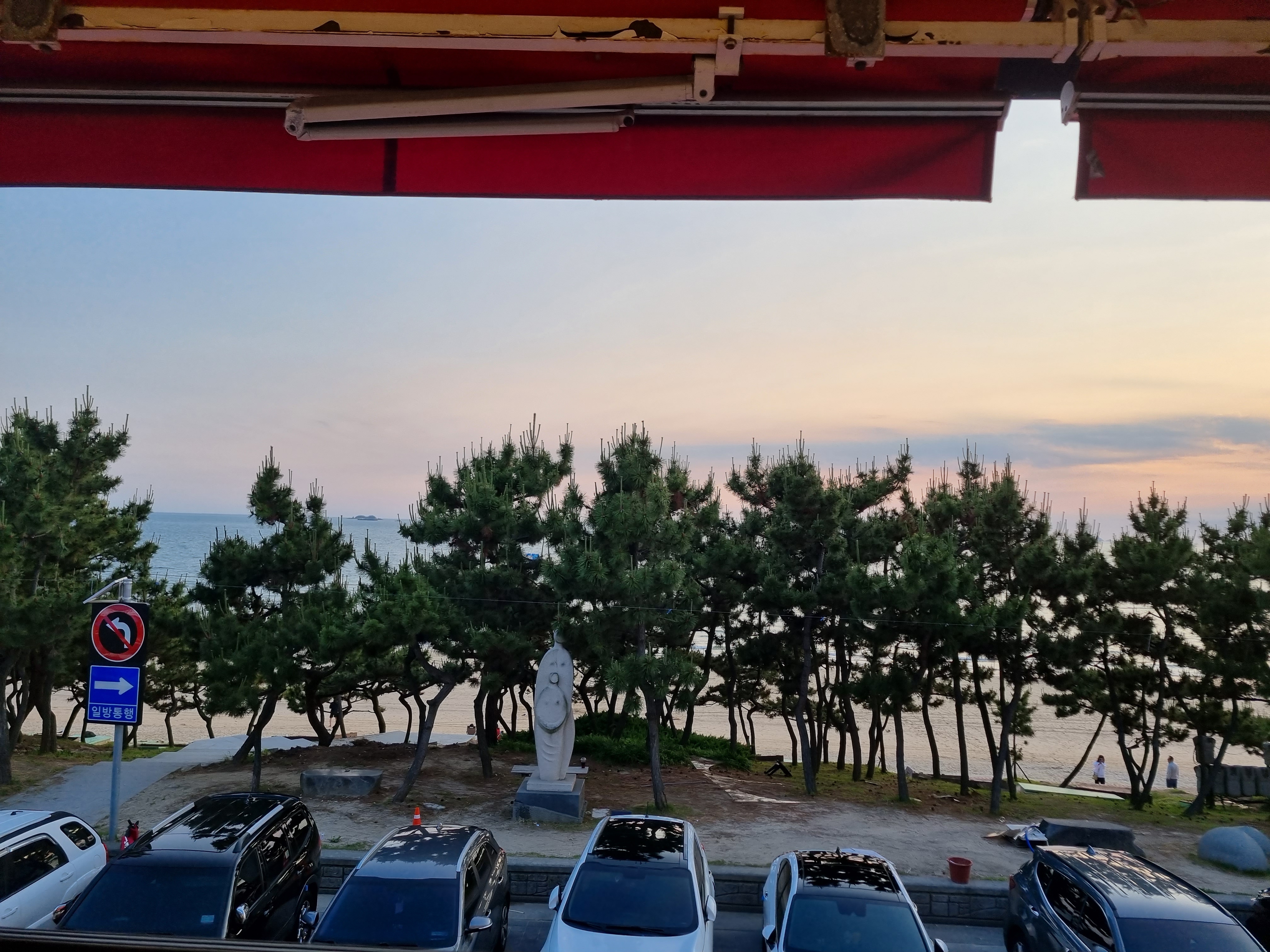 저녁 7시 15분경 식당 2층에 앉아 일몰을 감상합니다. 위치는 해수욕장 길 따라서 있는 조개구이 식당입니다. 식당 앞에는 도로와 주차장이 있고 해안가를 따라 나무가 심겨있어서 일몰을 보려고 2층으로 올라갔어요.