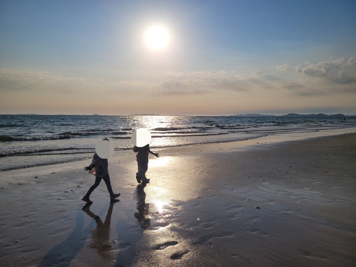 해 질 녘에 대천해수욕장에 왔더니 사진이 예쁘게 찍히네요. 대천해수욕장 노을 감상하려고 서둘러 왔어요. 바닷물이 빠져 있었고 밀물시간인 것 같았어요. 바닷물에 발도 담가보고 땅도 파봅니다.