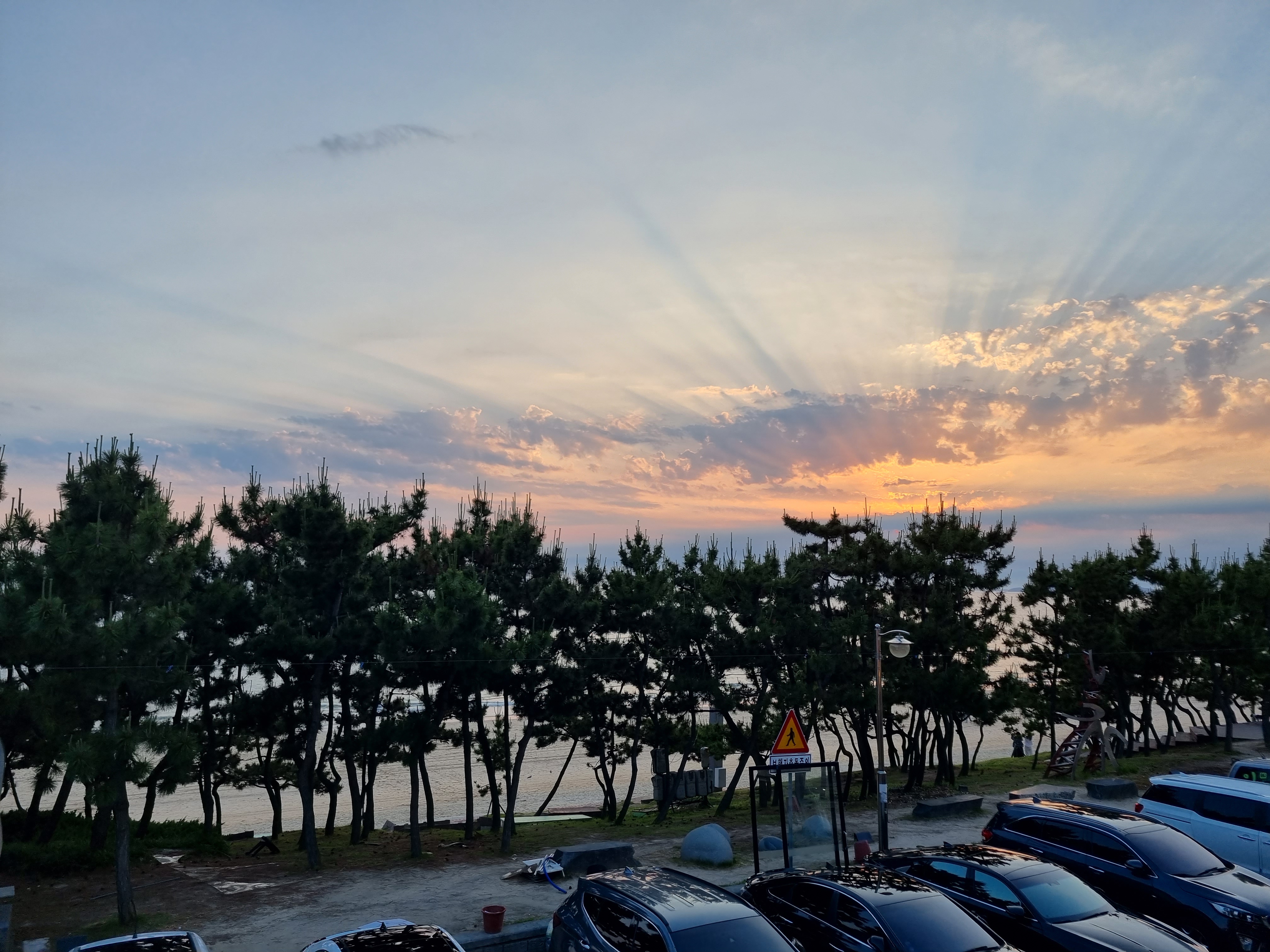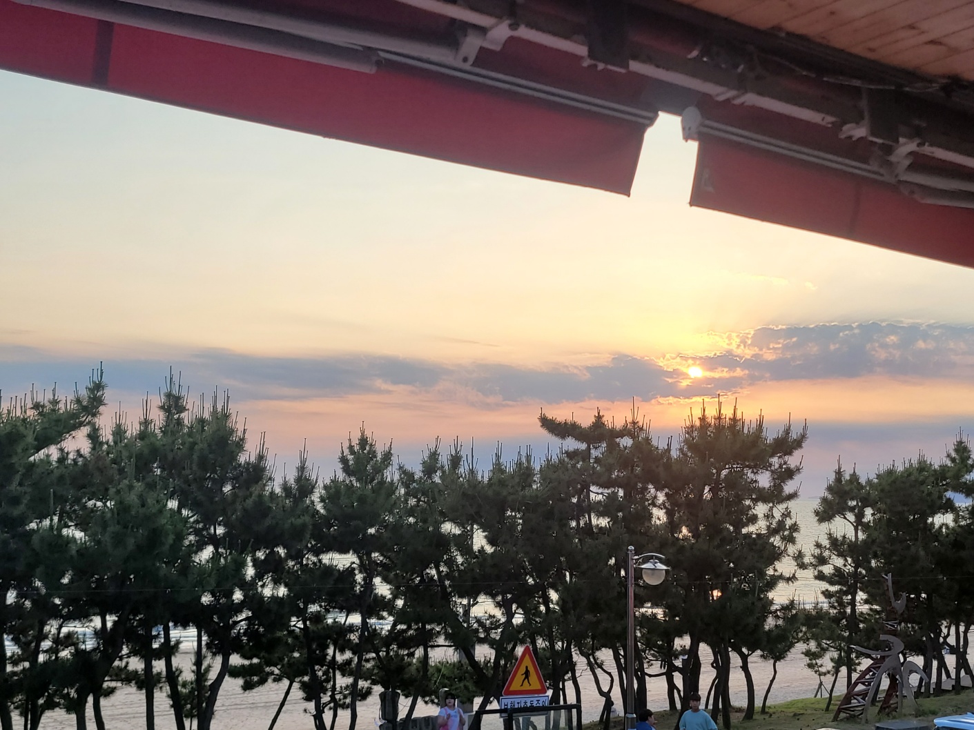 저녁 7시 15분경 식당 2층에 앉아 일몰을 감상합니다. 위치는 해수욕장 길 따라서 있는 조개구이 식당입니다. 식당 앞에는 도로와 주차장이 있고 해안가를 따라 나무가 심겨있어서 일몰을 보려고 2층으로 올라갔어요.