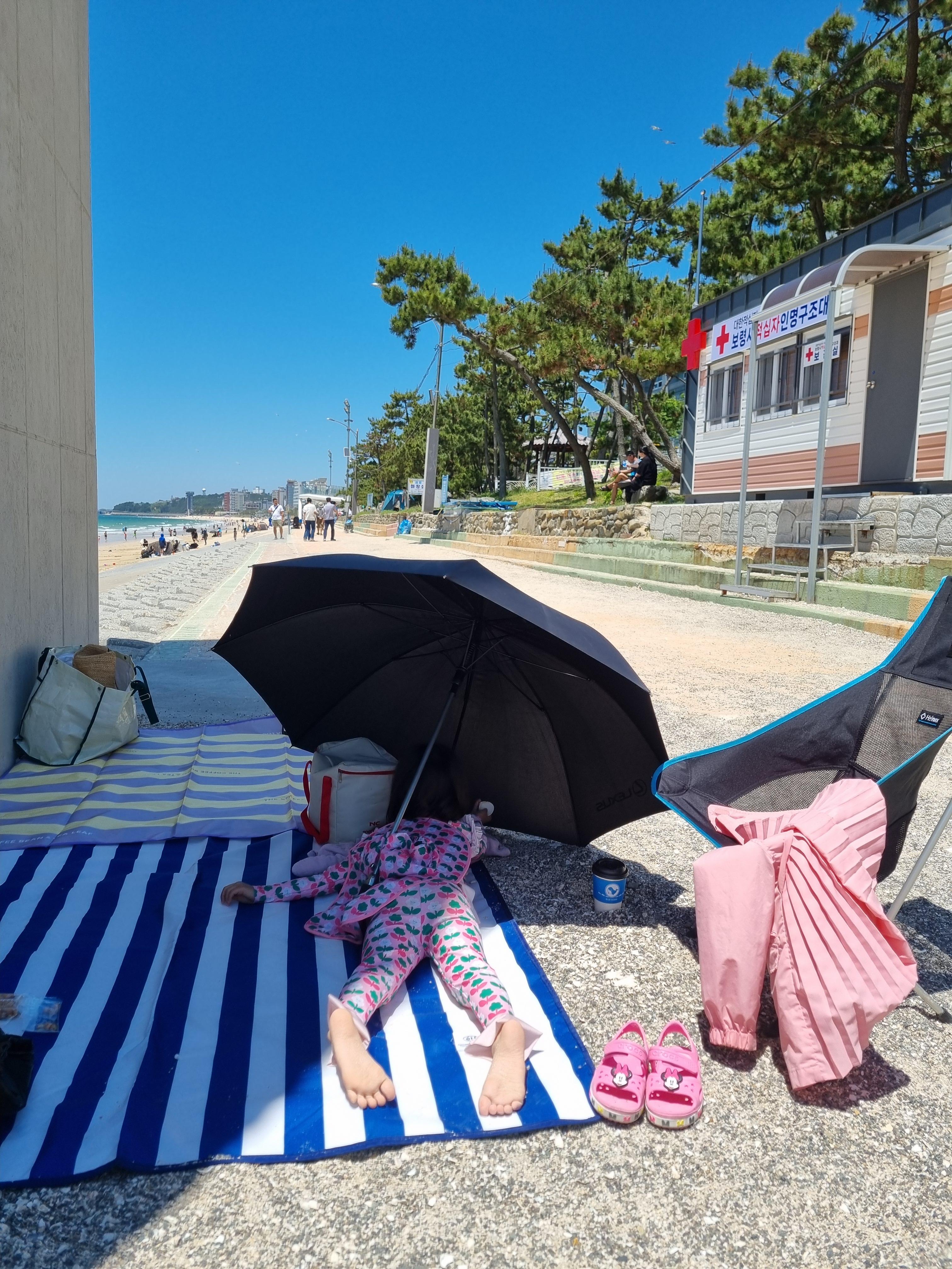 엉덩이까지 바닷물에 젖고 바람이 세게 부니까 너무 추워하더라고요. 썬텐하듯이 누워서 래시가드도 말리고 난리였답니다. 따뜻한 음료도 마셨어요.