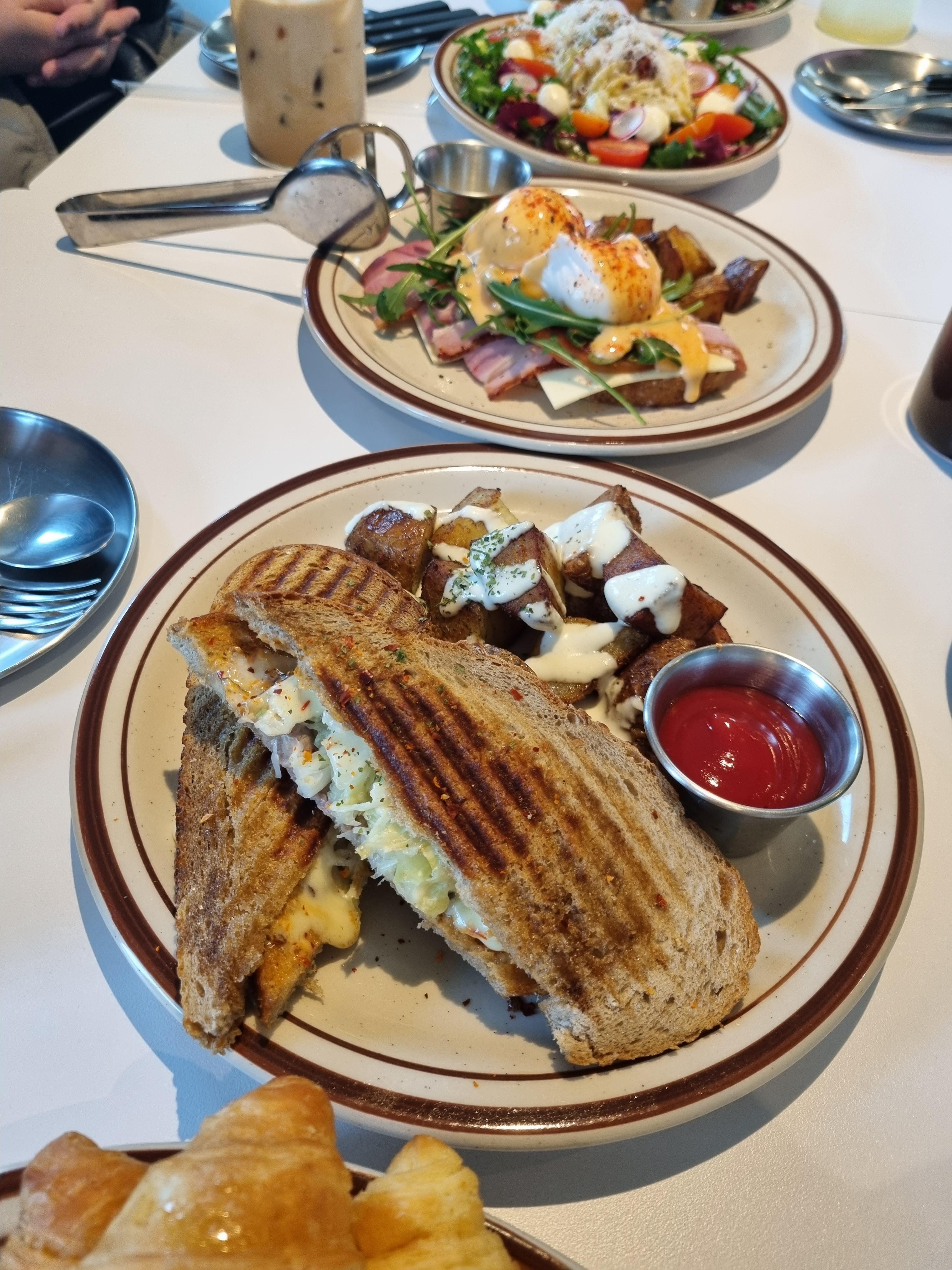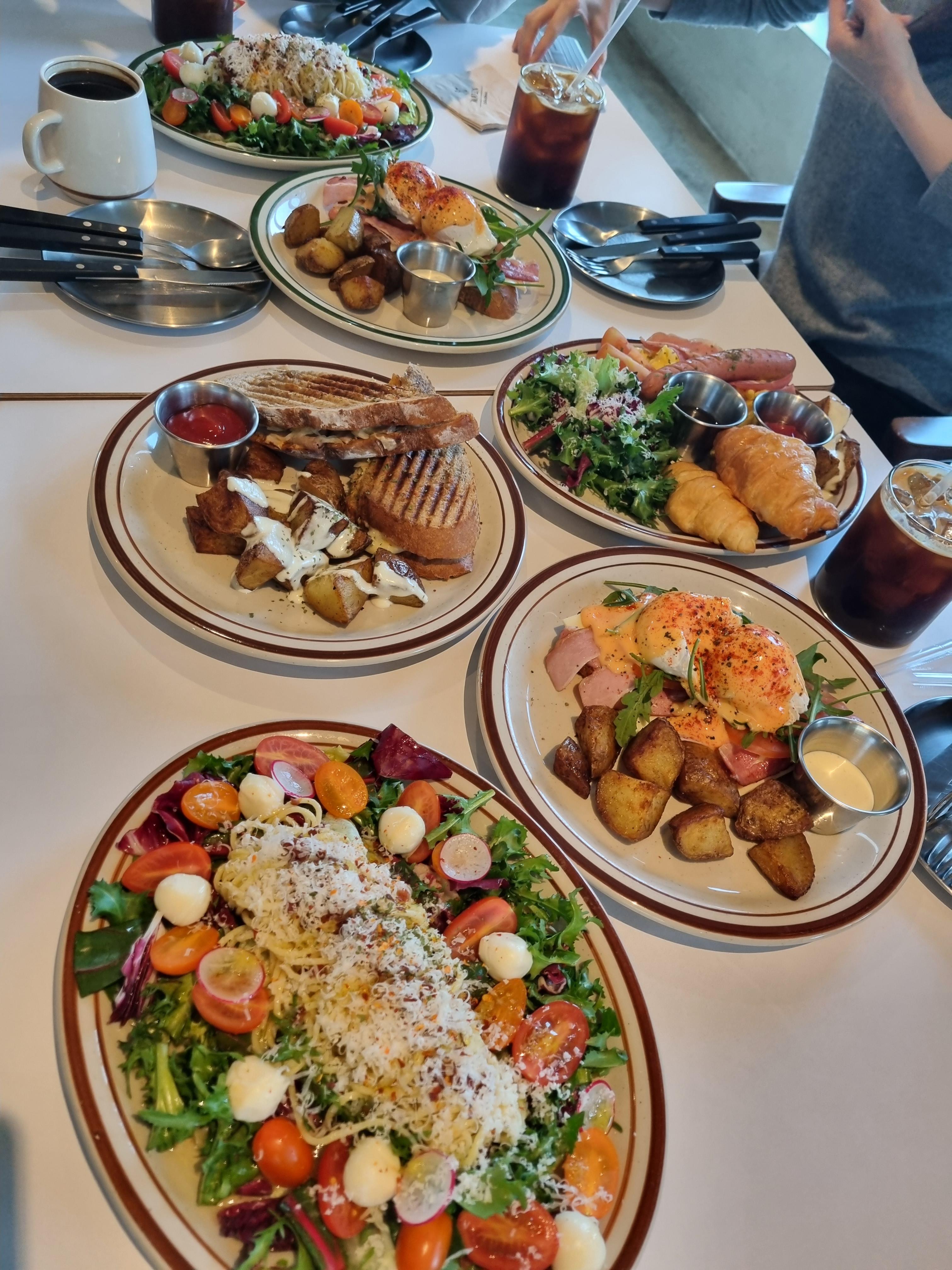 여럿이 가서 골고루 주문하니 다양하게 맛보는 즐거움이 있더라고요. 테이블이 가득 찼죠? 에그베니딕트 2개, 메이븐 샐러드 파스타 2개, 브런치 플레이트 1개, 루벤 샌드위치&후렌치 후라이 1개로 보입니다. 카페 메이븐에 여럿이 가는 것을 추천합니다.