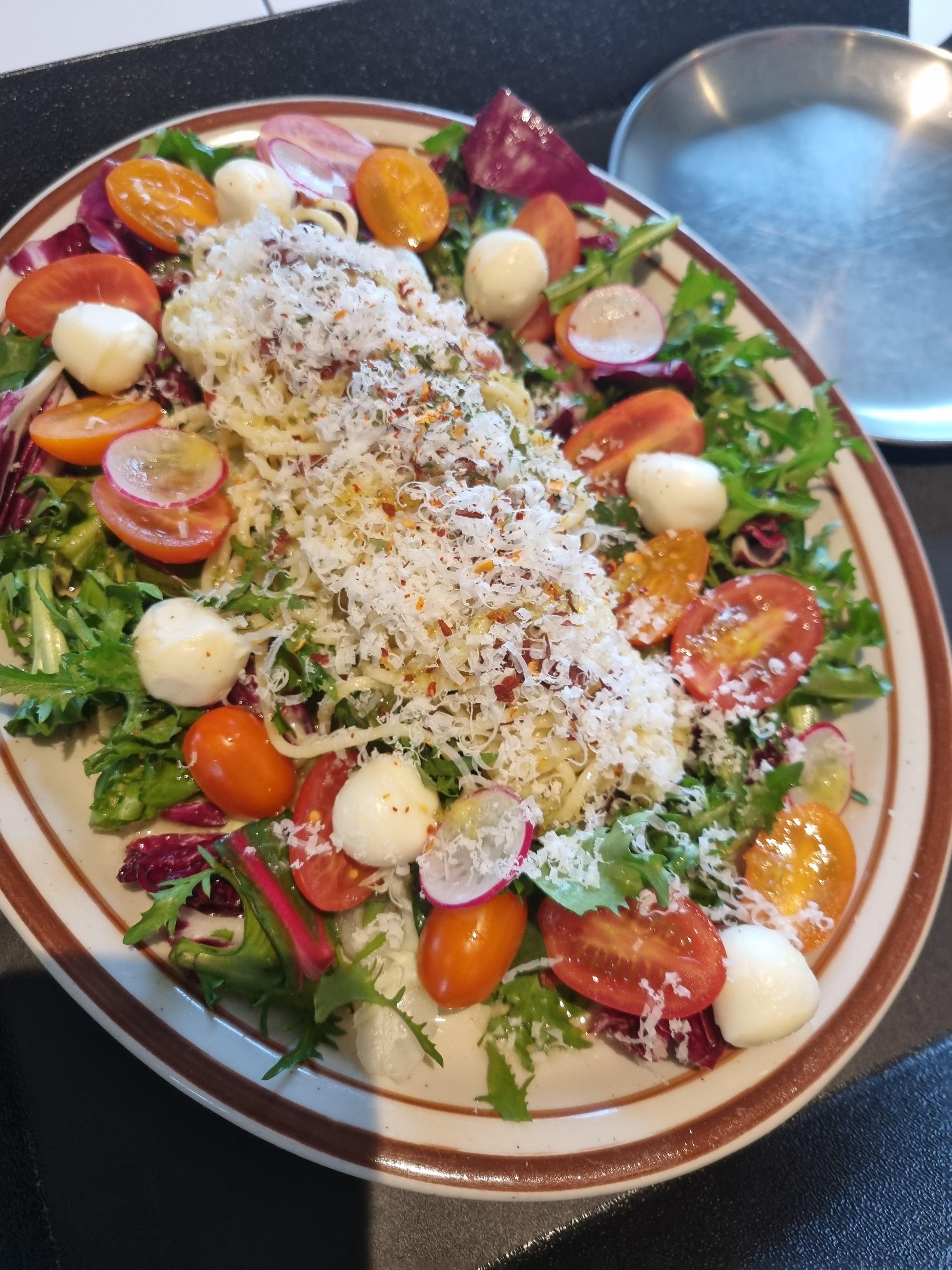 메이븐 샐러드 파스타는 냉파스타예요. 신선한 방울토마토랑 샐러드, 치즈 등이 맛있게 어우러졌고, 자칫 브런치 먹고 양이 덜 찰 수 도 있는데 샐러드 파스타 덕분에 배가 차지 않을 수 없어요. 비주얼이 예뻐서 맛도 한 층 더 맛있습니다.