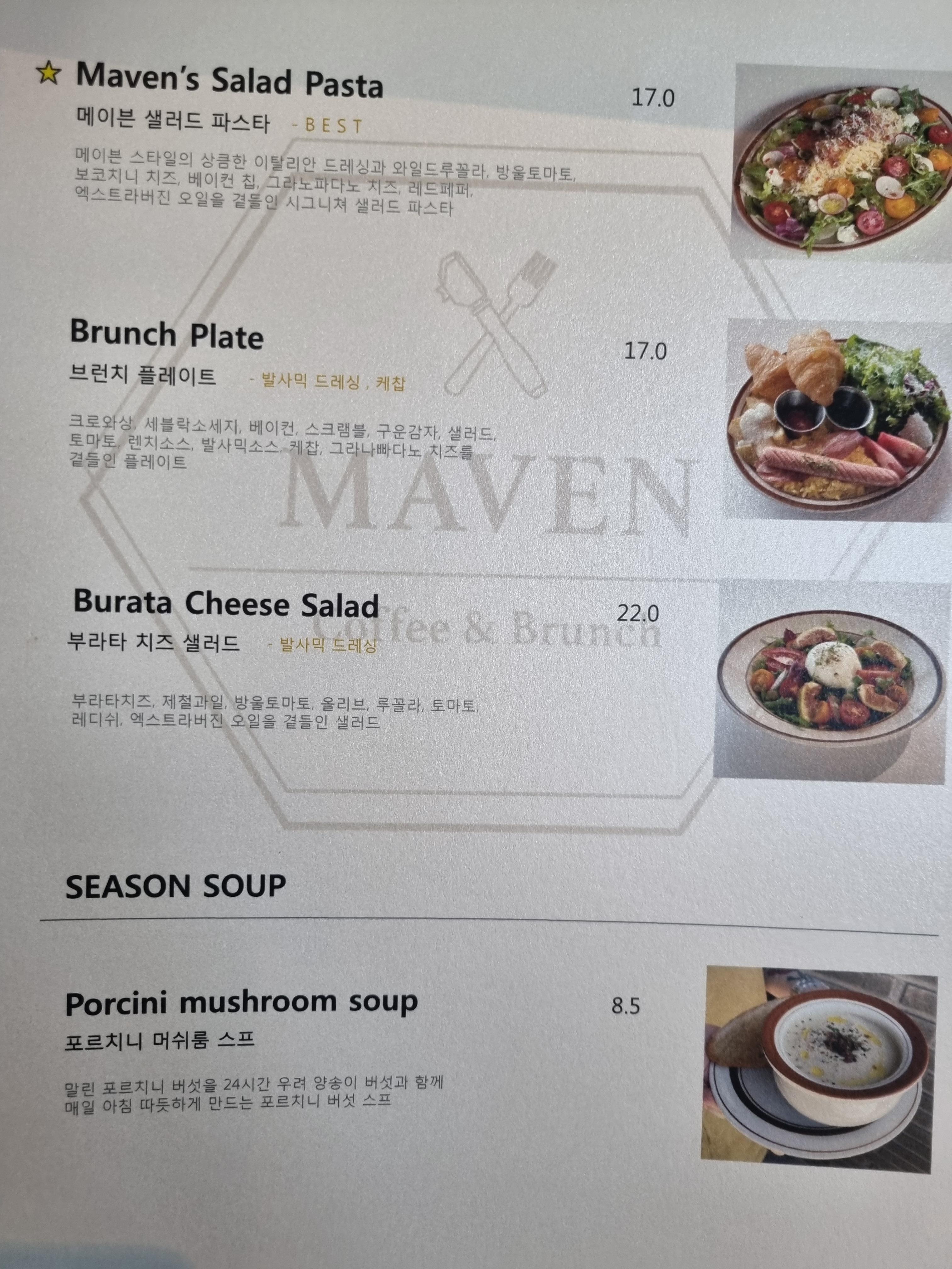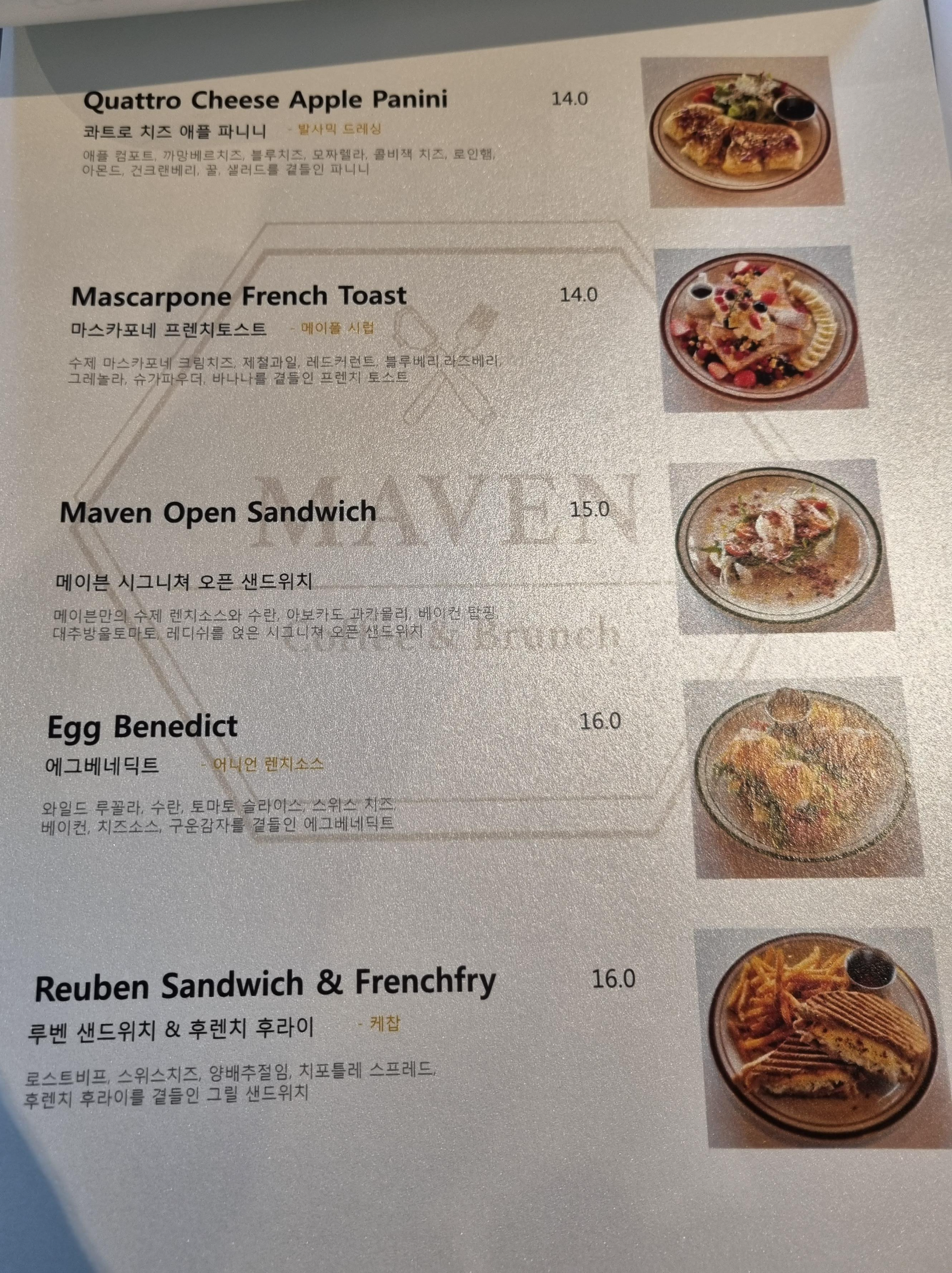 브런치 메뉴판이에요. 제가 방문했을 때는 이전과 달리 메뉴가 간소화되었더라고요. 카페 메이븐 추천해 주신 분이 없어진 메뉴가 아쉽다고 하셨지만 저는 충분히 맛있었어요.