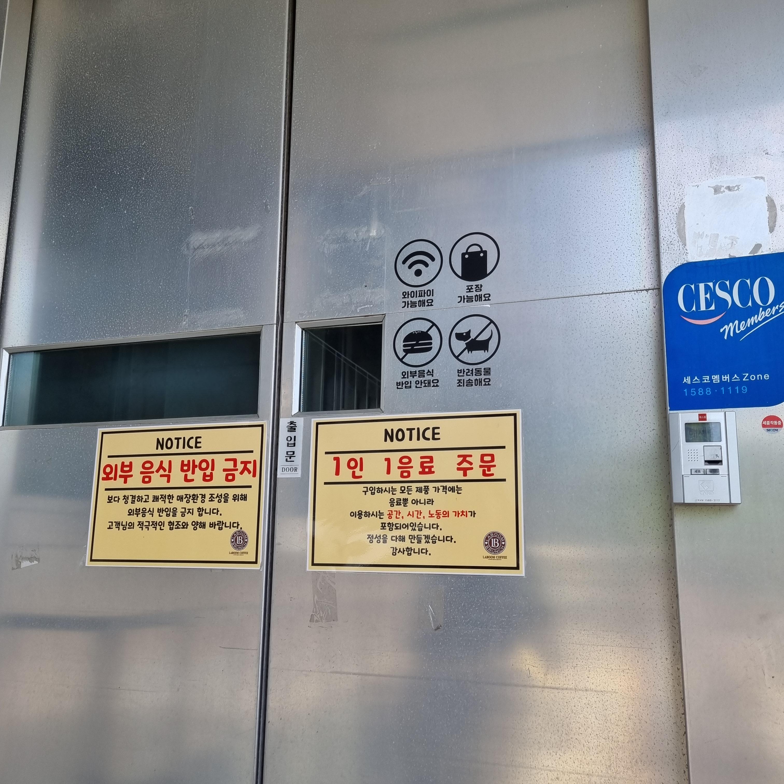 카페 문 앞이에요. 반려동물은 입장과 외부음식 반입은 안되고 포장은 가능하나 1인 1 음료 주문이 필수입니다.