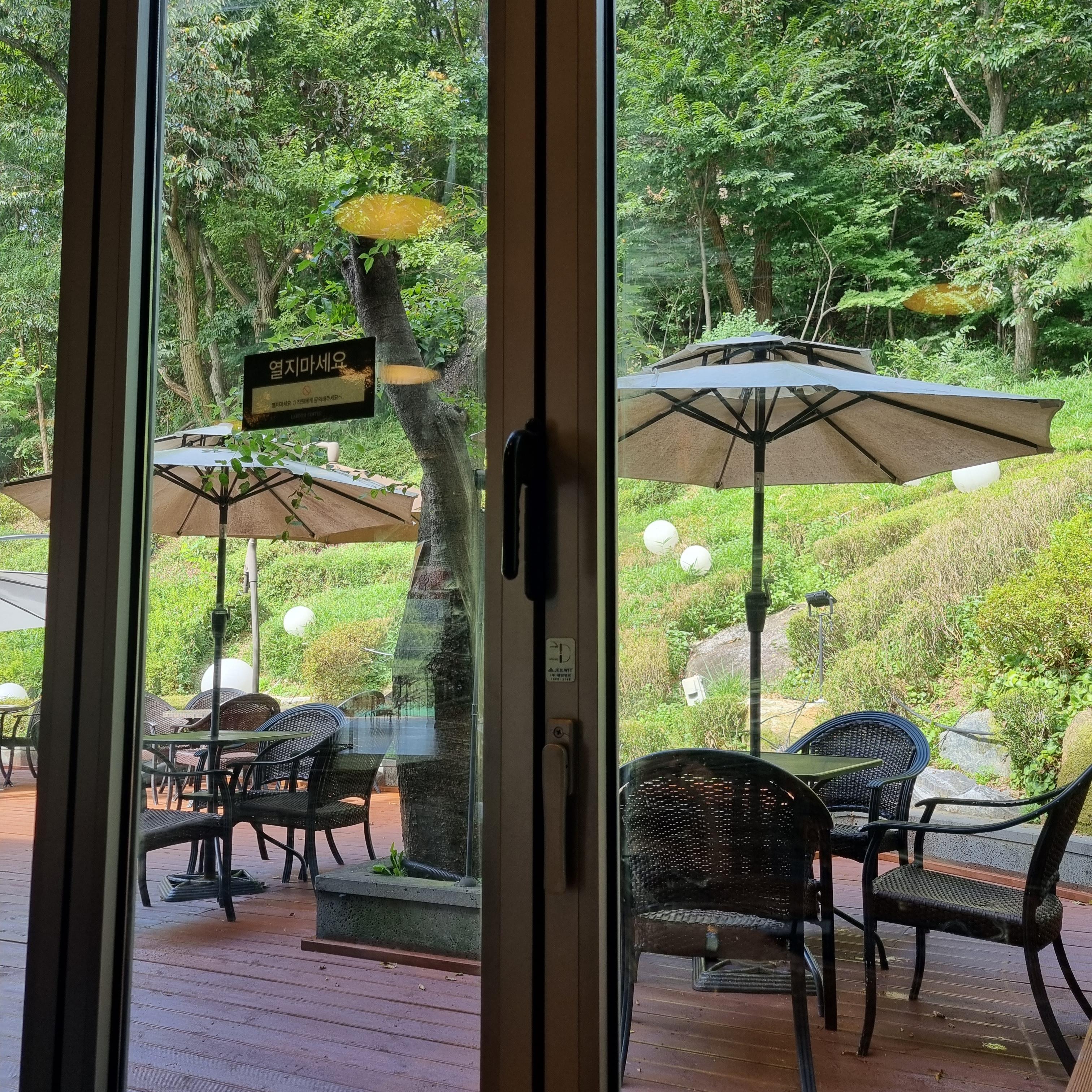 저는 야외가 보이는 창가에 앉았어요. 아주머니 두 분은 커피를 주문해서 야외에서 마시면서 고구마줄기를 다듬더라고요.