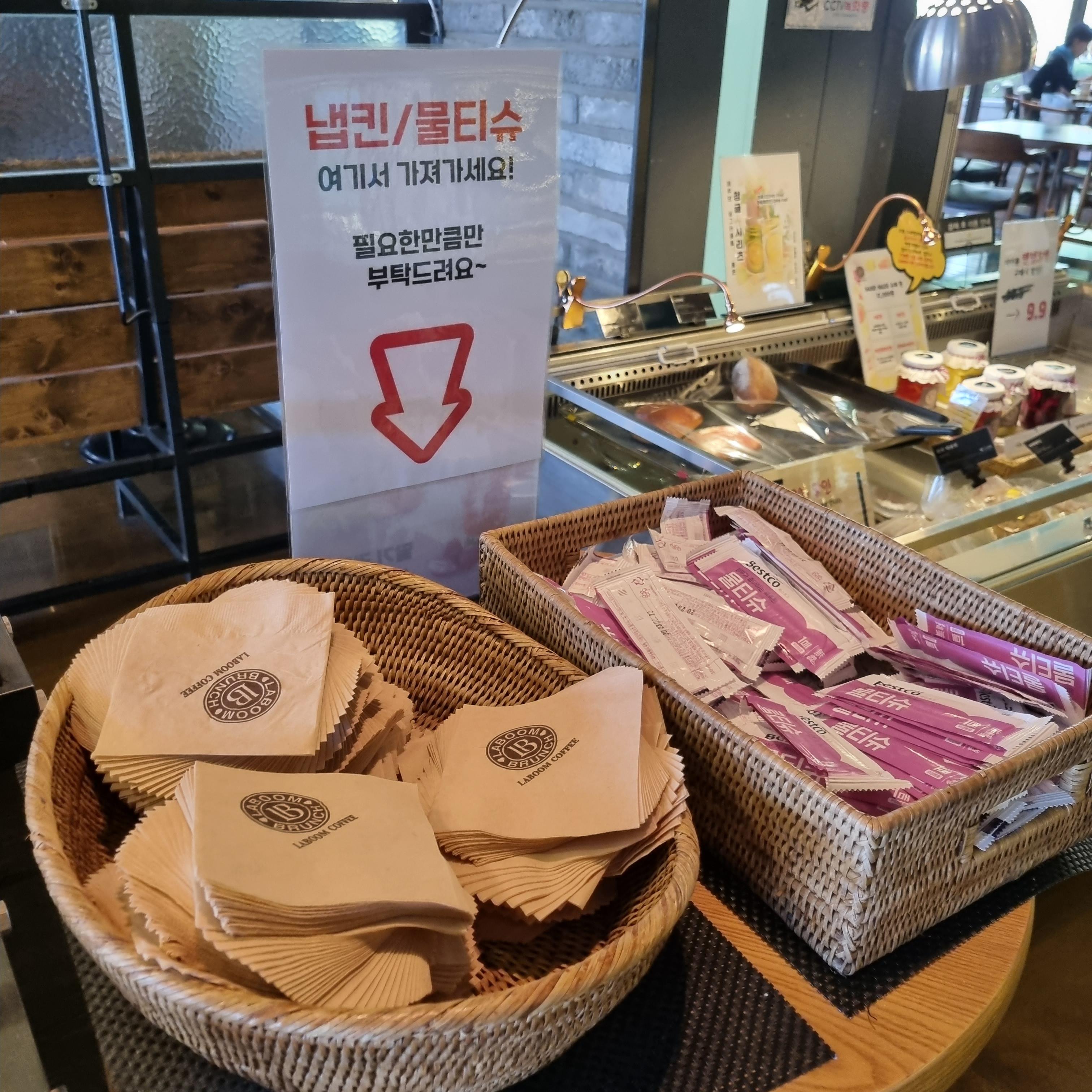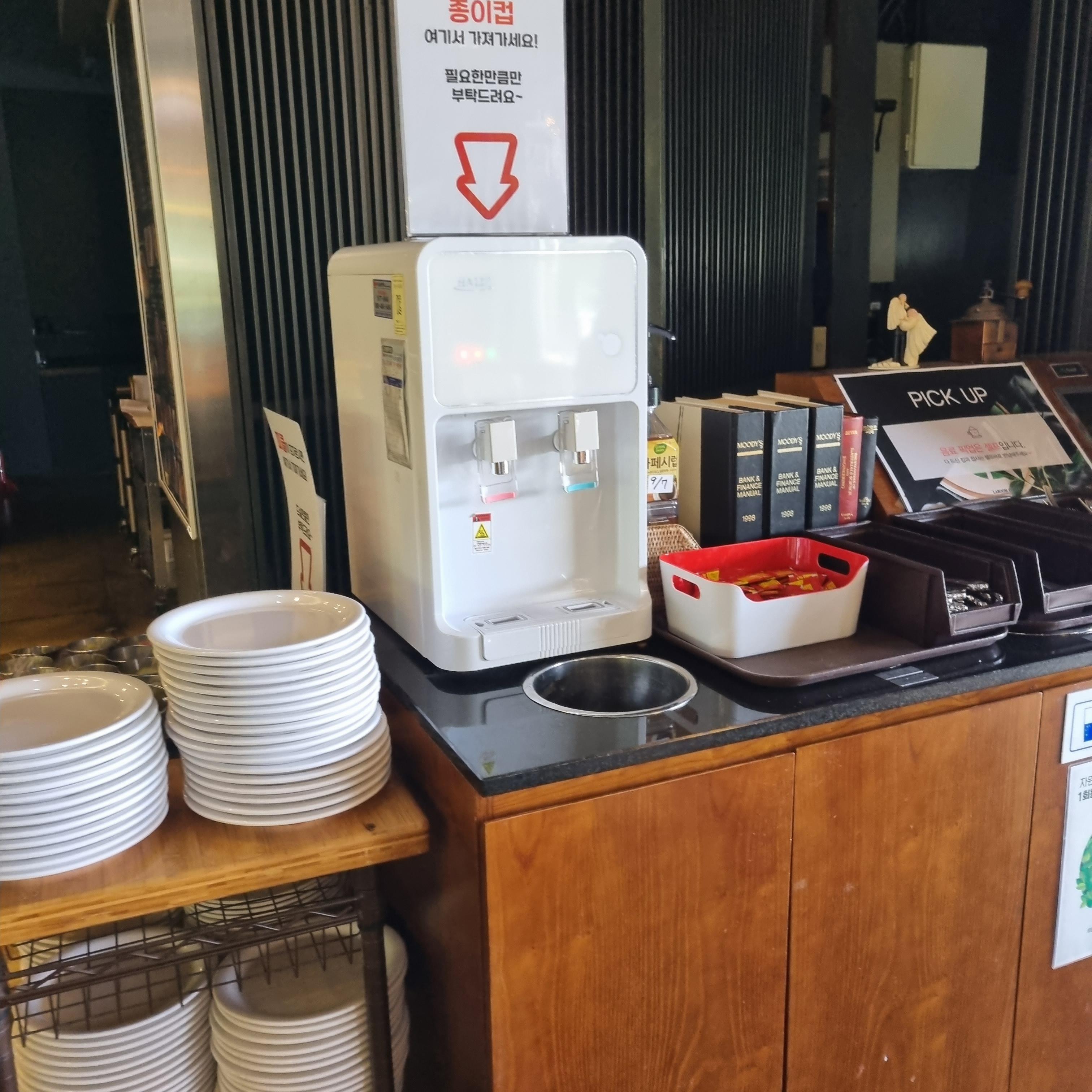 접시, 포크, 나이프, 냅킨, 물티슈는 셀프입니다.