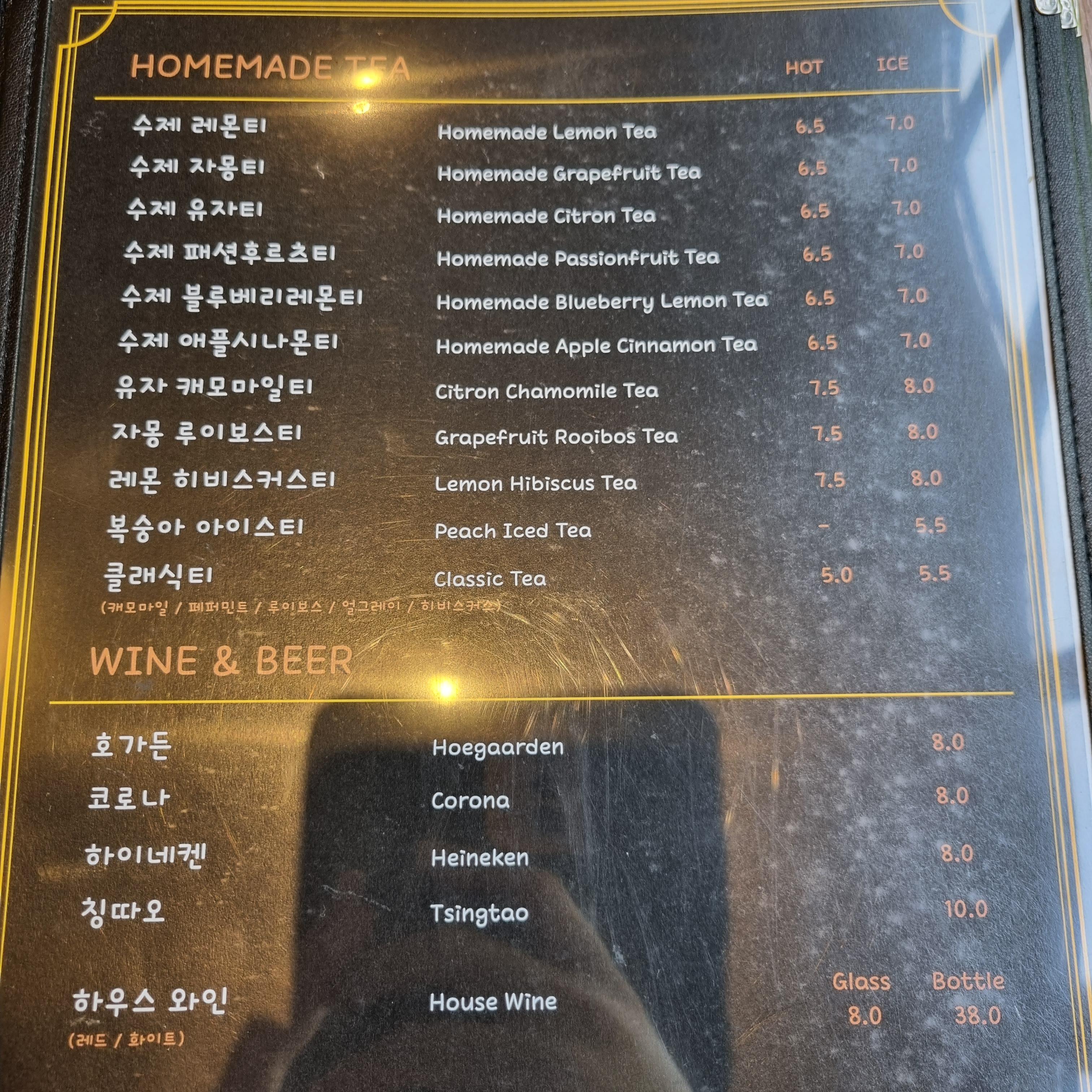 수제 레몬티 등 다양한 수제청이 들어간 티와 허브차 판매합니다. 하우스 와인과 수입 맥주도 판매하네요.
