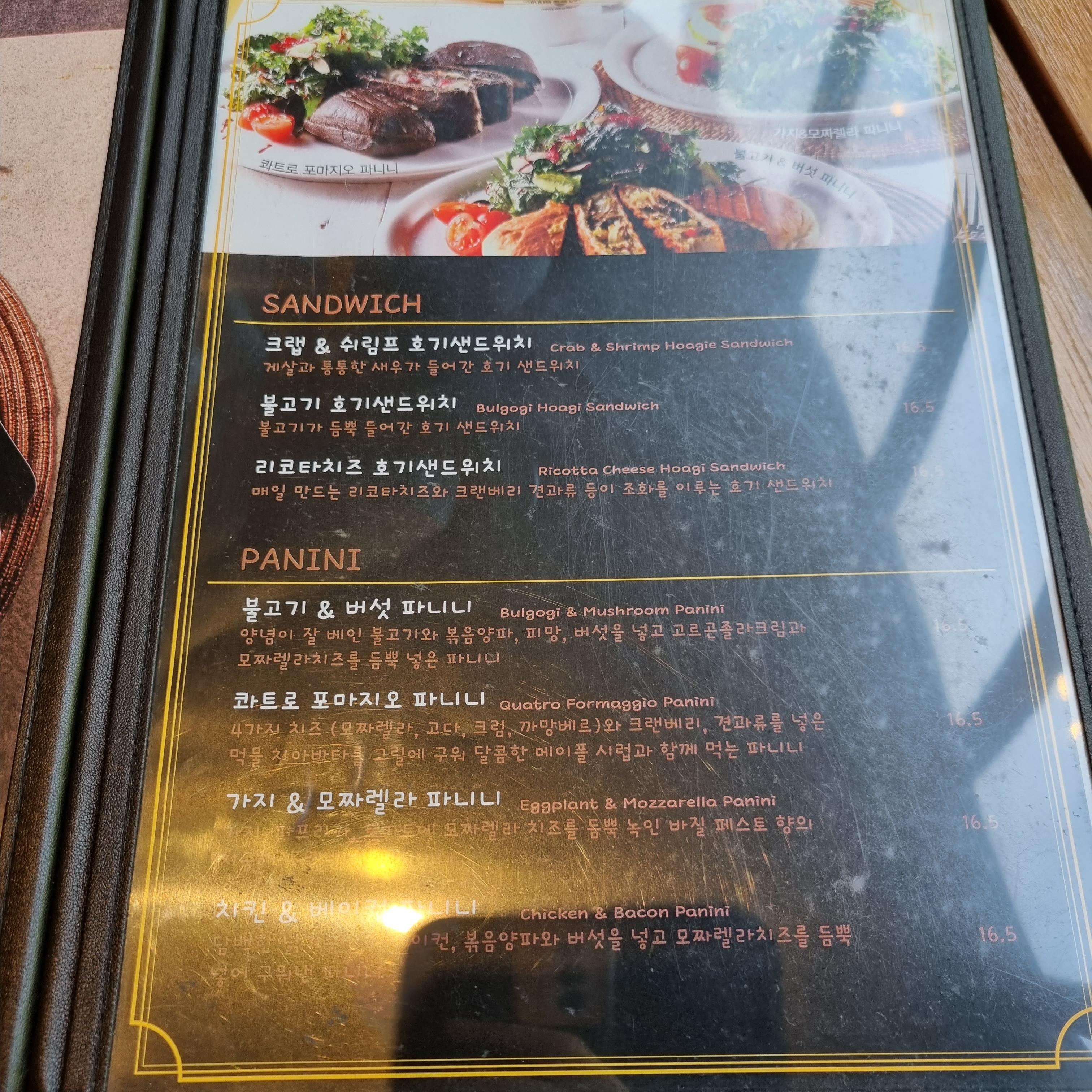 샌드위치는 크랩&쉬림프 호기 샌드위치, 불고기 호기 샌드위치, 리코타치즈 호기샌드위치 판매 중이에요.