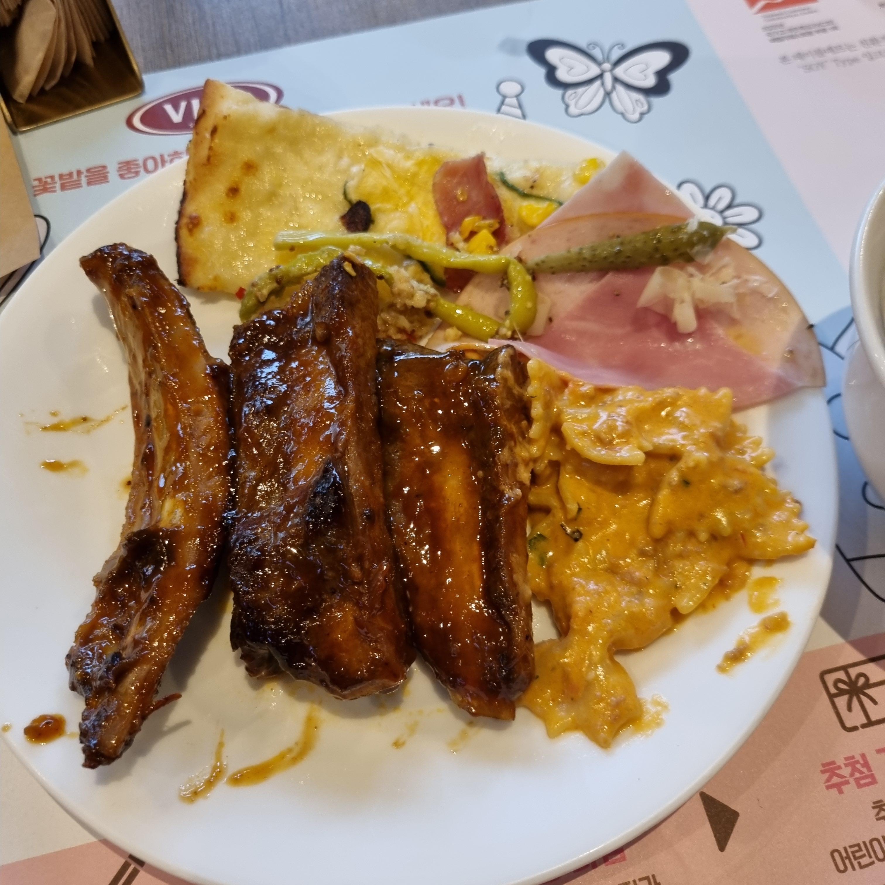 샐러드바를 이용했습니다. 먹으면서 살펴보니 손님이 나간 빈 테이블이 많이 보이는 데 테이블 정리가 느립니다. '어린이날 같이 바쁜 날은 테이블 회전을 위해 빨리 정리해야 하지 않을까?'라는 생각이 들었습니다. 대기 손님들이 순차적으로 입장하는 것으로 보였거든요. 물론 대기 손님은 그렇게 많지는 않았던 것 같습니다. 안양 비산점에 손님이 몰리지 않는 이유가 이 지점의 특징이 있지 않을까 하는 생각을 해보았습니다.