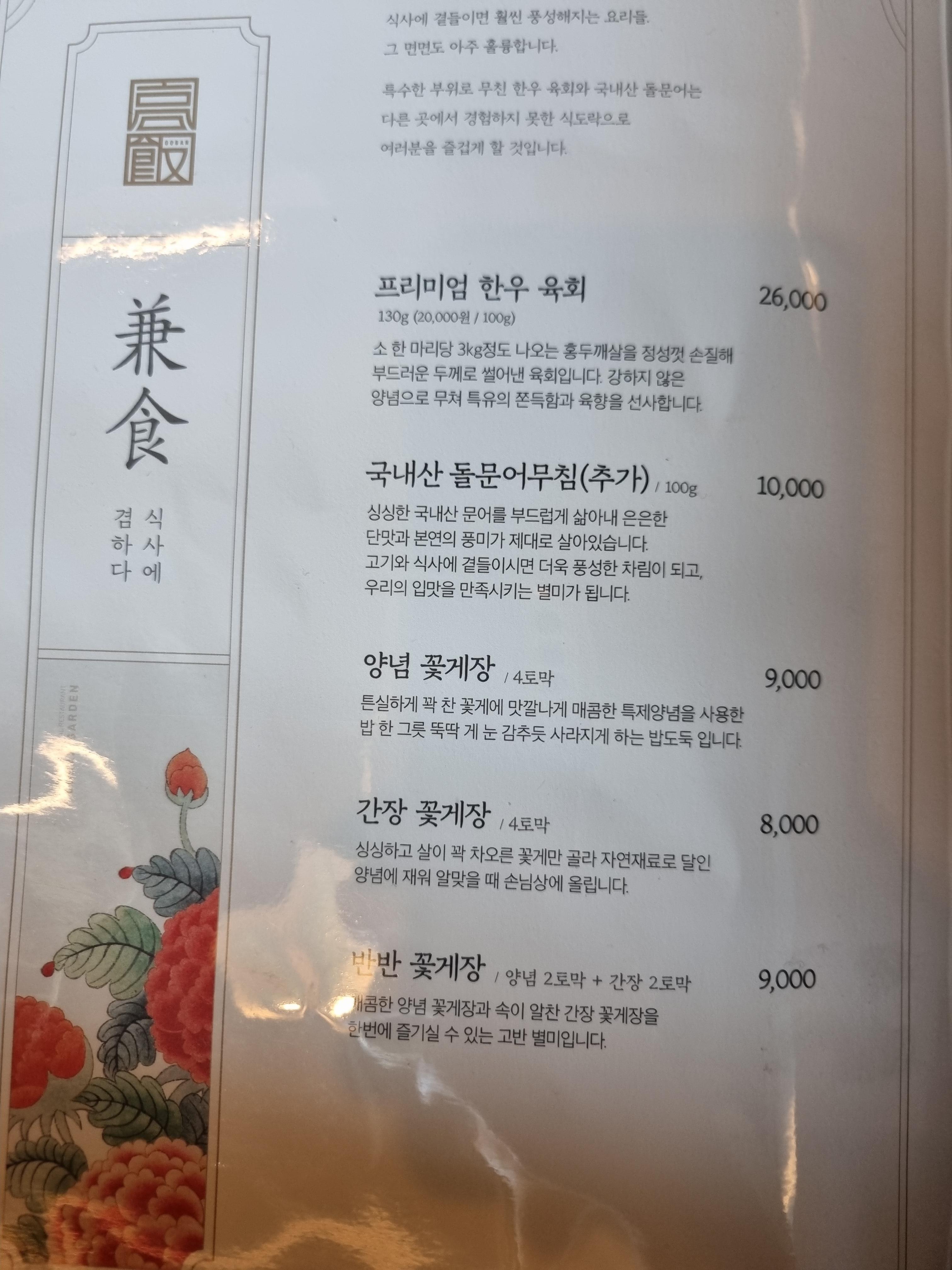 간장게장은 백진주쌀돌솥밥이랑 맛있게 먹었어요. 돌솥밥을 깜박했는데 좋은 쌀인지 밥이 맛있었답니다. 사진 깜박했어요. 문어숙회는 갈치젓갈 같은 젓갈과 해초류가 함께 나왔어요. 문어가 냉동을 해동한 듯해서 식감은 별로였어요. 저는 도토리묵무침이 맛있더라고요. 처음엔 야채만 있는 줄 알았는데 야채 아래 숨어 있었어요. 버섯탕수는 큰 감흥이 없었어요. 식어서 그런 걸 수도 있겠다 싶어요. 저는 잡채가 짭조름하니 맛있었어요.
