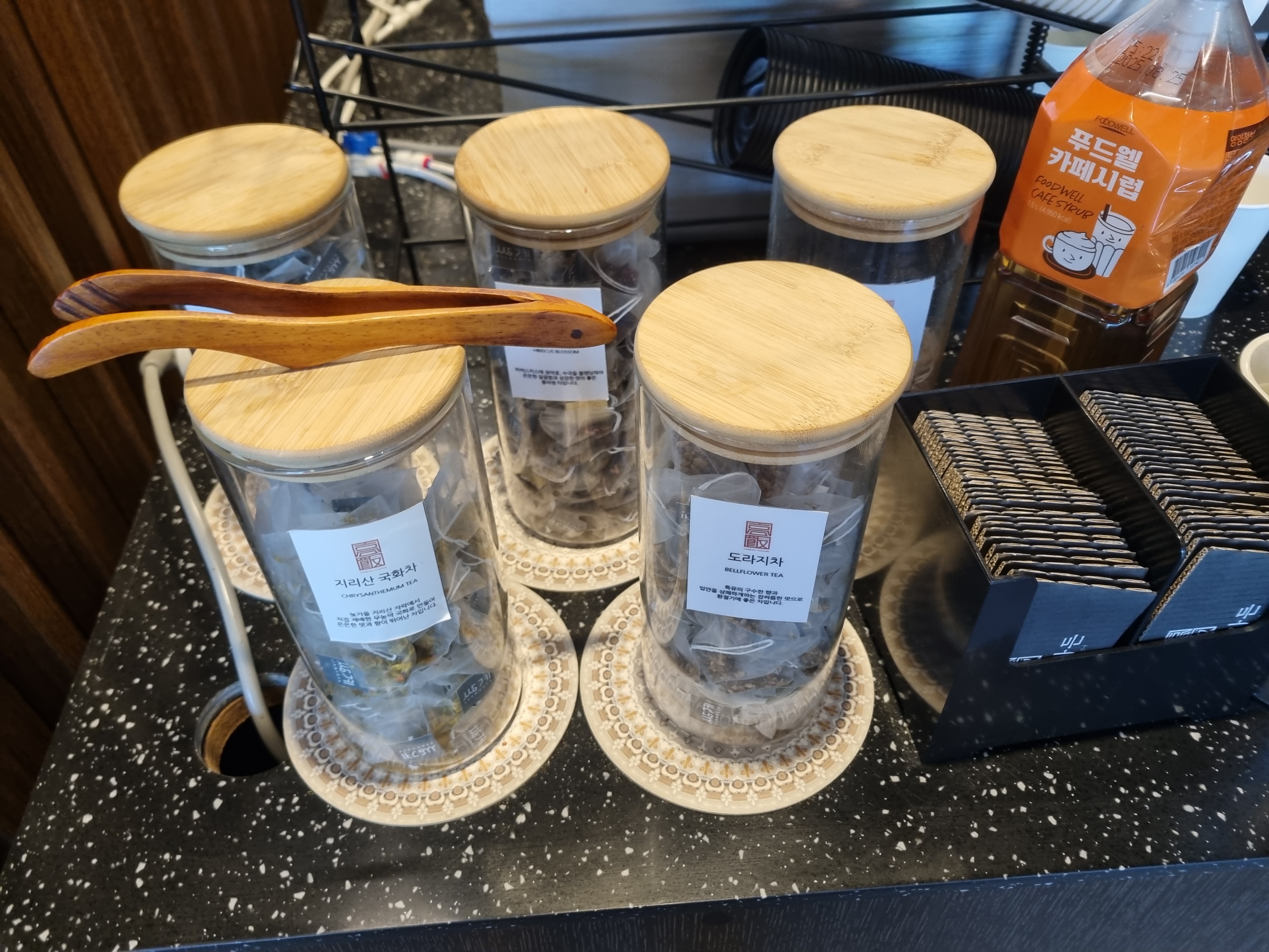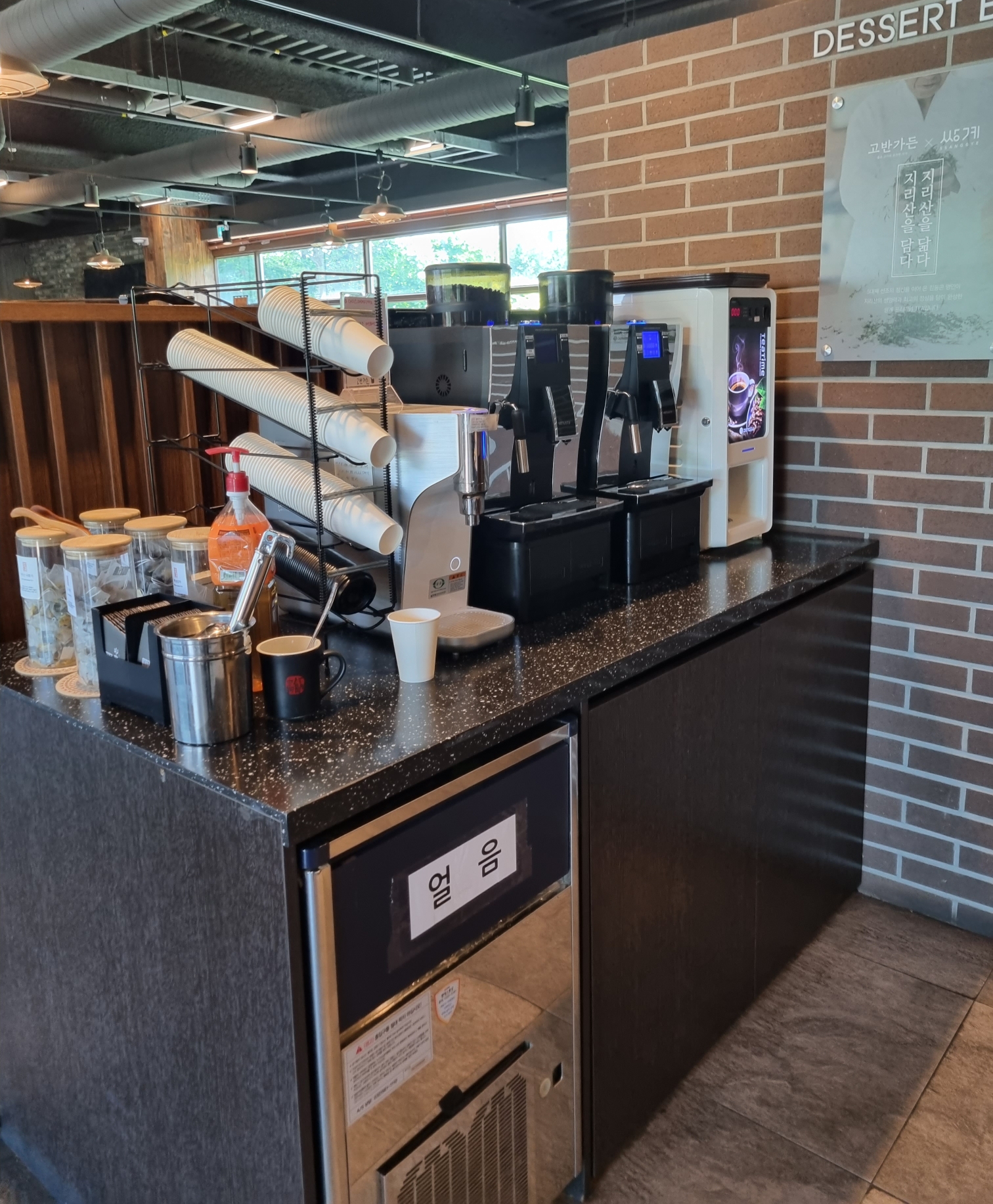커피와 차를 마실 수 있는 셀프코너입니다. 계산대 앞에 있는데 얼음을 꺼내서 직접 아이스아메리카노를 만들어 먹을 수 있어요. 티 종류도 다양하게 있었고 일회용 종이컵과 뚜껑, 홀더까지 구비되어 있었답니다. 아아 한 잔씩 테이크 아웃해서 즐겁게 나왔습니다.