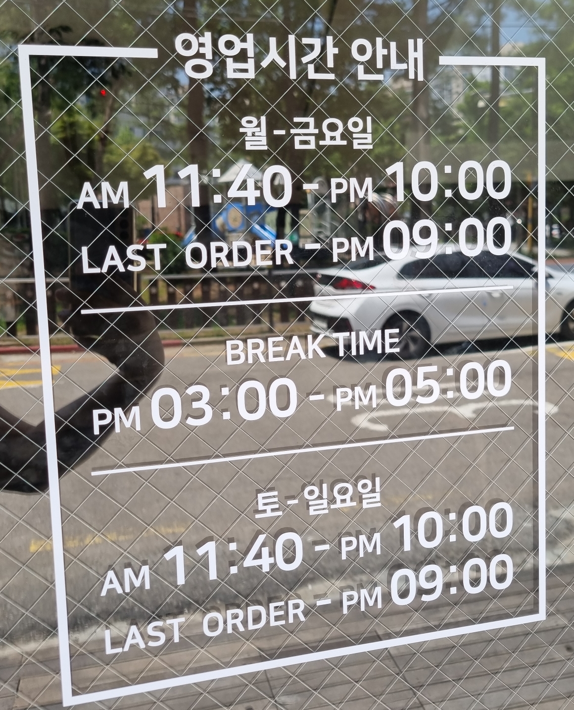 주차장은 건물 아래 널찍해서 좋았어요. 평일 오픈런이라 그랬을 수도 있지만요. 들어가는 입구입니다. 계단으로 2층식당에 갑니다. 분위기 깨끗하고 정갈해요. 영업시간은 11시 40분 ~ 22시 (라스트오더 9시)입니다. 브레이크타임은 15시 ~ 17시입니다. 2층은 홀이고 3층은 룸이네요. 가족모임 같은 건 3층에서 하는 거 같아요.