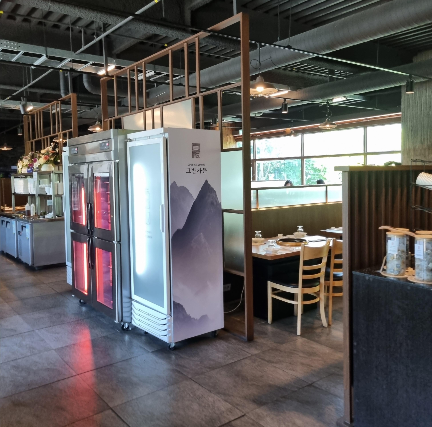 2층 들어가니 넓은 홀이 있어요. 들어가는 길에 냉장고가 있네요. 고기가 저 안에서 숙성 중인 걸까요?