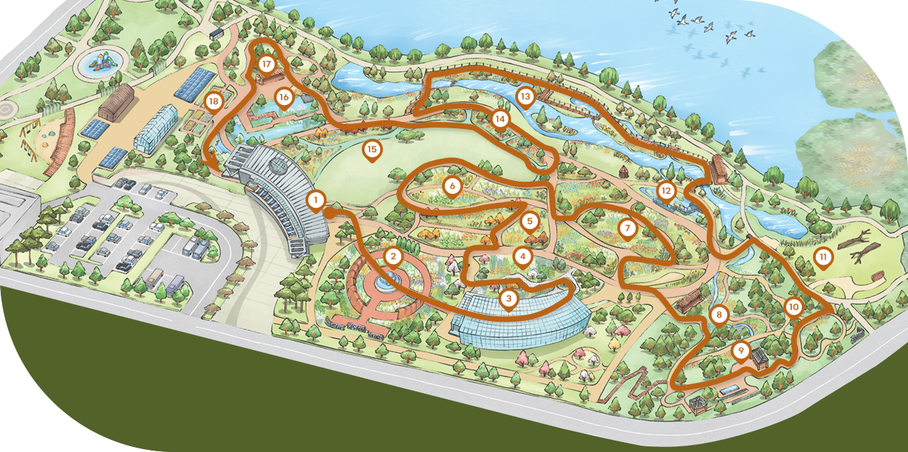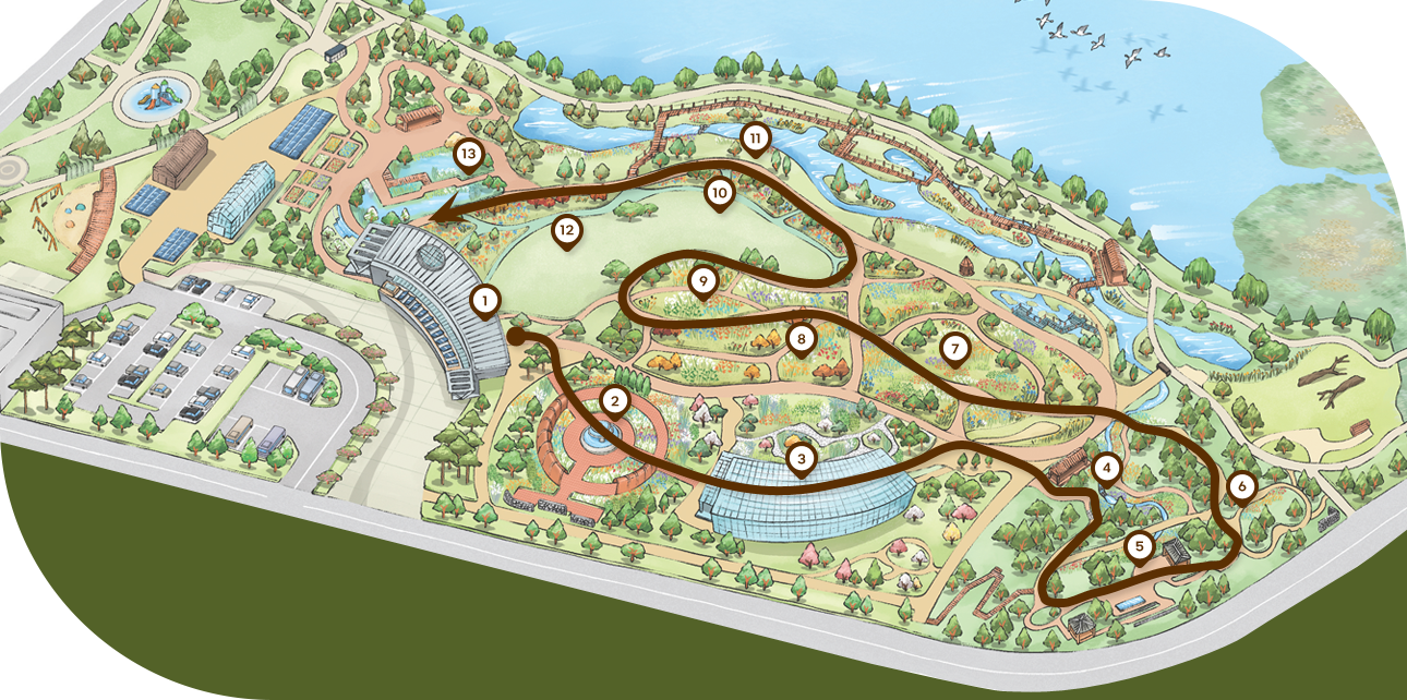 코스 01은 '쉬엄쉬엄 남녀노소 산책길'로 1.2km로 약 45분 코스입니다. 방문자센터 1층 입구로 입장해서 시계 반대방향으로 돌고 오는 코스로 가장 짧은 코스입니다. 2번 장식정원을 거쳐 3번 전시온실을 지나 4번 숲정원, 5번 다산정원, 6번 침엽수원, 7번 초지원, 8번 관목원, 9번 그리스원, 10번 겨울정원, 11번 습지원, 12번 잔디광장, 13번 빗물정원을 거쳐 나오는 코스입니다.