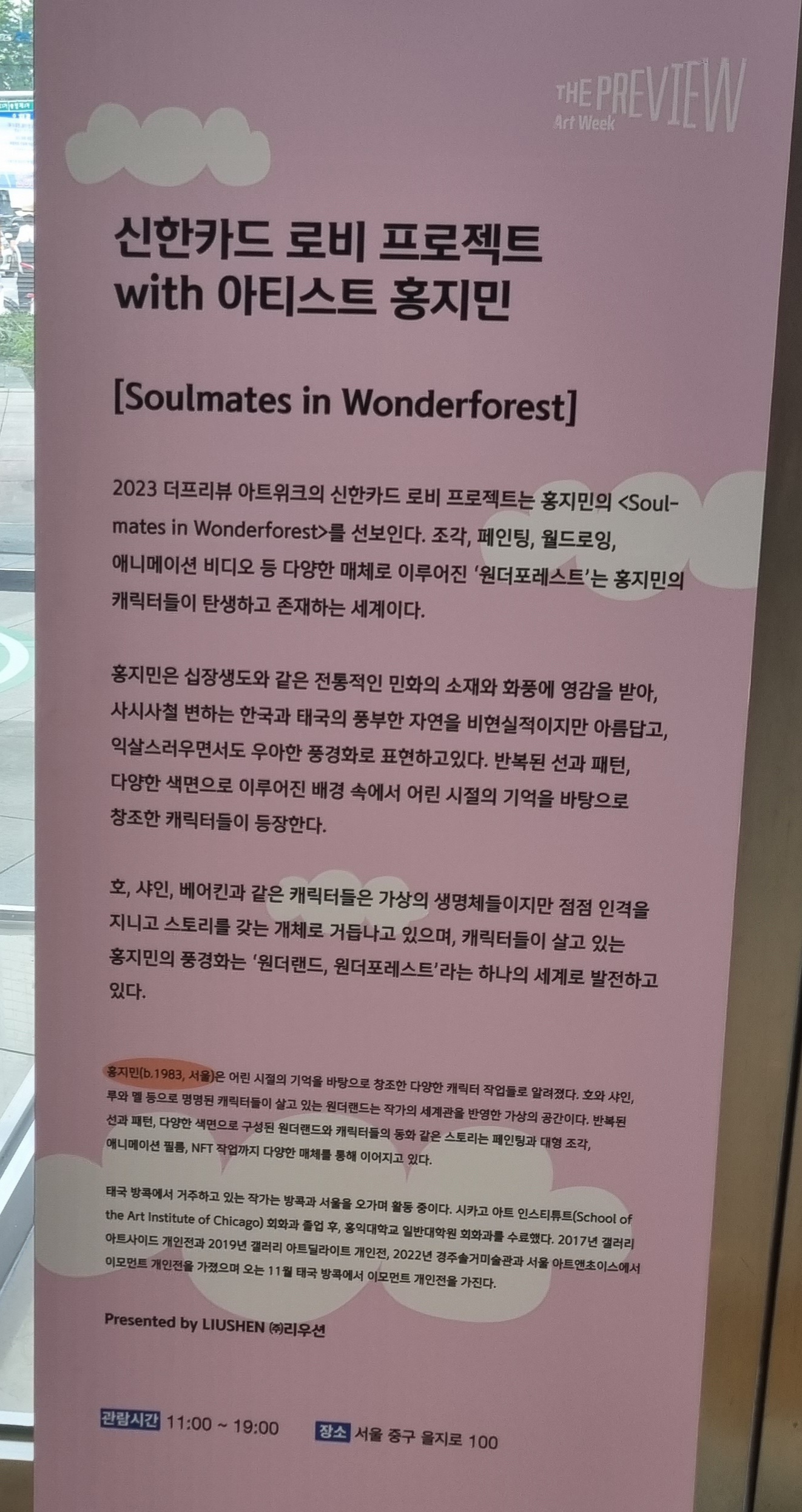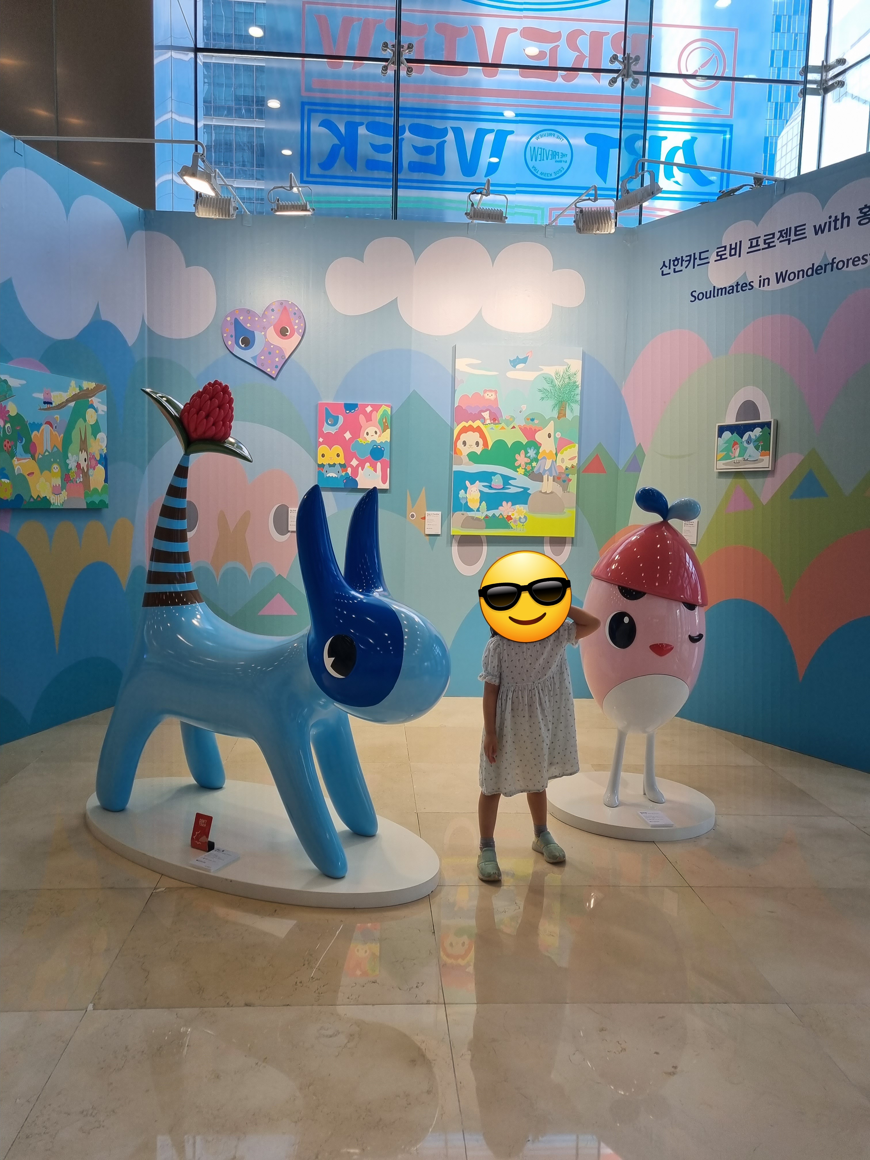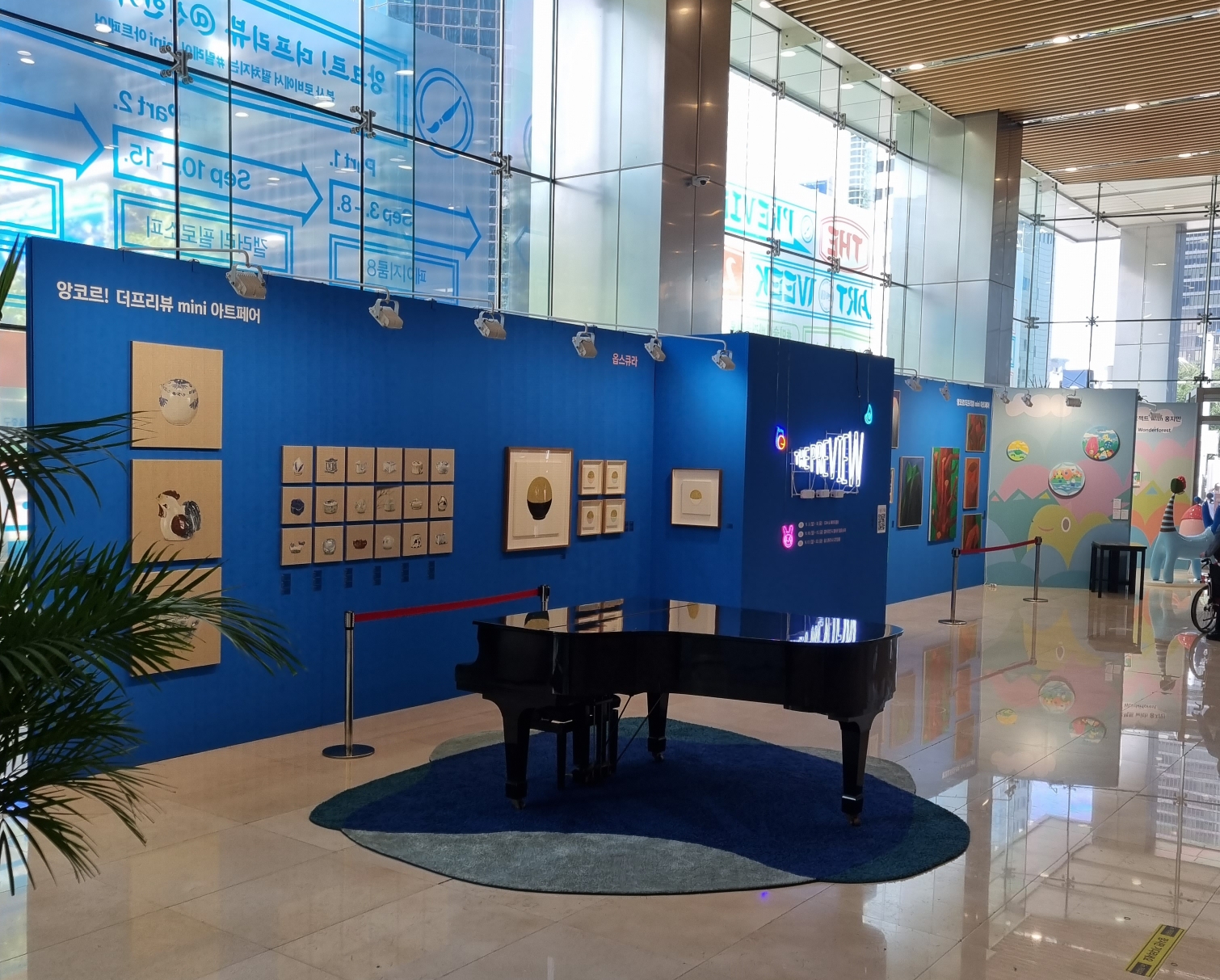 서울 가볼만한 곳으로 무료 전시회 추천합니다. 을지로3가역에 있는 파인애비뉴에는 신한카드 본사가 있습니다. 파인애비뉴는 A동과 B동이 있는데 폴바셋 있는 건물이 A동 로비에서 더프리뷰가 진행되고 있어요. 이곳 로비는 늘 범상치 않은데 9월이 되니 눈이 즐거운 공간으로 변신해 있었습니다.