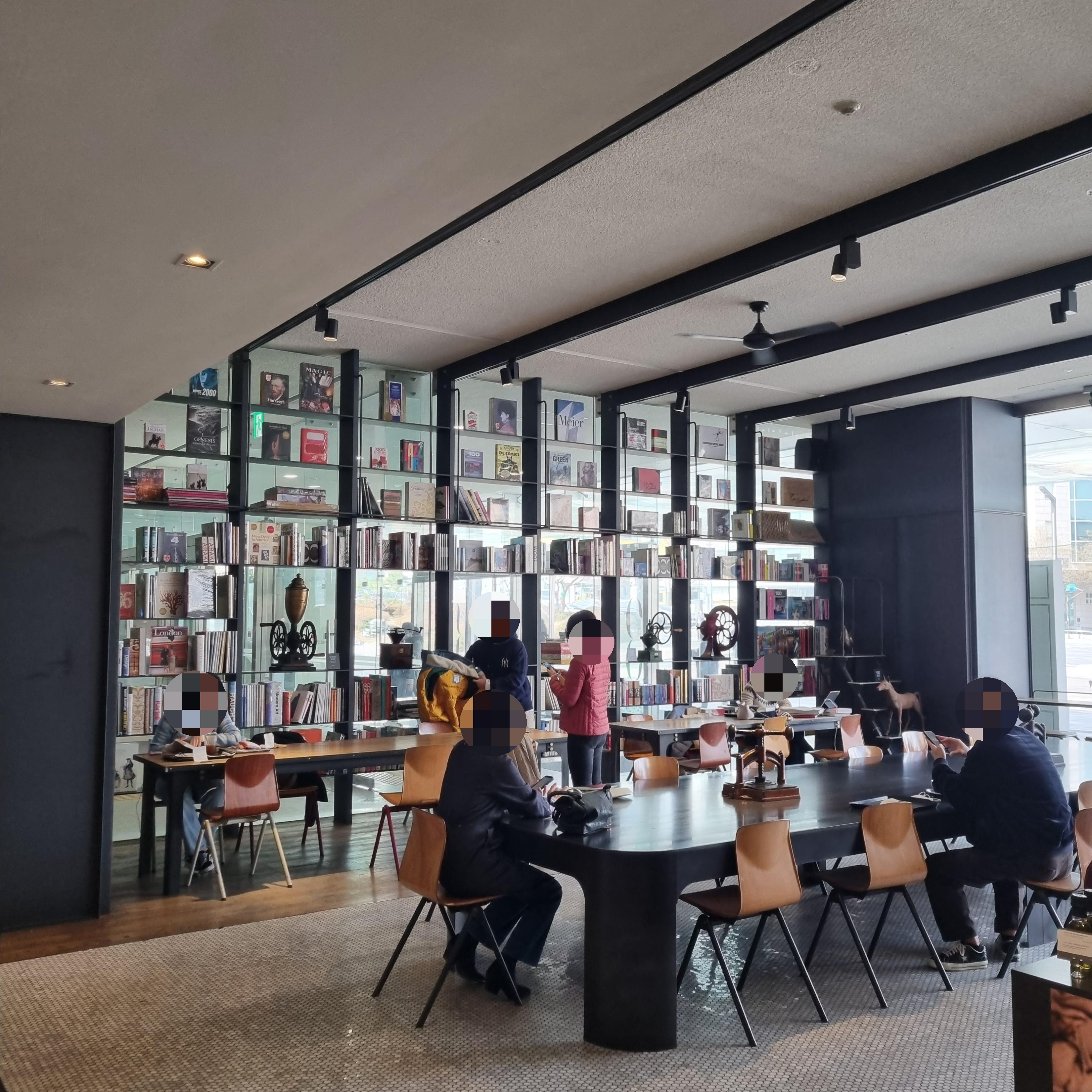 왼쪽 사진의 왼쪽이 출입구입니다. 사진에 담기지 않았지만요. 그리고 음료를 주문하는 카운터가 보입니다. 정면으로는 테이블이 있습니다. 통창을 따라 서적을 전시해 두어 카페 분위기를 연출해 두었습니다. 작은 테이블이 여러 개 있는 배치가 아니라 큰 테이블이 배치된 특징이 있습니다. 같이 온 일행이 아니어도 테이블에 띄엄띄엄 앉는 분위기입니다.