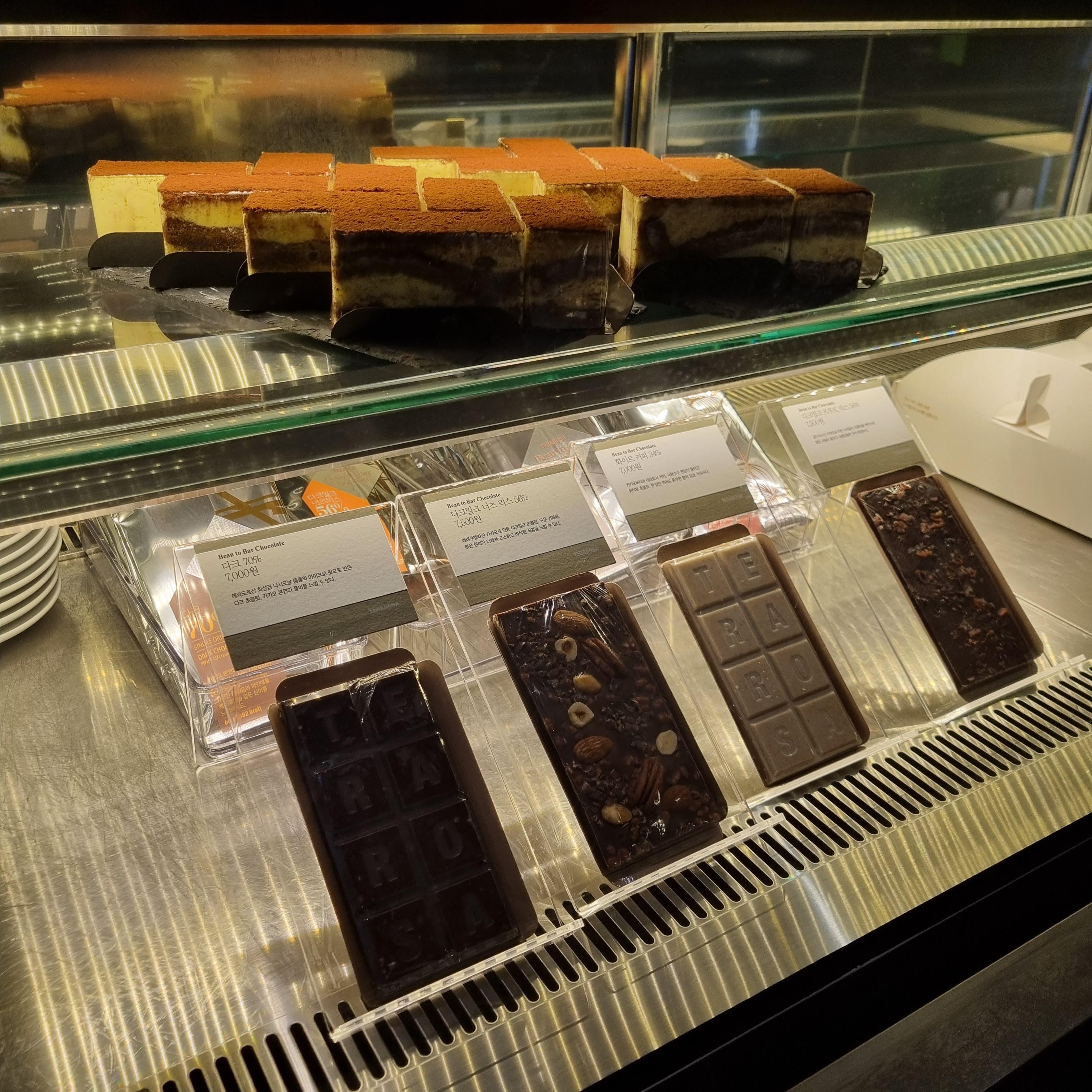 카운터에 서 디저트도 고를 수 있습니다. 여기 쿠키 맛있습니다. 여럿이 오면 하나라서 사서 쪼개서 맛을 보곤 했지요. 제가 좋아하는 것은 테라로사의 퀸아망인데 이날 없었던 것인지, 제가 사진을 안 찍은 것인지 사진에서 안 보이네요. 다양한 초콜릿과 케이크를 판매합니다.