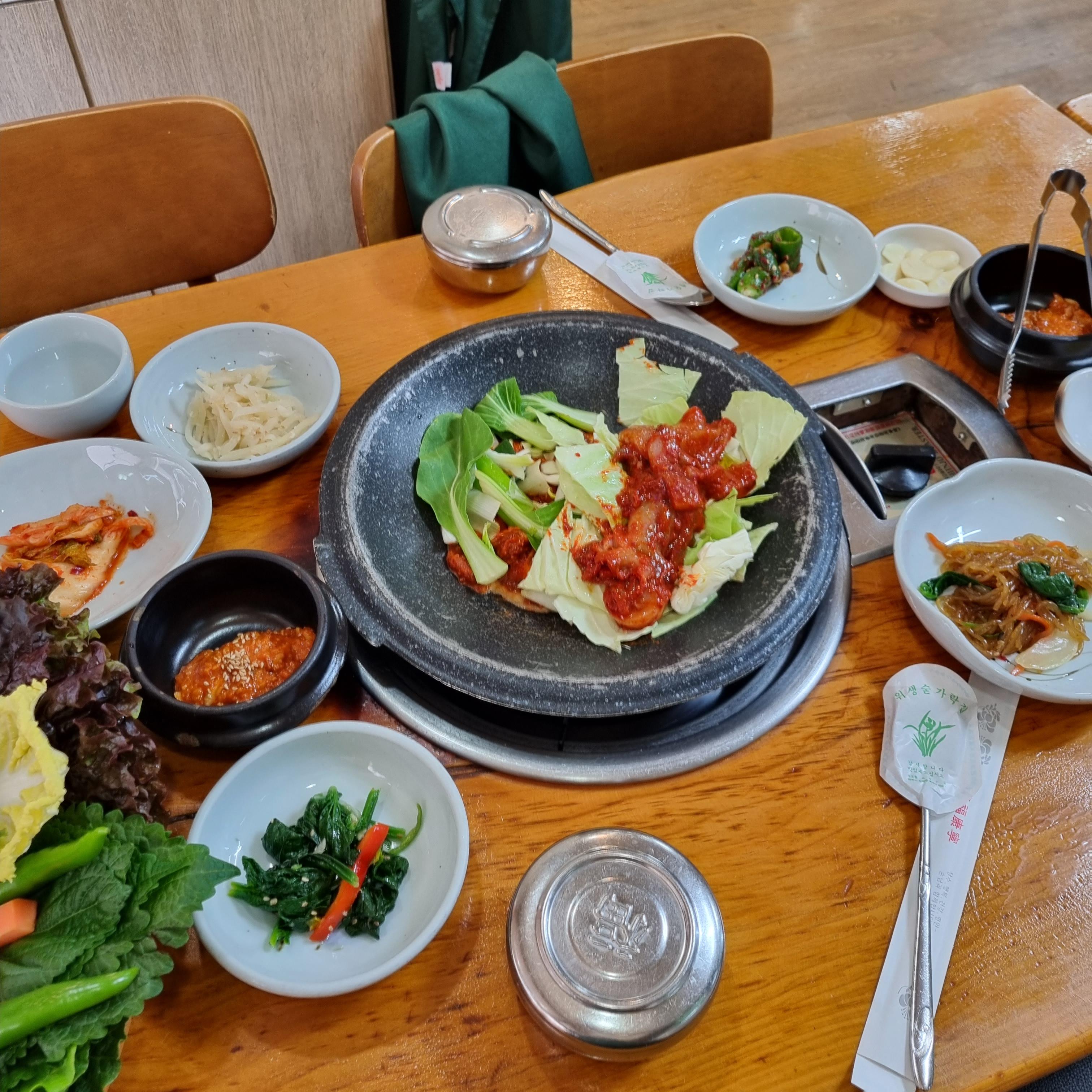자리에서 볶을 때 사방으로 튀니 앞치마 필수예요. 잡채를 비롯한 반찬도 맛있고 저녁에는 차돌박이랑 쌈야채 먹을 수도 있고, 삼겹살도 쌈야채랑 먹을 수 있는데 다 맛있답니다. 건강한 한식이 생각나면 시골집 가보세요. 내돈내산, 그리고 회사가 사준 후기예요.
