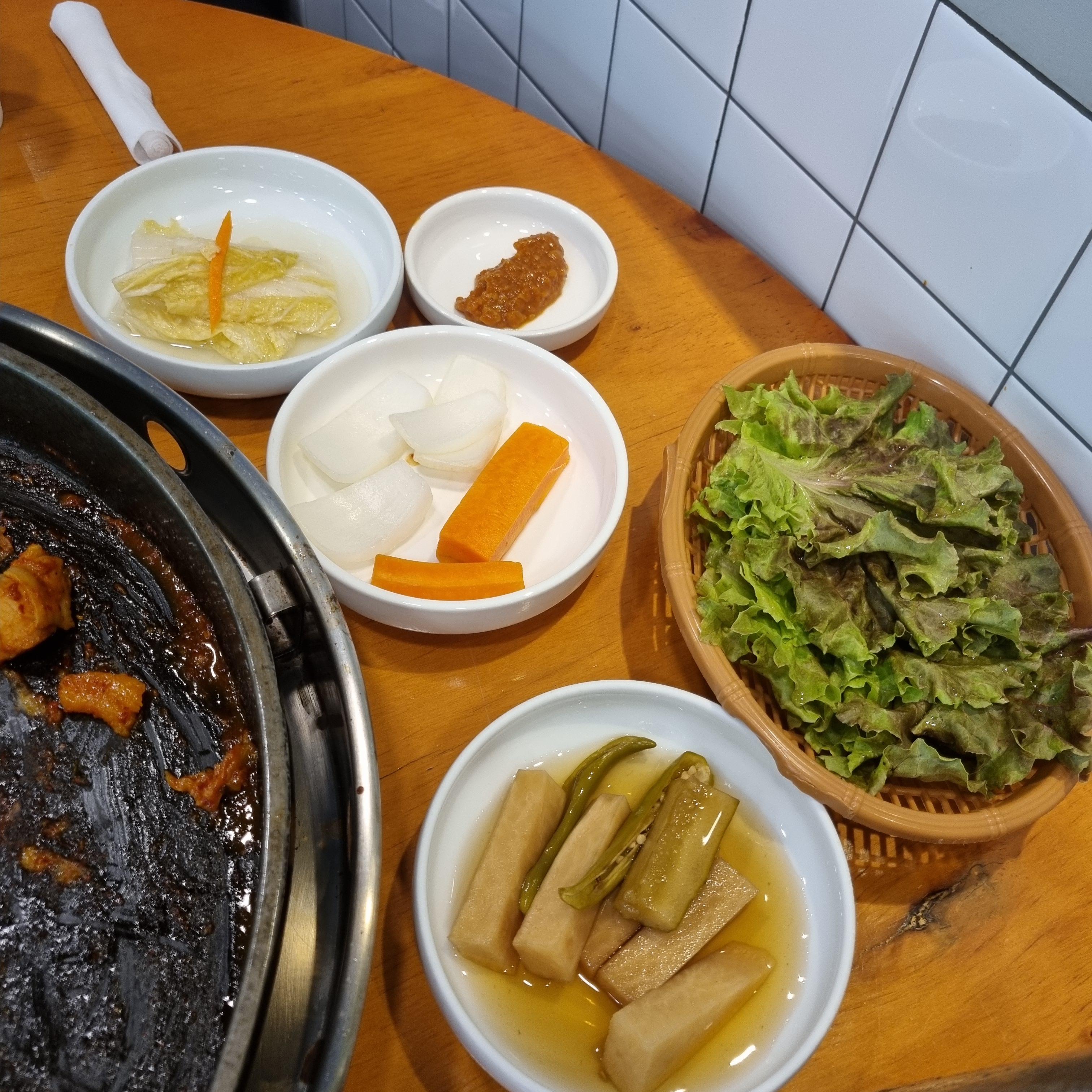 기본적으로 상추, 생양파, 당근, 초절임(무, 고추, 오이), 백김치, 쌈장을 주시더라고요.