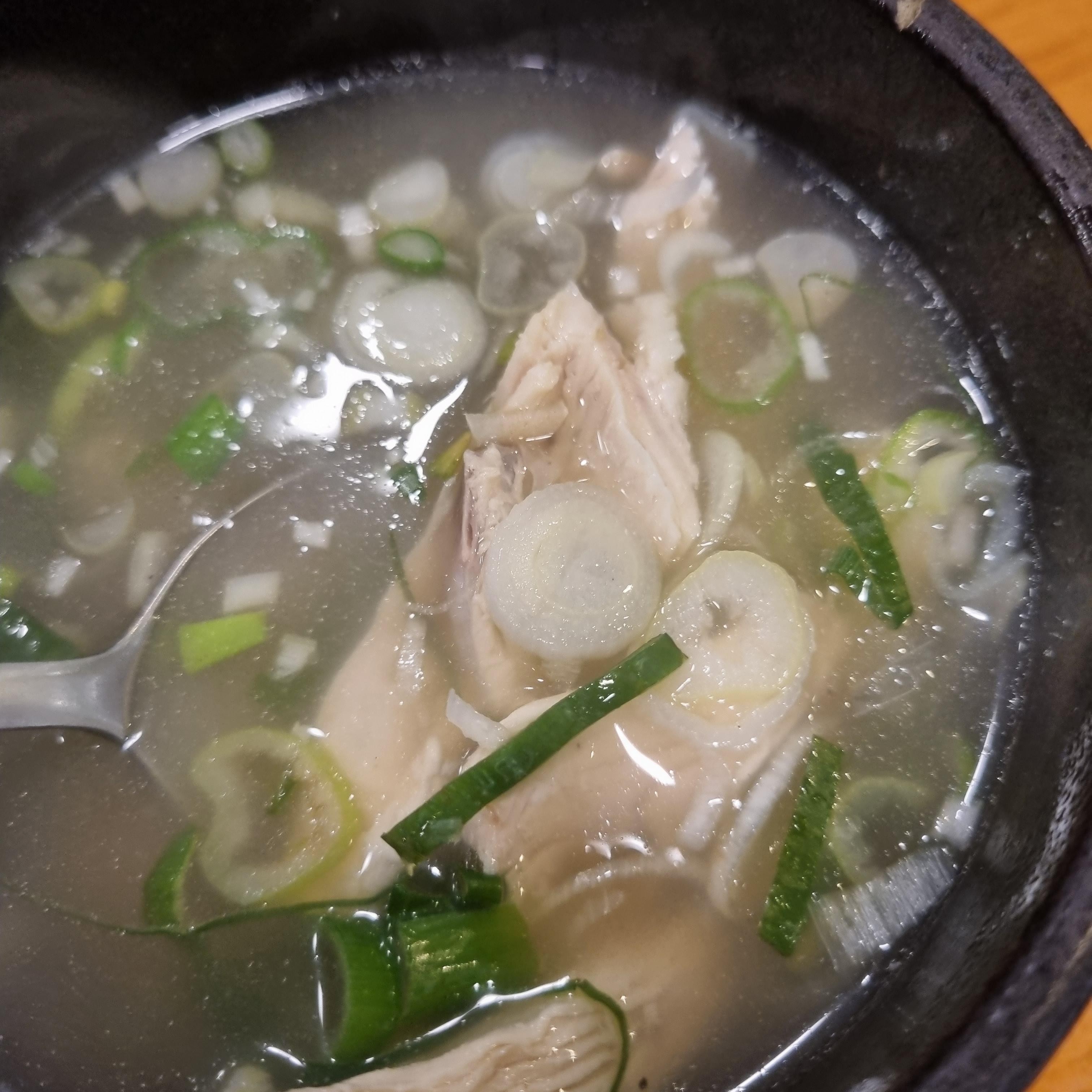 개인별로 닭곰탕 주시는데 꽤 괜찮았어요. 파는 가득 동동 띄워주셨지요. 국 안에 보면 닭이 있어요. 살만 있기 때문에 먹기 편해요.