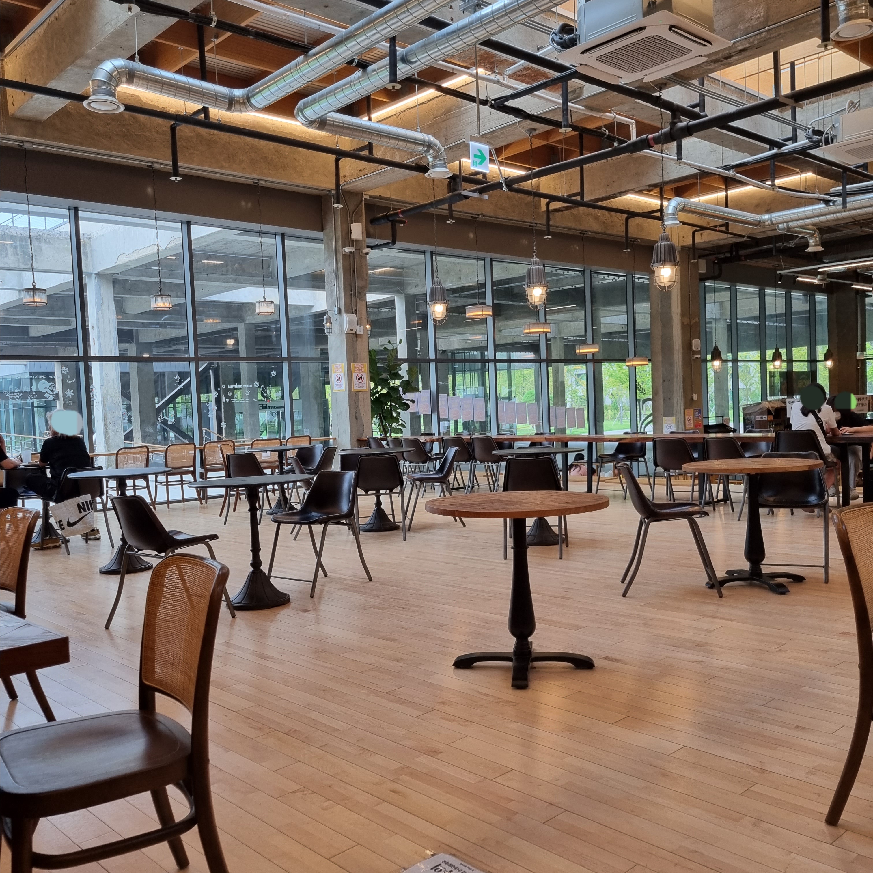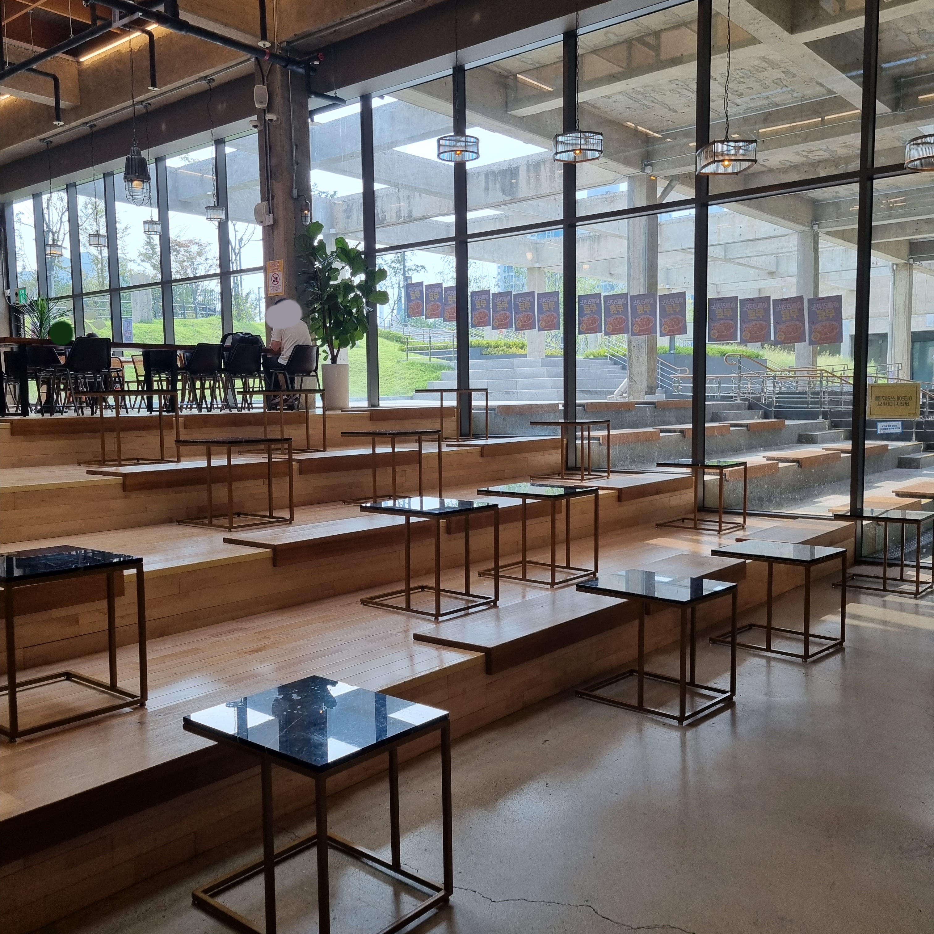 계단식 테이블은 감각적인 공간이지만 오래 앉아 있을 수 없다는 단점이 있습니다. 엉덩이가 아파요.