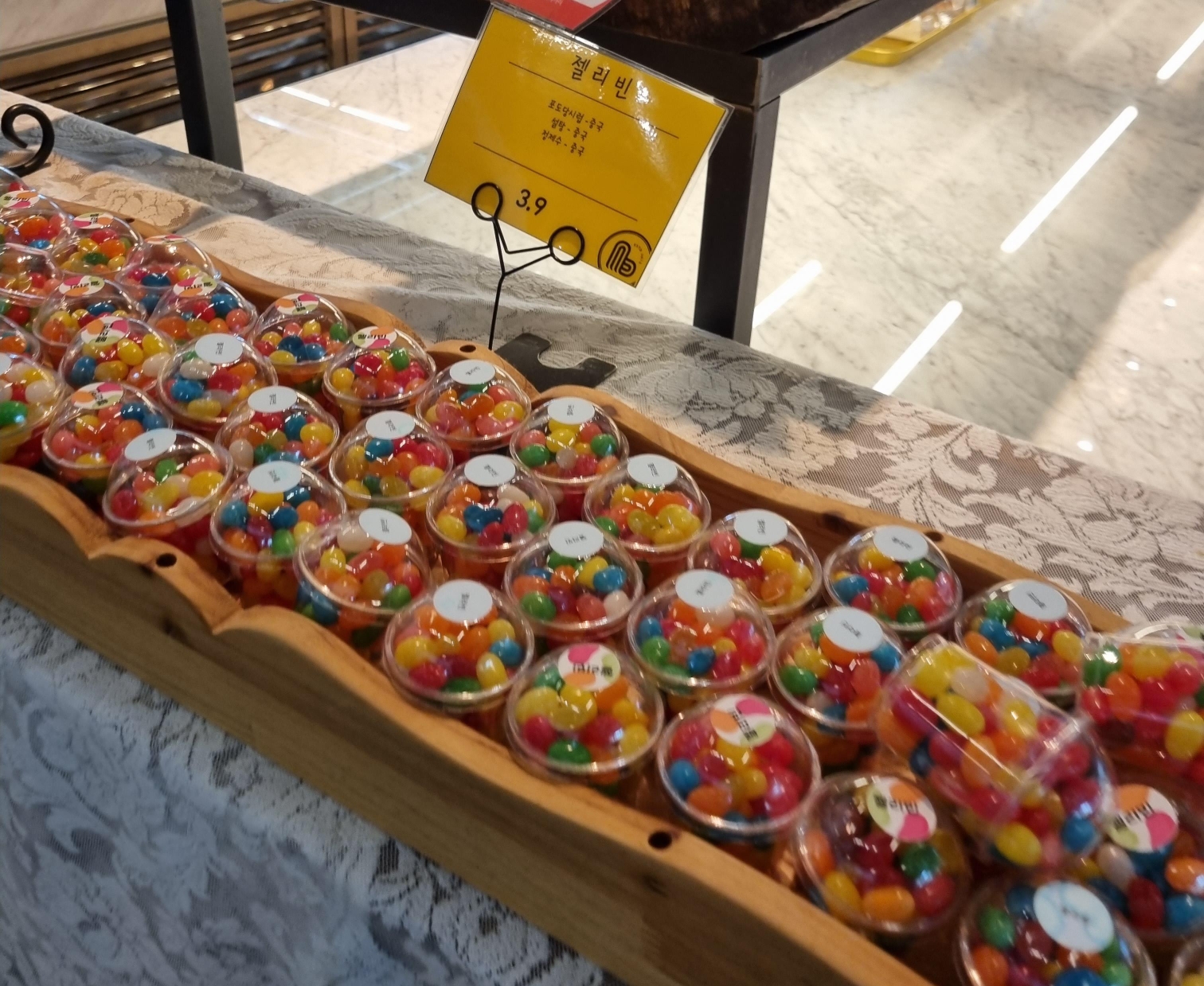 문을 열고 들어가면 계단식으로 된 테이블이 보이고 왼쪽으로 진열대가 있습니다.