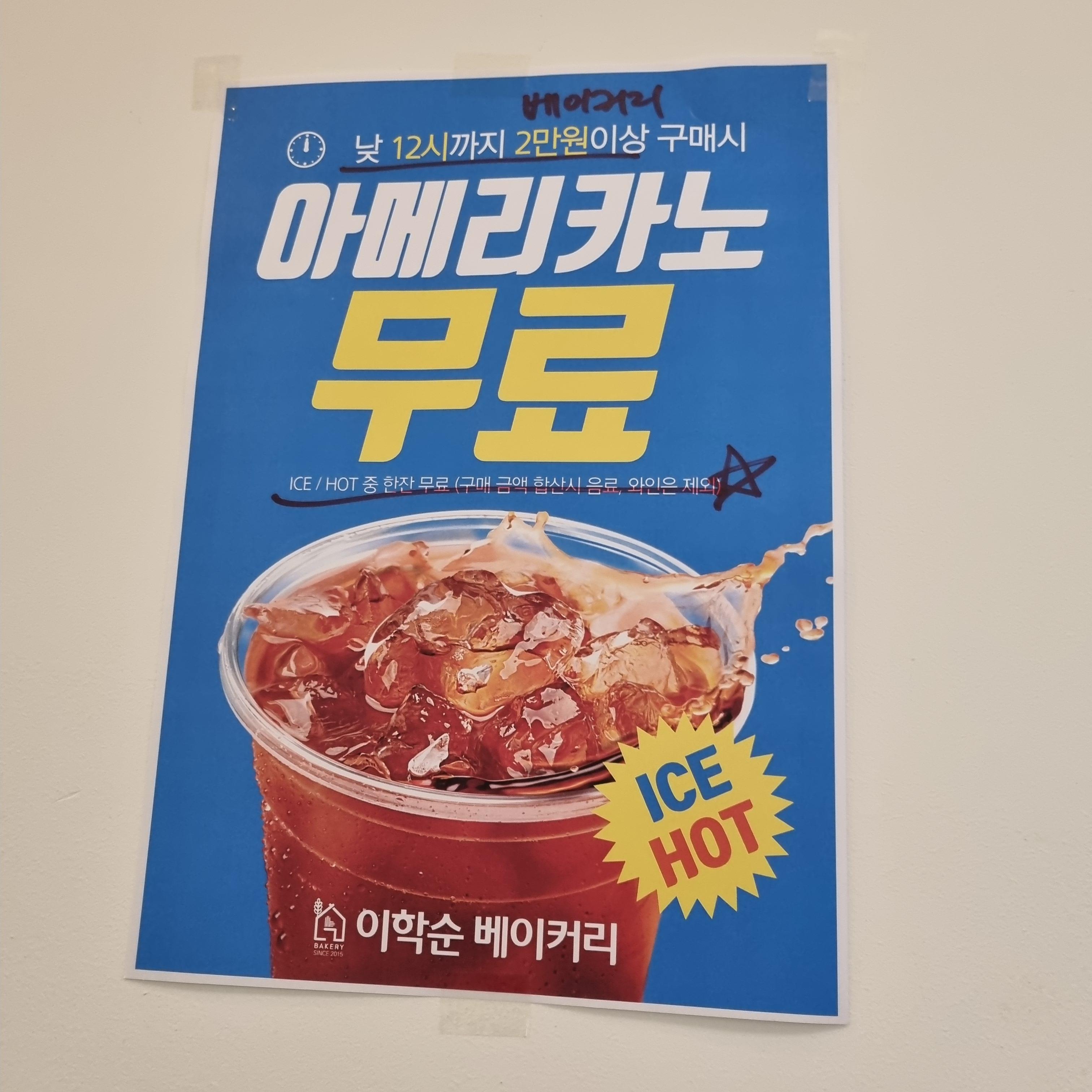낮 12시 이전에 음료와 와인을 제외하고 2만 원 이상 베이커리를 구매하면 아메리카노 한 잔 무료행사 중이네요.