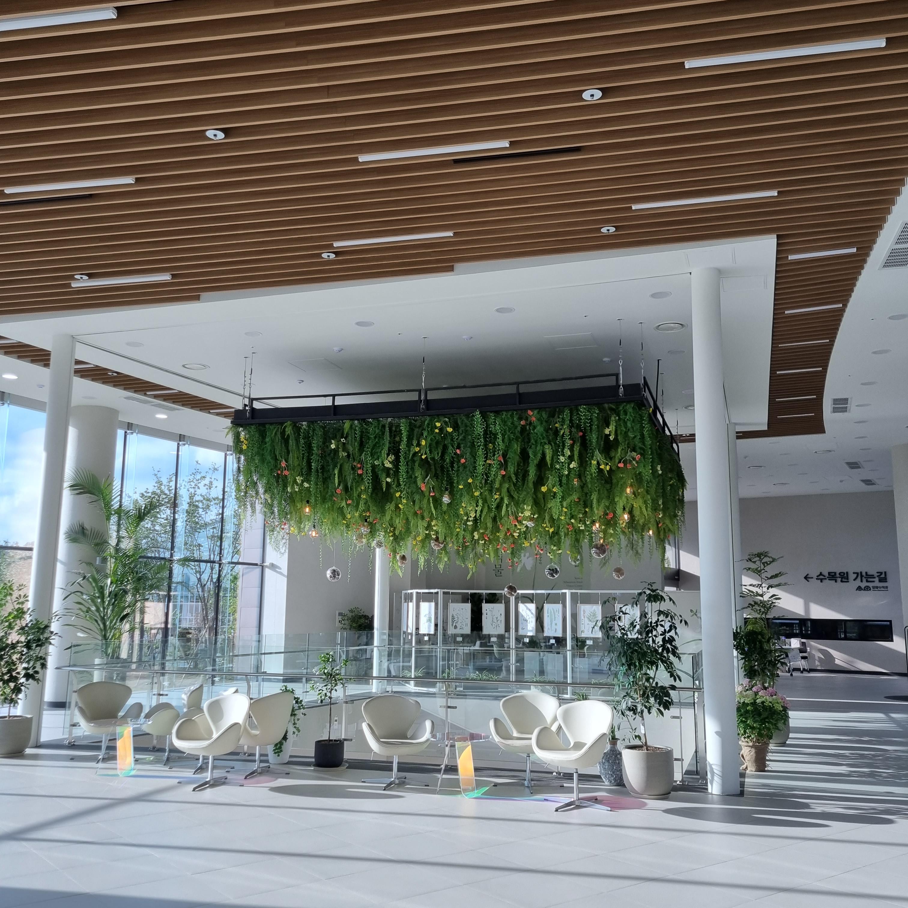센터에 들어서니 정면이 통창입니다. 수목원 뷰가 아름답습니다. 날씨가 맑으면 더 예쁘답니다. 아름다운 경치를 즐길 수 있도록 창가에는 의자와 테이블이 있습니다.