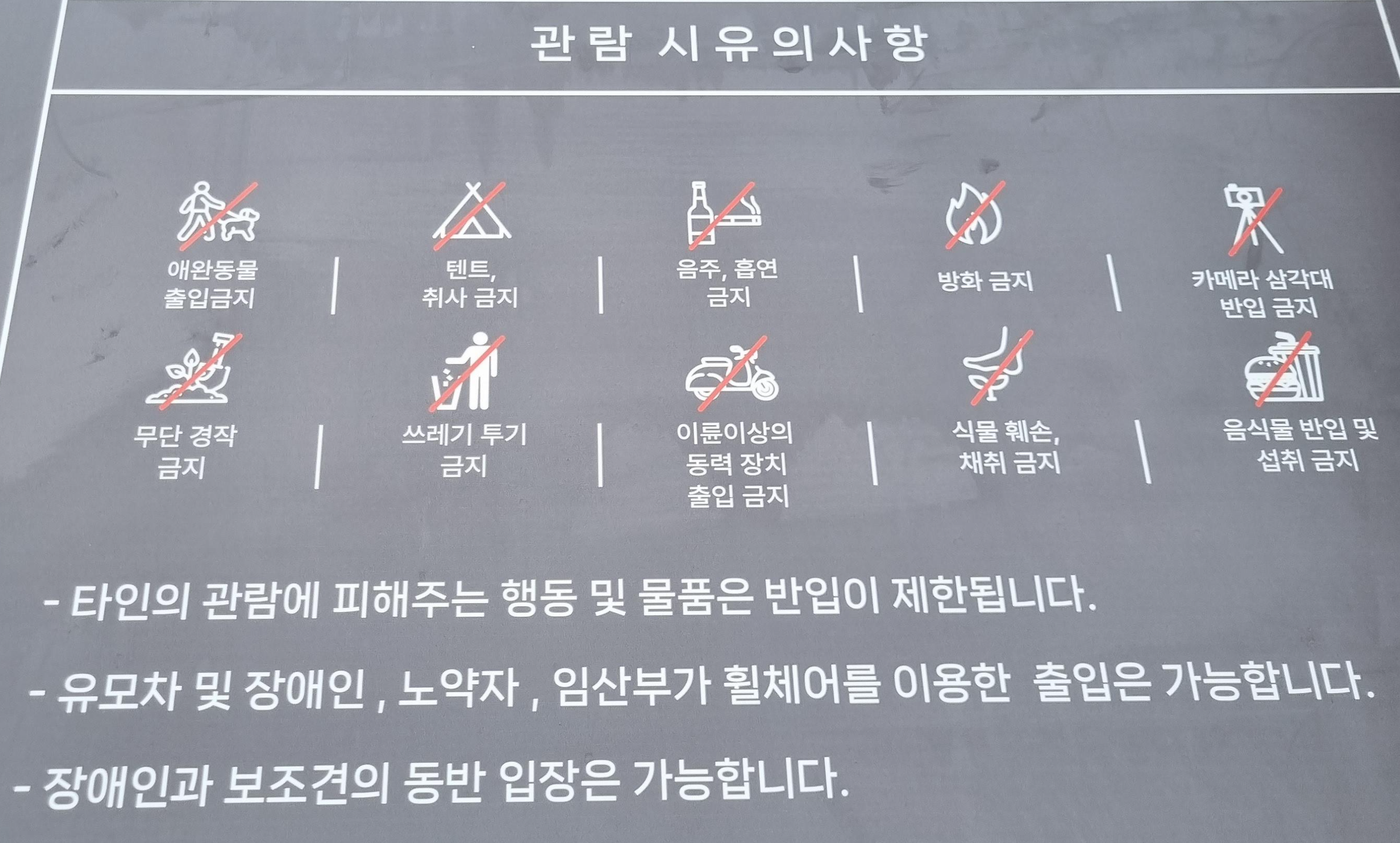 관람 시 유의사항 은 위 사진을 참고해 주세요. 금지되는 것이 많습니다. 음식물 반입 및 섭취, 텐트 및 취사, 애완동물 출입 모두 불가합니다.