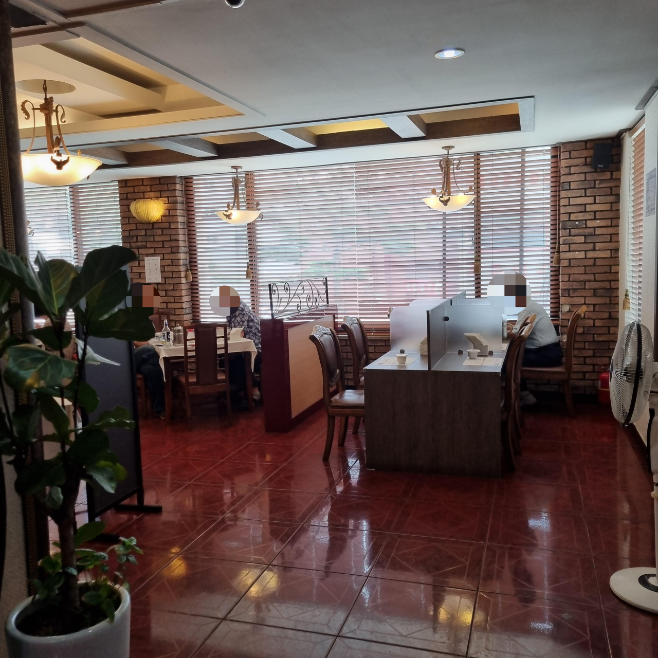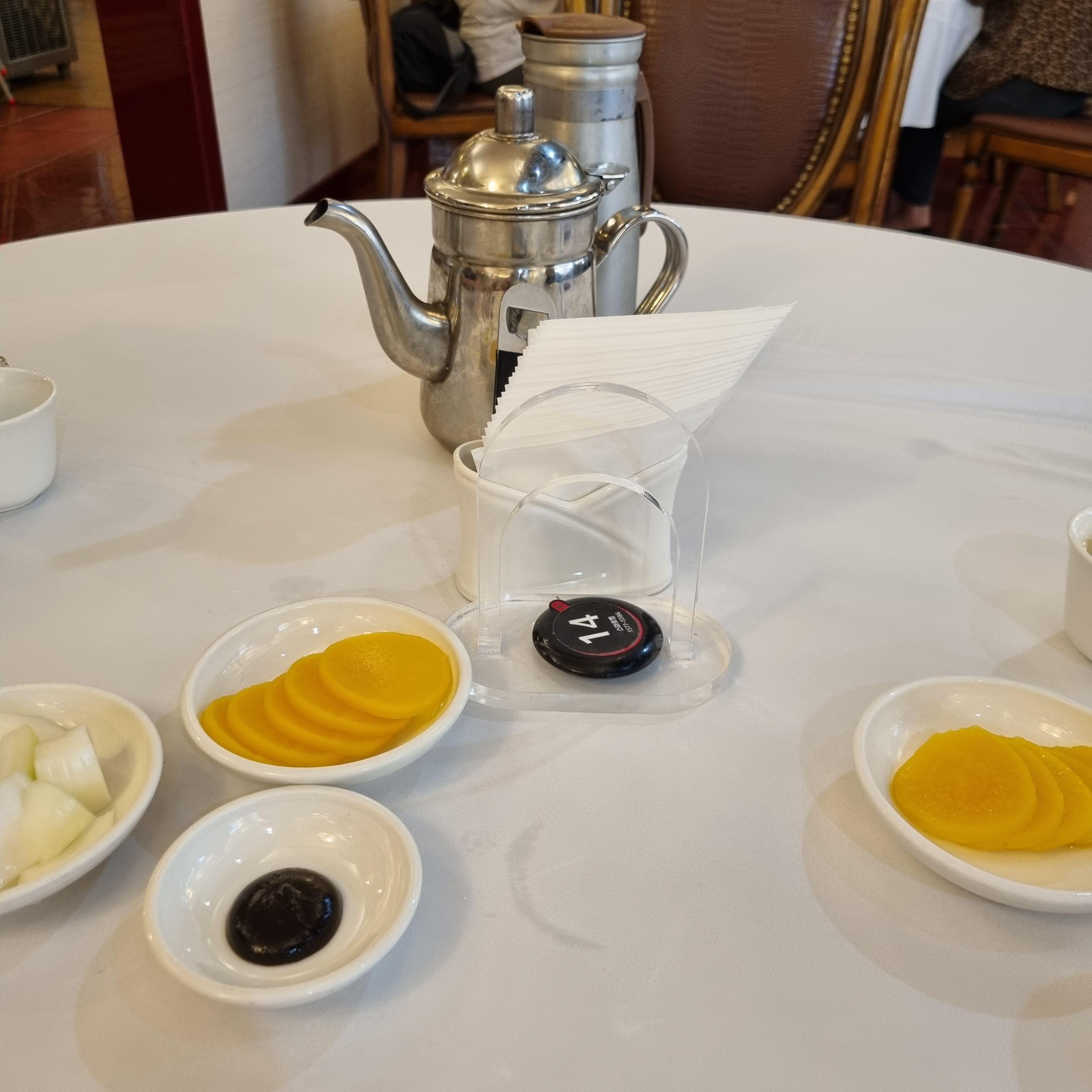 2층 전체 사진을 담고 싶었지만 식사하는 분들이 너무 많아 찍지 못했습니다. 왼쪽 사진은 2층 입구 정면 맞은편입니다. 밥을 먹고 나올 때쯤 정리되어 남아 있는 테이블을 찍었습니다. 식당 전체적으로 둥근 테이블 또는 네모 테이블로 세팅이 되어 있었습니다. 그리고 테이블보를 깨끗한 것으로 깔아 주셨고 손님이 빠질 때마다 교체하시는 모습을 볼 수 있었습니다.