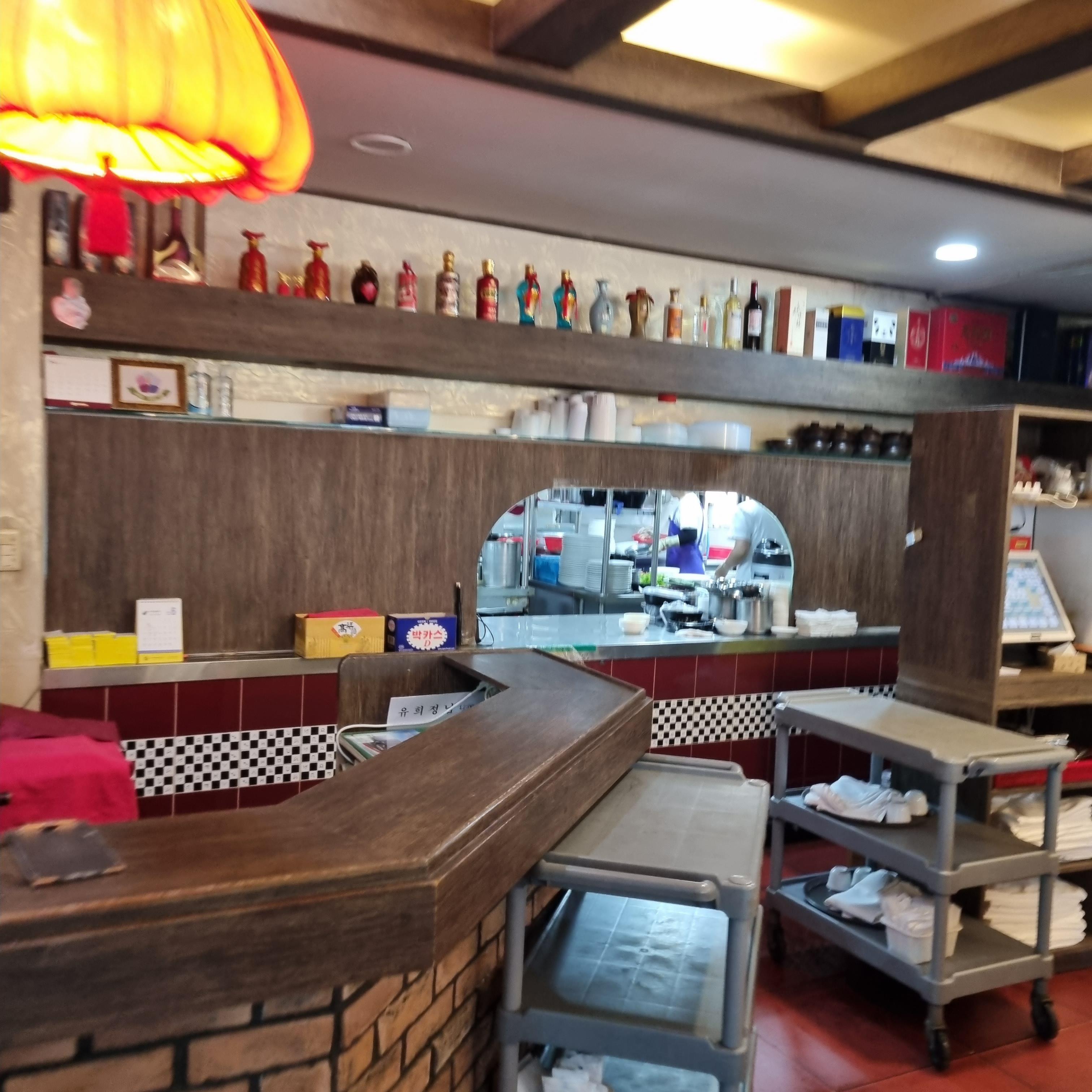 2층 식당 문을 열고 들어서면 정면에 각종 술병과 함께 장식이 되어 있습니다. 왼쪽으로는 카운터가 보입니다. 카운터 옆쪽으론 주방이 보입니다. 그리고 오른쪽으로는 1인석이 보입니다. 1인석은 일반 6인석 테이블에 개인 칸막이를 친 것입니다. 한 분이 식사하고 계셨는데, 창을 보고 일렬로 먹는 1인석 구조보다 별로라는 생각이 들었습니다. 혼밥도 잘하는 저이지만 혼자 와서 저 위치에서 먹고 싶지는 않다는 생각이 들었답니다.