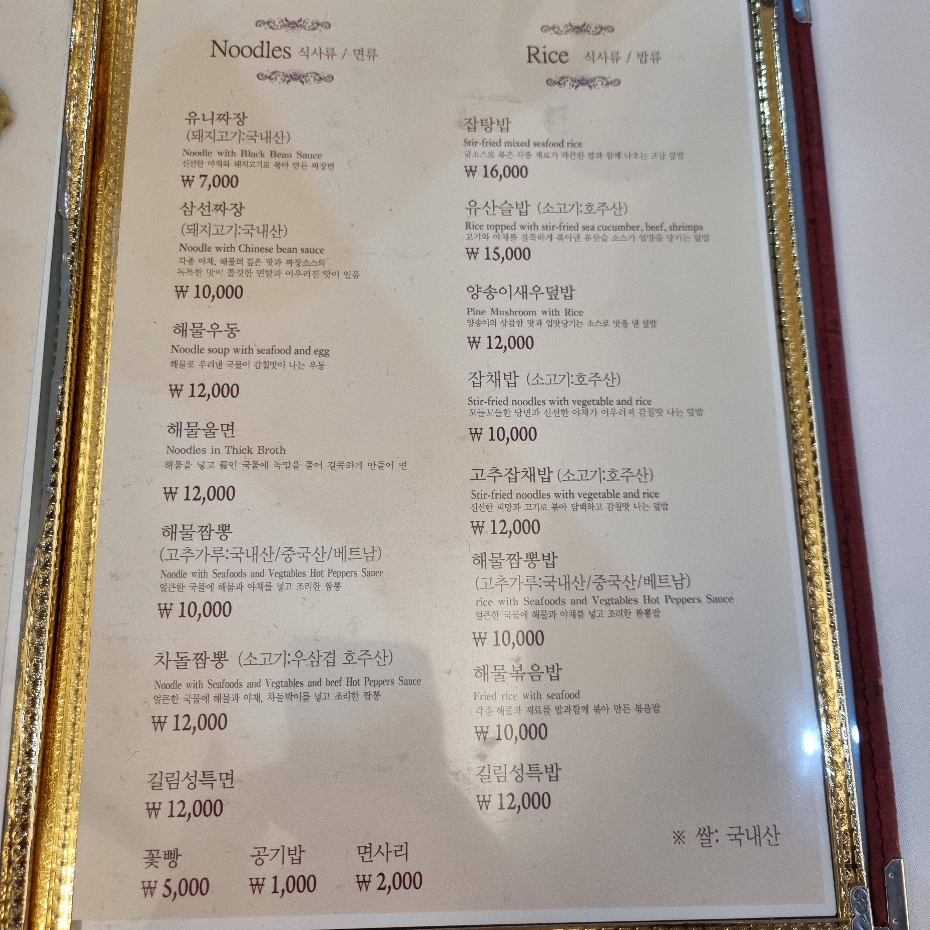 길림성 메뉴판입니다. 다 찍으면 좋겠지만 짜장면 있는 페이지만 찍어왔습니다. 식사류로 면류와 밥류가 소개된 페이지입니다. 해물우동, 해물울면, 해물짬뽕, 차돌짬뽕, 길림성 특면, 잡탕밥, 유산슬밥, 양송이 새우덮밥, 잡채밥, 고추잡채밥, 해물짬뽕밥, 해물볶음밥, 길림성특밥이 있습니다. 길림성특면이 무엇인지 궁금해집니다.