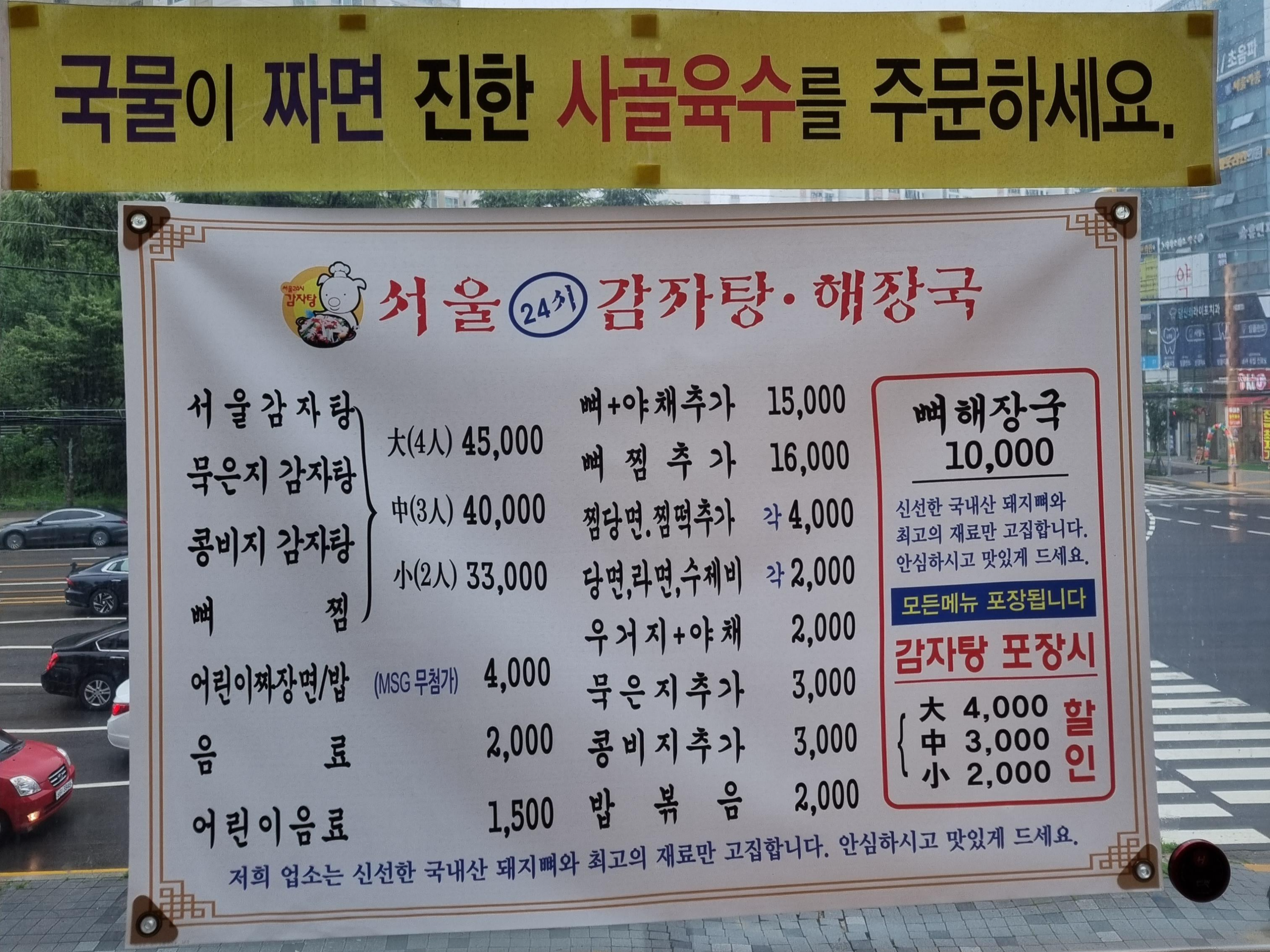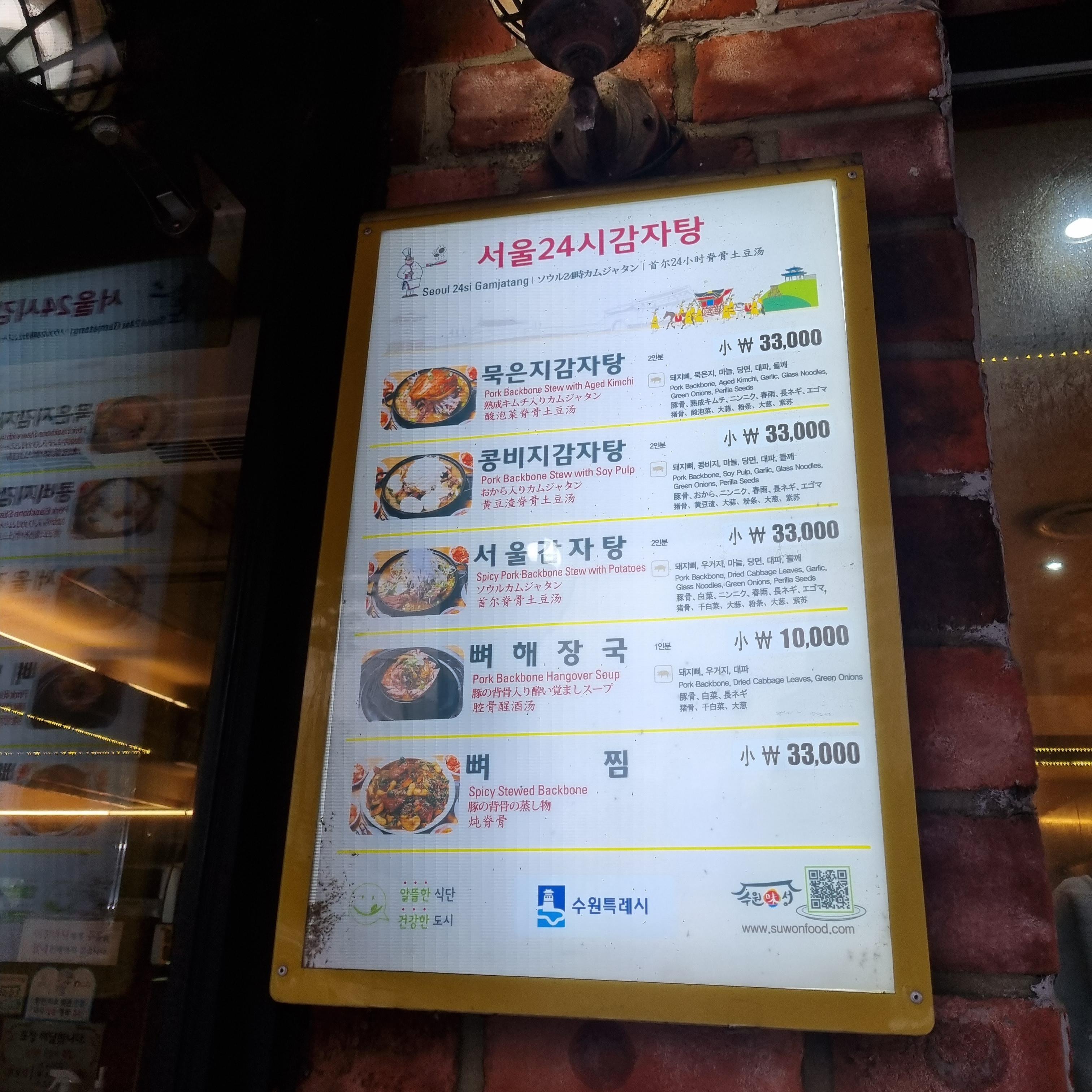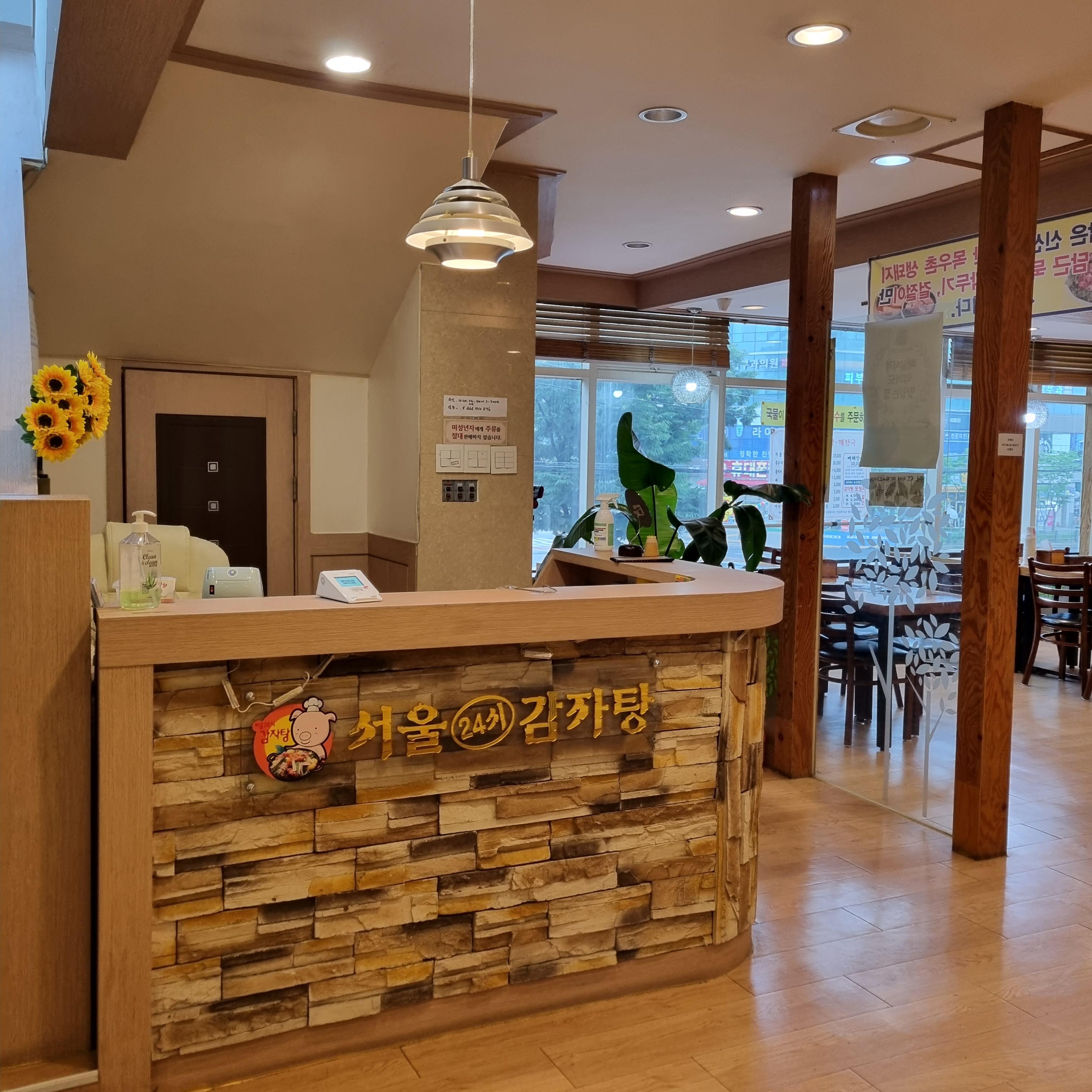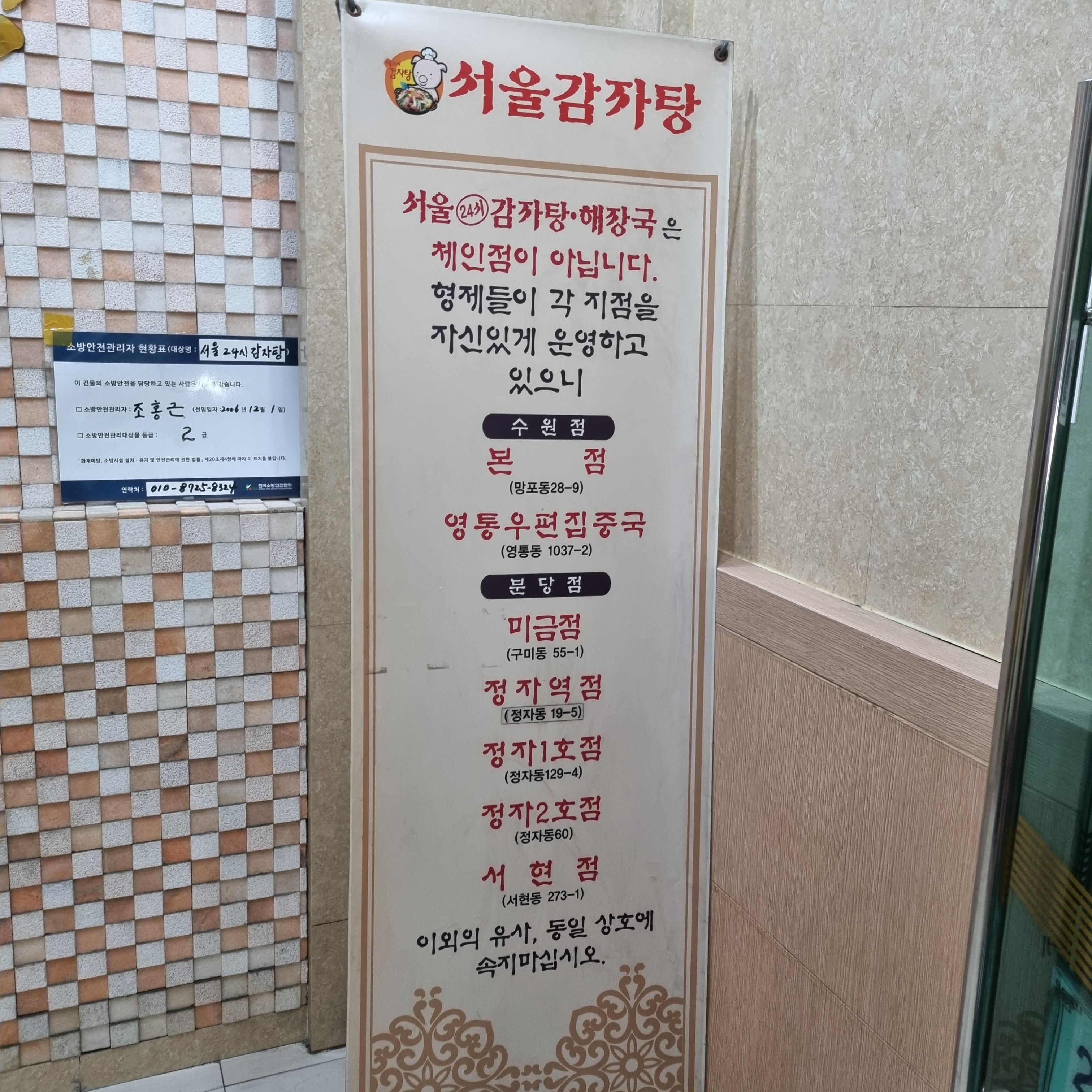 서울24시감자탕해장국집은 체인점이 아니라고 합니다. 형제들이 각 지점을 운영하고 있다고 유사한 상호에 속지 말라고 안내되어 있네요. 저희가 간 곳은 수원점 본점입니다. 음식점 이름은 24시인데 야간 브레이크 타임이 새벽 5시부터 6시까지 있습니다. 이용에 참고해 주세요.